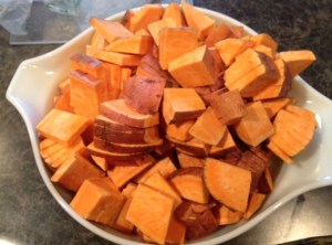 - Chop the sweet potato into small squares and cover with water in a pan and boil until tender.