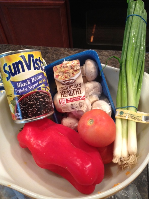 - Chop finely the tomato, pepper and green onion and toss in with the beans.