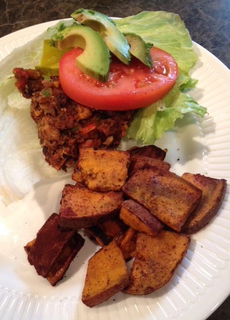 So my take on the Southwest Veggie Burger is below…and mainly I did it this way because I didn’t have some of the ingredients (like the binding brown rice!). I also love baked sweet potatoes, or any sweet potato with cinnamon on it, so I made a large batch to take as my fries for my lunches. This batch made me six large burgers and eight servings of fries at about 1 cup per my serving.