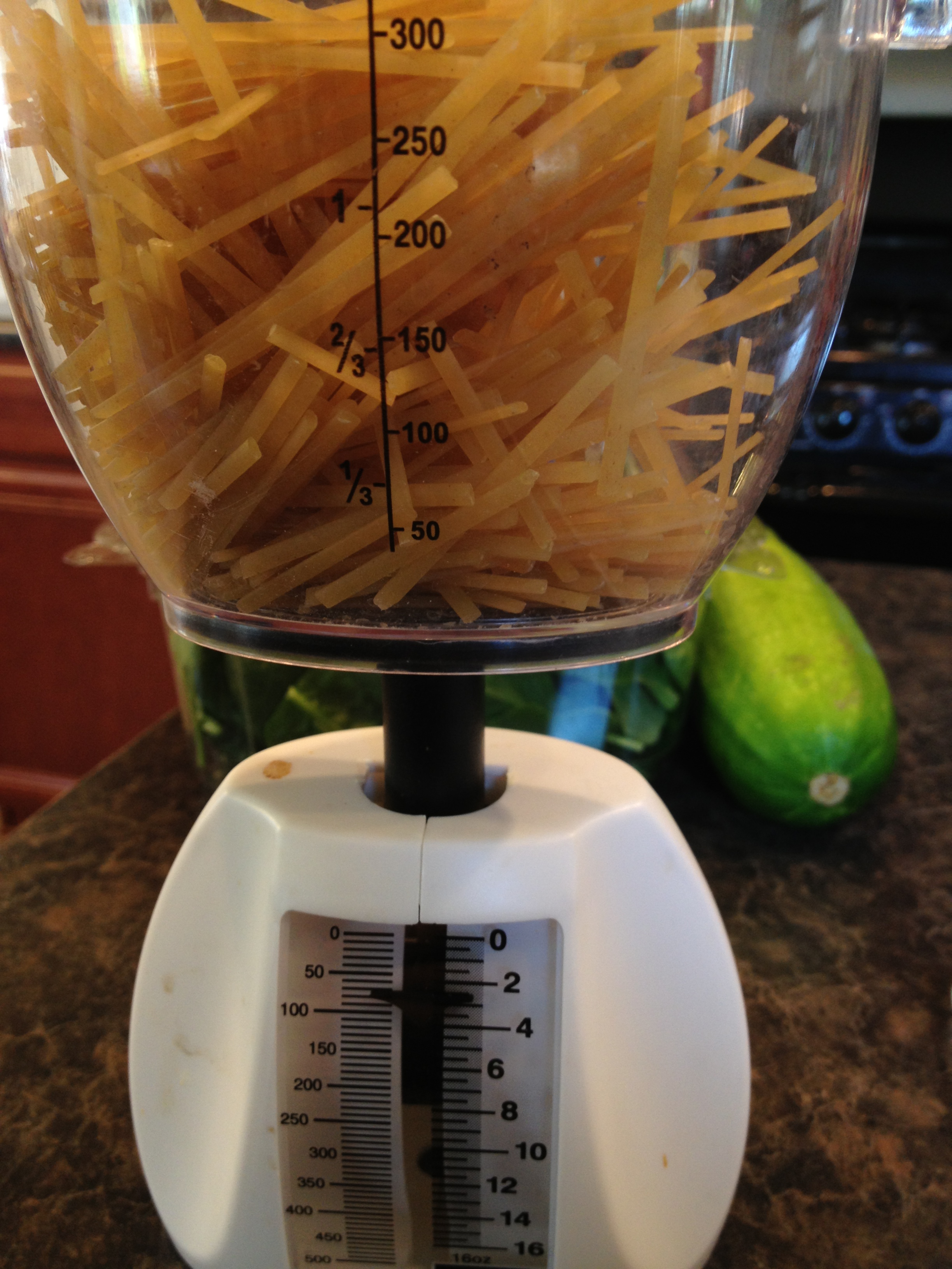 4. Start your pot of water for the noodles (if using). I got out my little scale and weighed out 8oz of noodles. I broke them up into the measuring cup as I went along. I wanted to not use the whole package of noodles, but wanted enough to be in almost every bite. Little pieces of noodles was perfect.