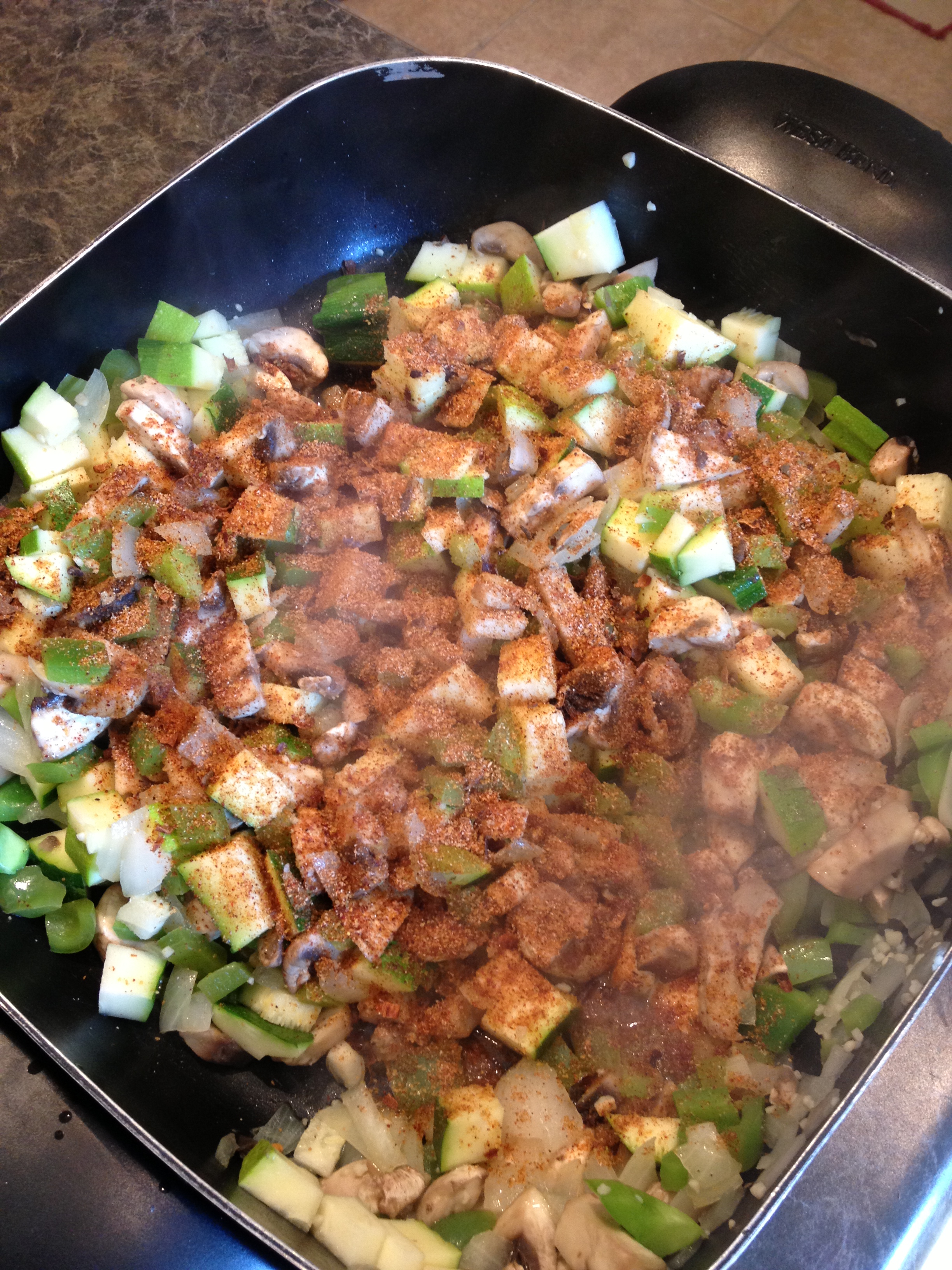 2. Chop in small chunks and drop in the pan, the onion, green pepper, garlic, zucchini and mushrooms. After the mushrooms I added the taco seasoning to start spicing things up.