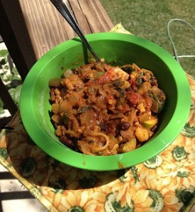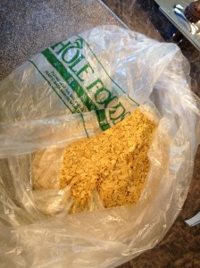 I bought a couple cans of whole tomatoes, fresh spinach (only because it was on sale at Whole Foods or else it would have been frozen) to replace the lettuce, large container of sliced mushrooms for a meatier feel, a can of black beans for the re-fried beans, a large zucchini just because, a yellow onion, 2 large green peppers and Tofurky Chorizo. I also bought Nutritional Yeast, which I had never tried before and didn’t really know what to do with it, but thought it was time to try it out.