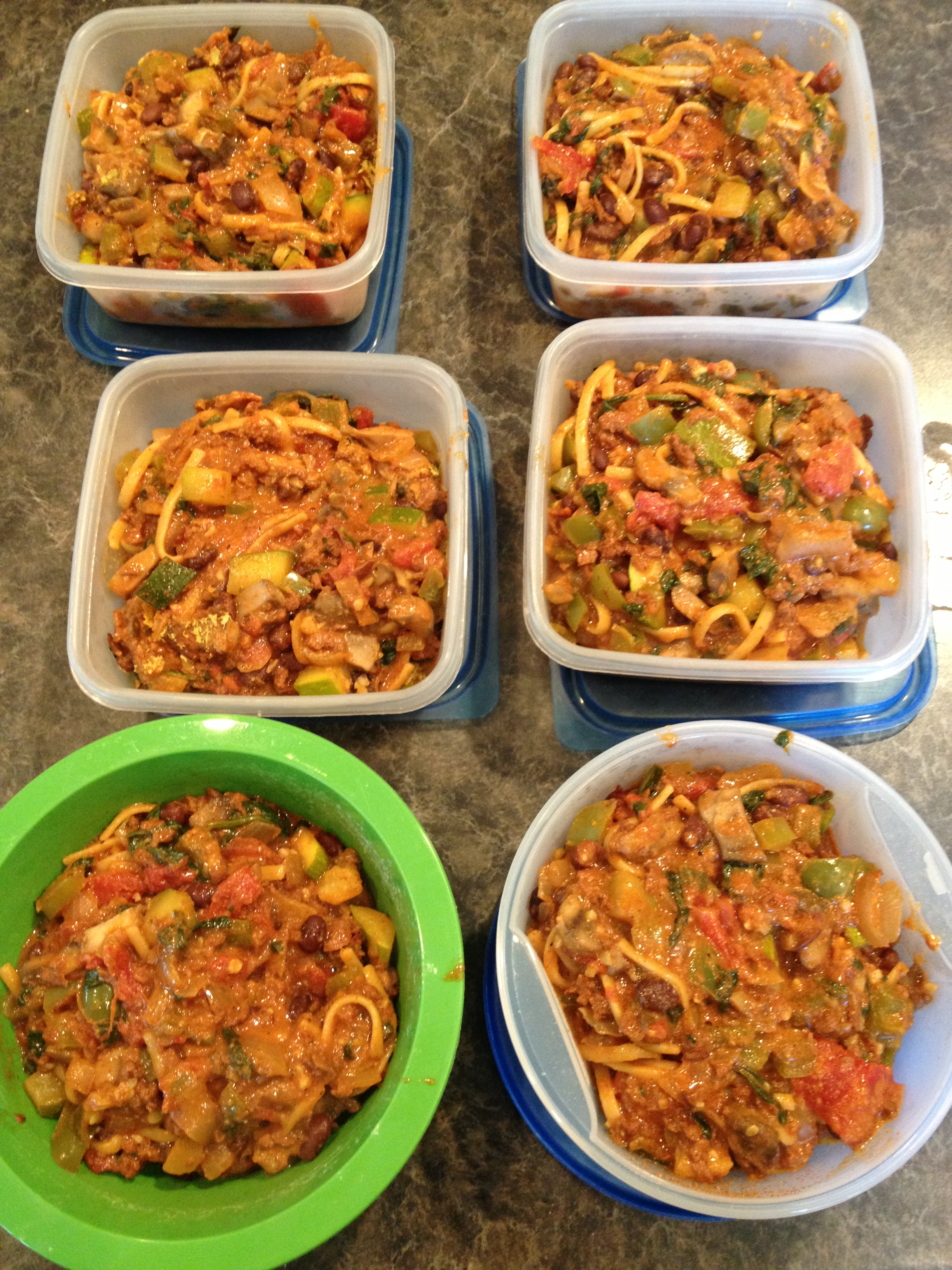 So here is my newly called Spanish Spaghetti. It got named this because it just isn’t the taco anymore. I also got six servings out of this. I like to portion everything out before I take my lunch or dinner from the meal. I pulled it out of the oven and then immediately scooped out the spaghetti into the lunch containers, then filled up my bowl with the rest. If you use smaller containers and have a lot left over, use one of the lunch containers as a measuring device and measure out the what is left to know exactly how many portions you have. It is easiest to get a bigger container out then fill and dump the smaller containers and into the bigger container.