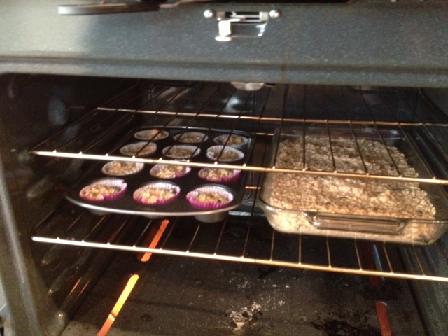 I cut the squares in 2×2’s so they were roughly the same size as the muffins. The pan took about an hour to bake, the muffins about 35 minutes. Turned out really good! Especially the raisins; they turned out juicy and plump-yum. Also-the raisins added the most calories per square then any other ingredients but they were definitely needed because if u don’t put anything sweet in it they will be to dense and not sweet.