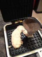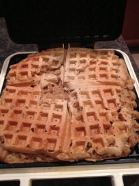 This was my first batter and waffle experience and it didn’t start off to well.  First it was too thick-kind of like cookie batter, so I had to add extra milk to loosen it up.  The original recipe only called for 2/3 cup milk, I had to use 1 1/4 cup.  Then my first attempt at the waffles maker was disastrous.  I guess you are supposed to use Pam to make sure they come off the burners…second and third attempts were much better!