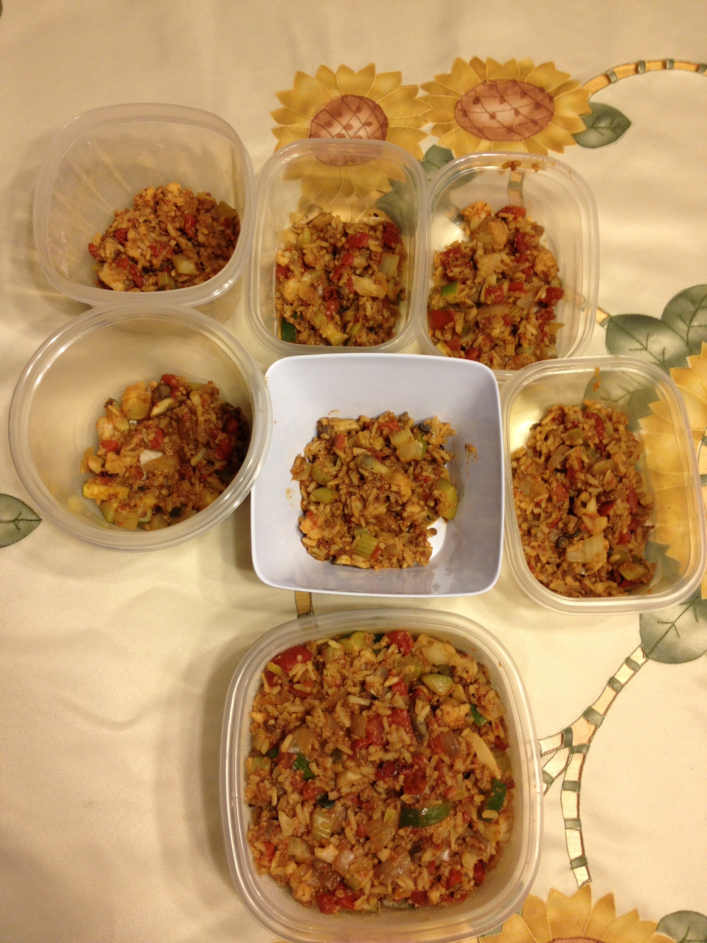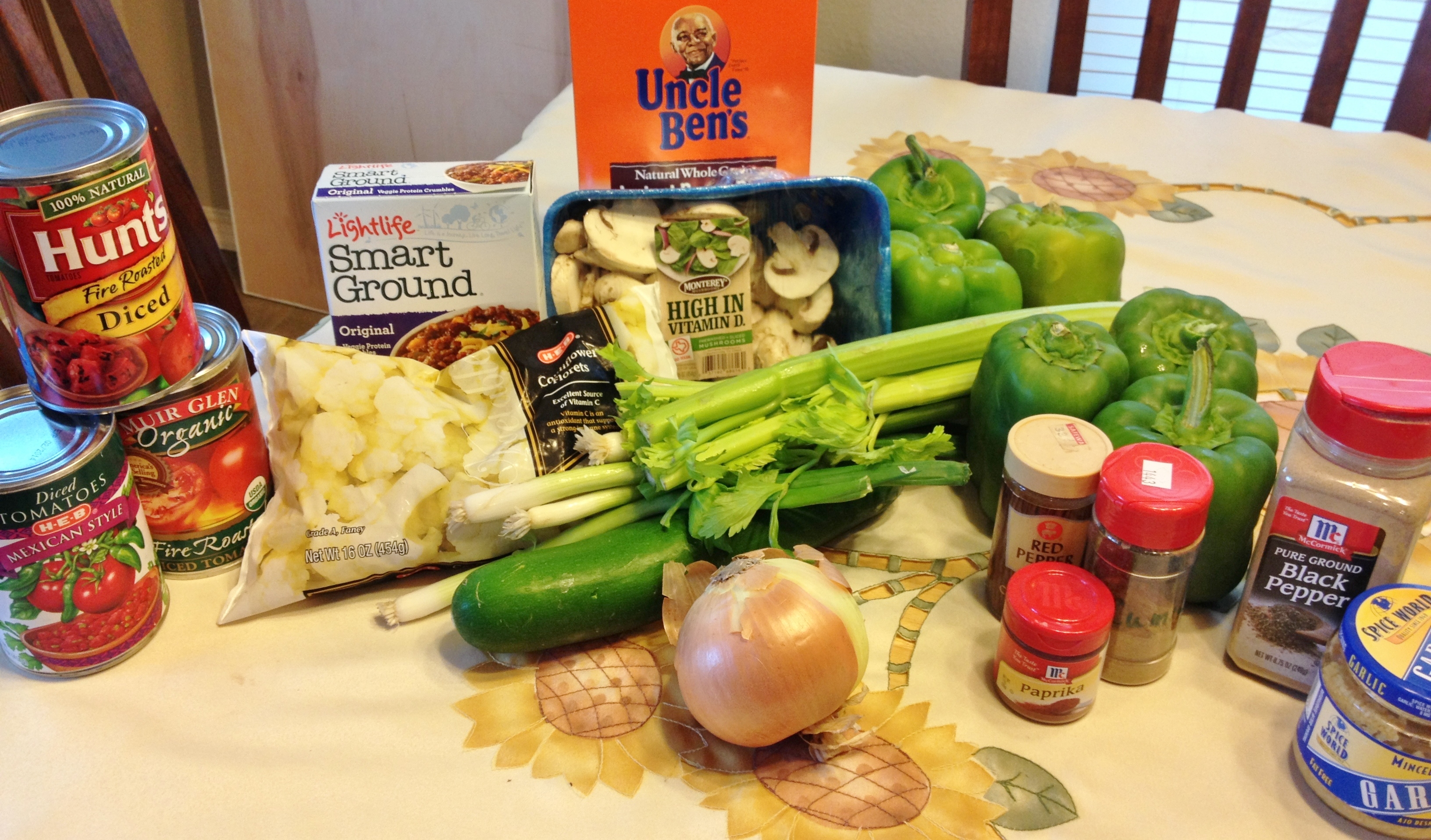 Start off with the brown rice. Rice takes a long time, even if it is quick cooking. First up on the chopping board were the onion then 4 stalks of celery. Into the skillet drop the onion and celery. While those were softening I chopped up the green onions and dropped those in also. I also defrosted the cauliflower while the chopping was going on. I then chopped up the mushrooms, zucchini and then the cauliflower and dropped each in the skillet.