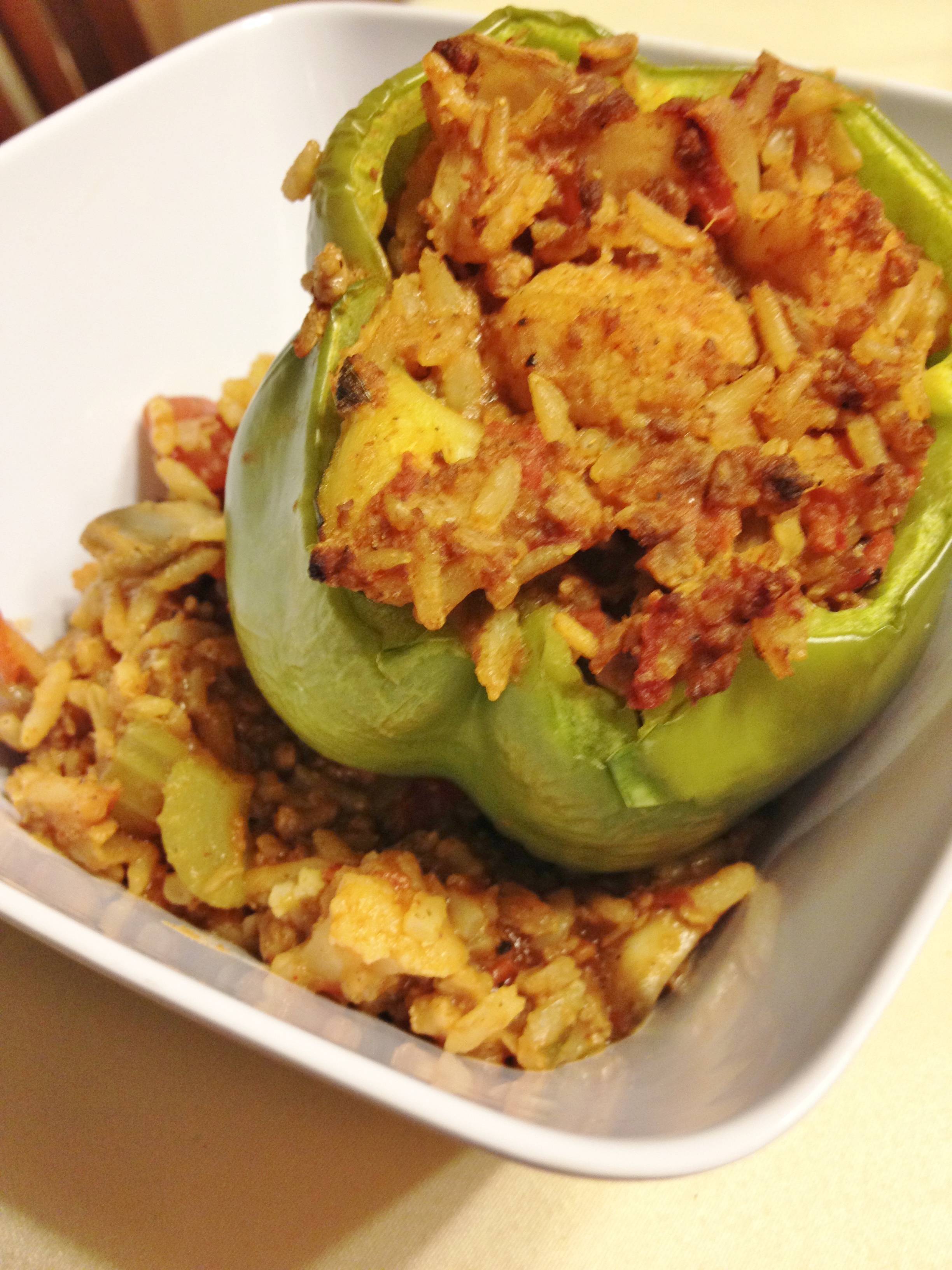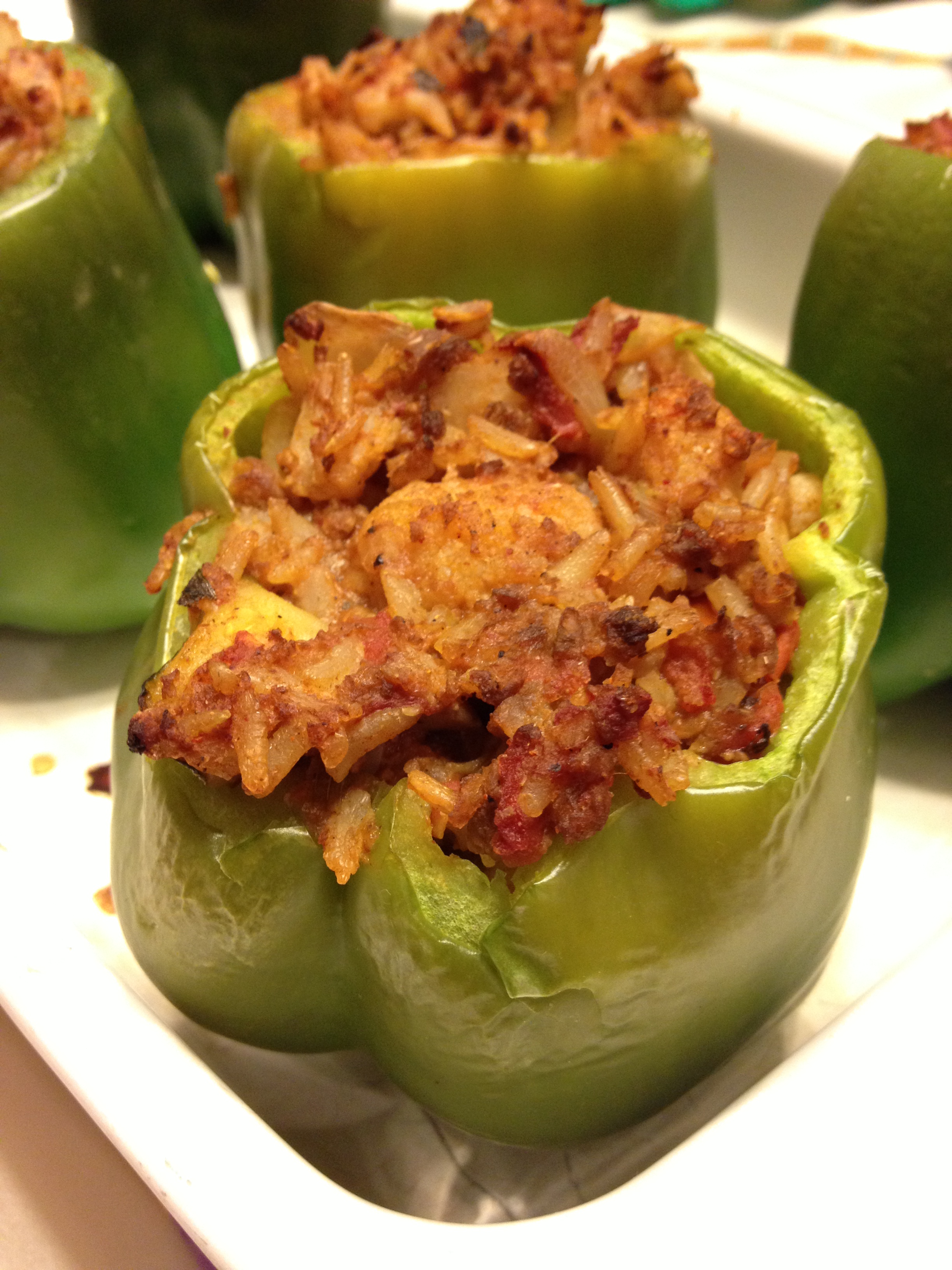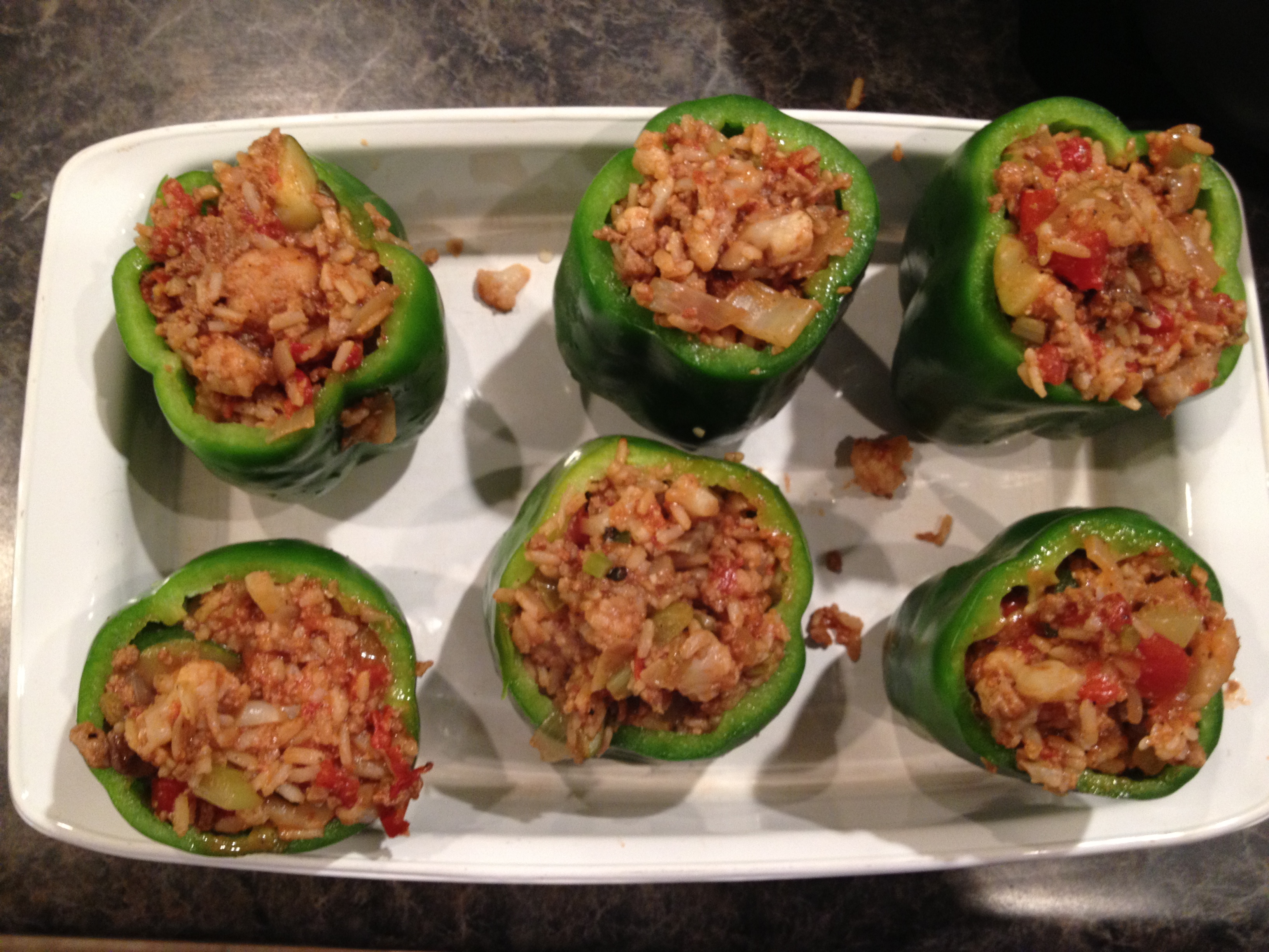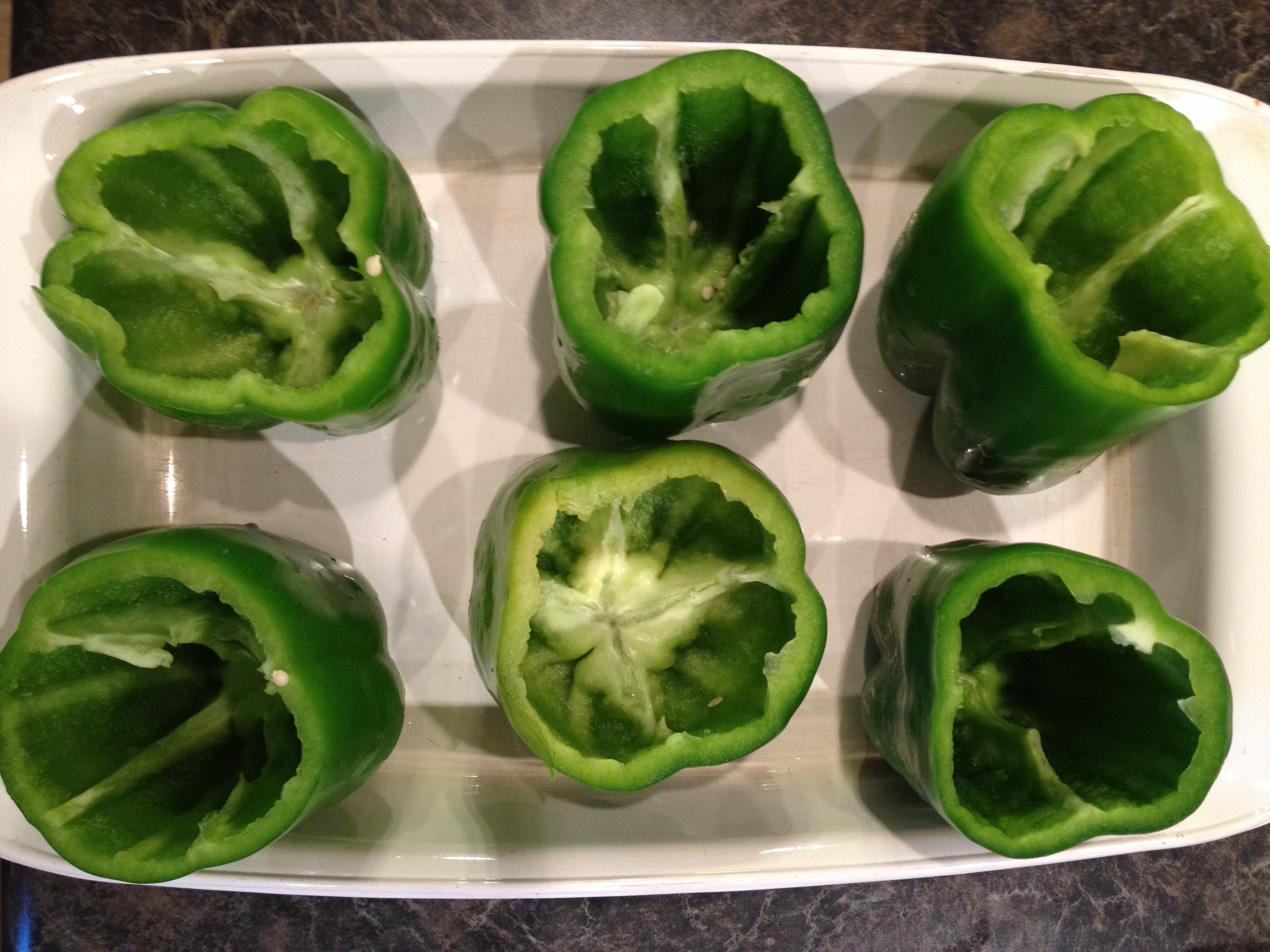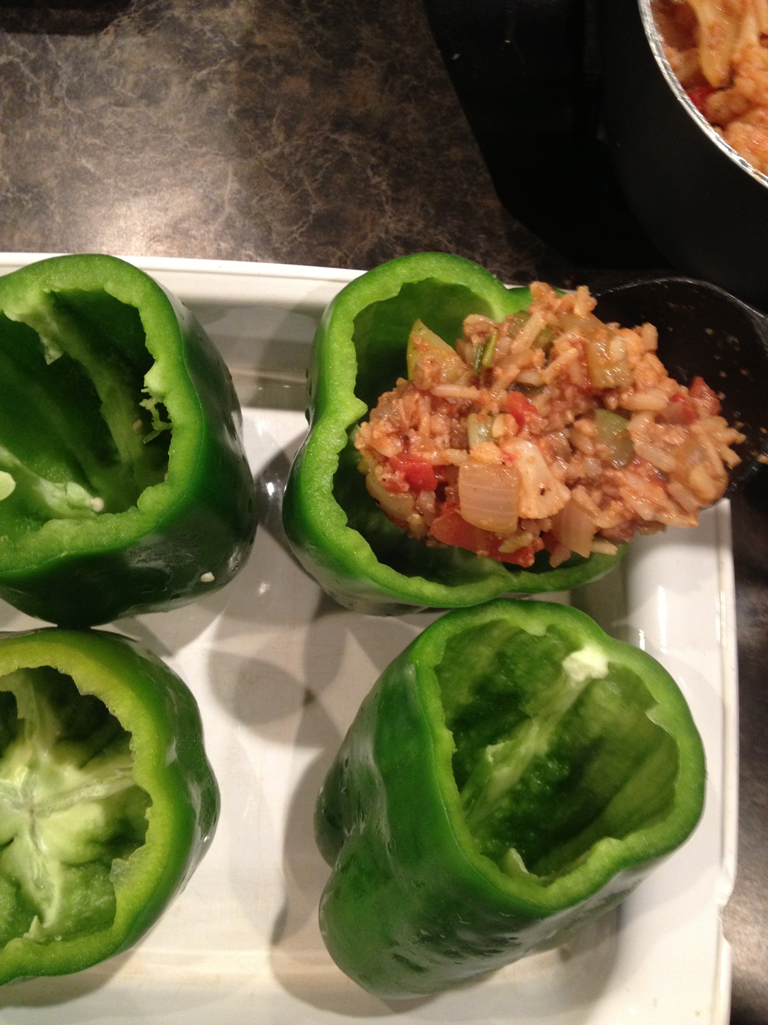 While all the simmering is going on, cut the tops off the peppers and and clean out the innards. Pour a small amount of olive oil on the bottom of a baking dish. Place peppers in the dish; if the peppers won’t stand up, cut a tiny bit off the bottom to make them stay upright during baking. After cooking all the stuffing, use a large spoon to stuff the peppers. Depending on the size of your peppers, you can get about a cup of stuffing in each. Once again, I had a ton of left overs. I put about a 1/2 cup at the bottom of each dish then froze the rest.