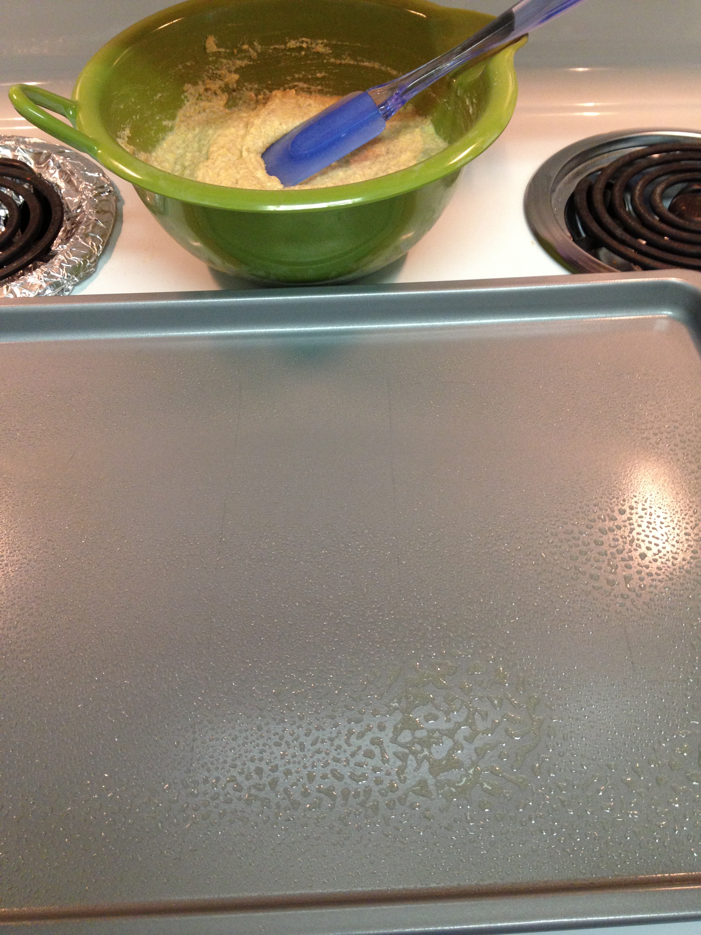 4. Spray pan with non-stick spray. Pour batter onto pan and spread with spatula. Spread evenly.