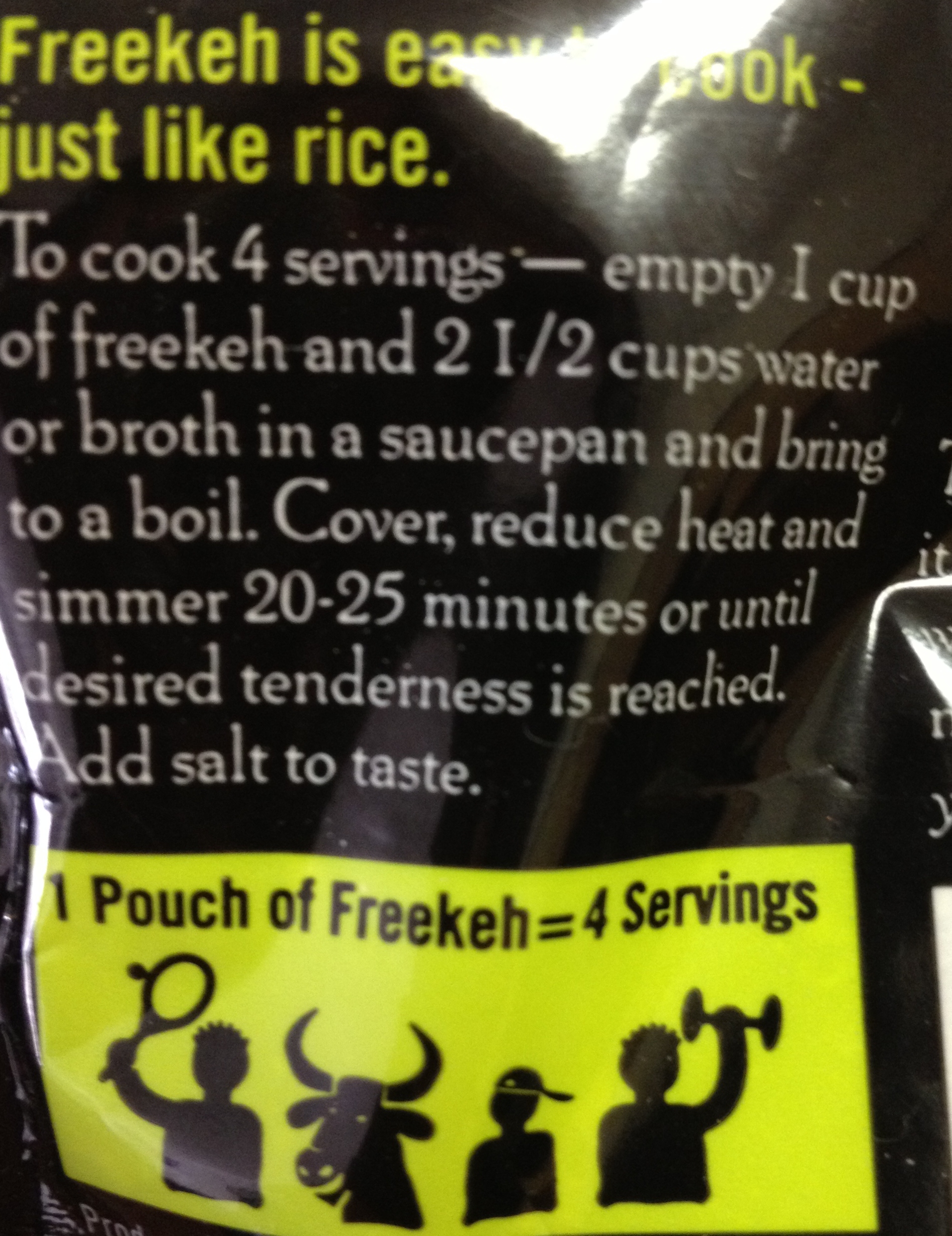 1. Measure out Freekeh, salt and water into pan. Turn burner onto high and bring to a boil. Turn burner down to simmer; cover and let go for 25 minutes.