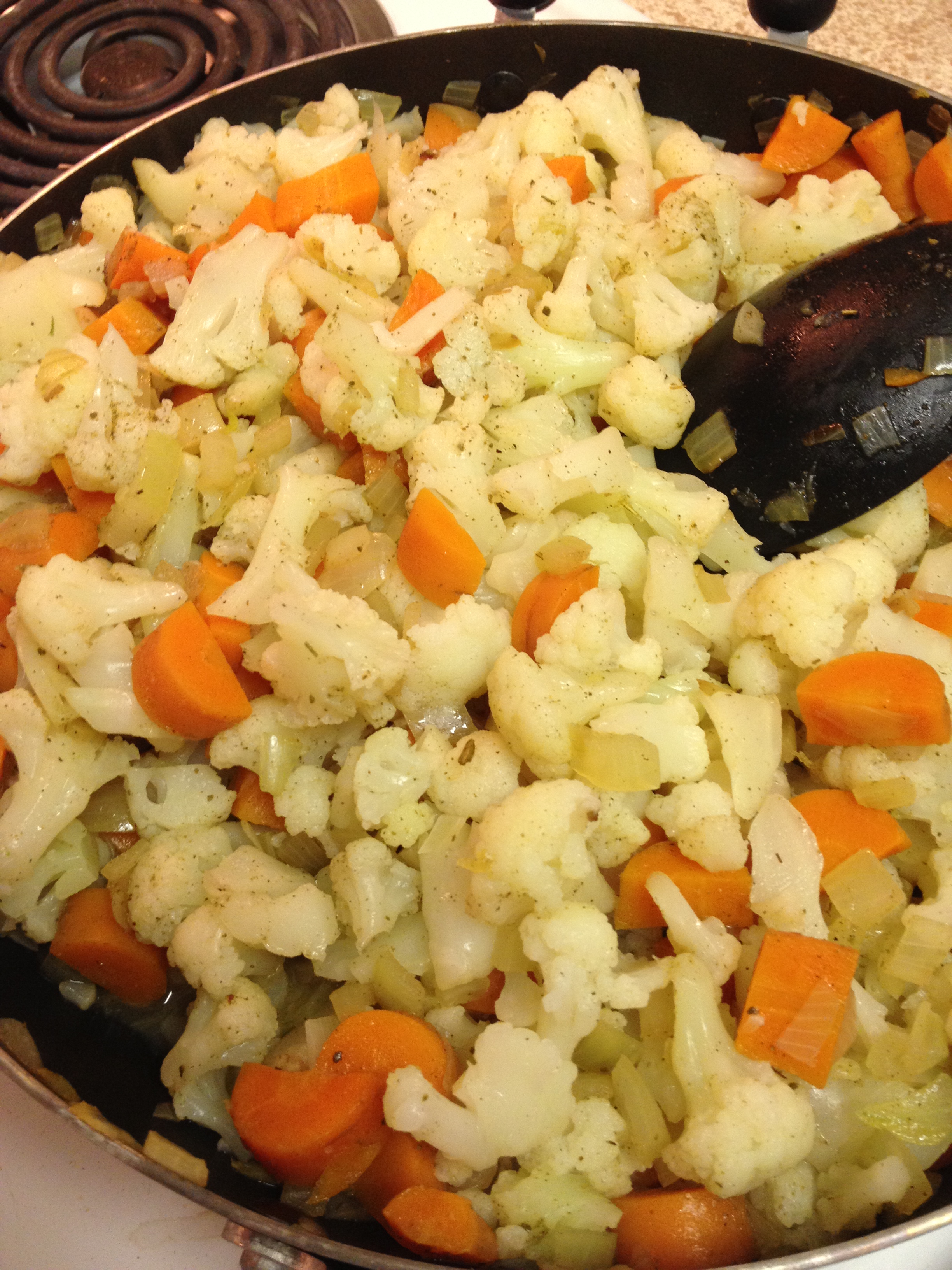 4.  Chop carrots into small pieces and add to onions.  Carefully chop still frozen or defrosted cauliflower and add to other veggies.