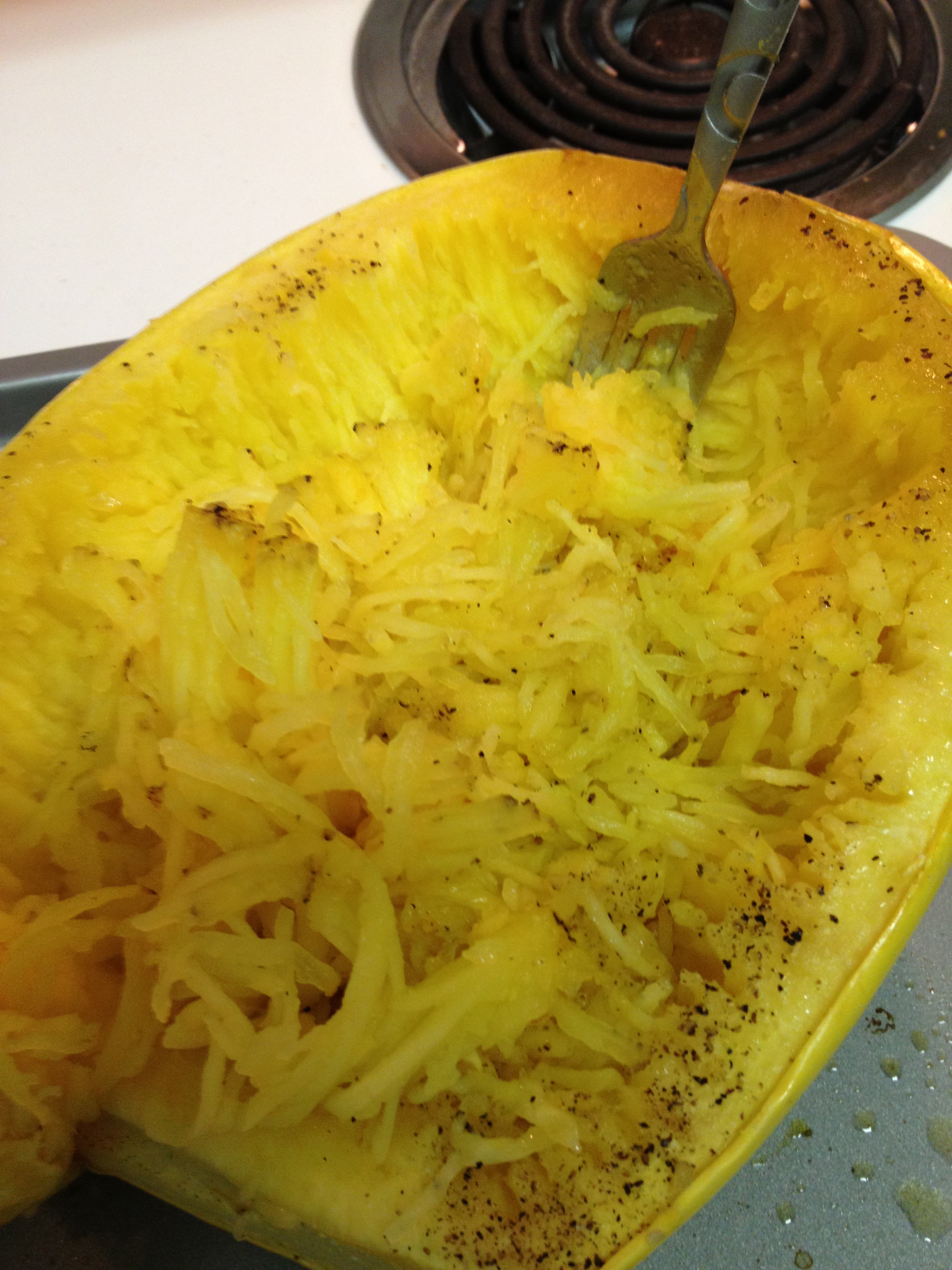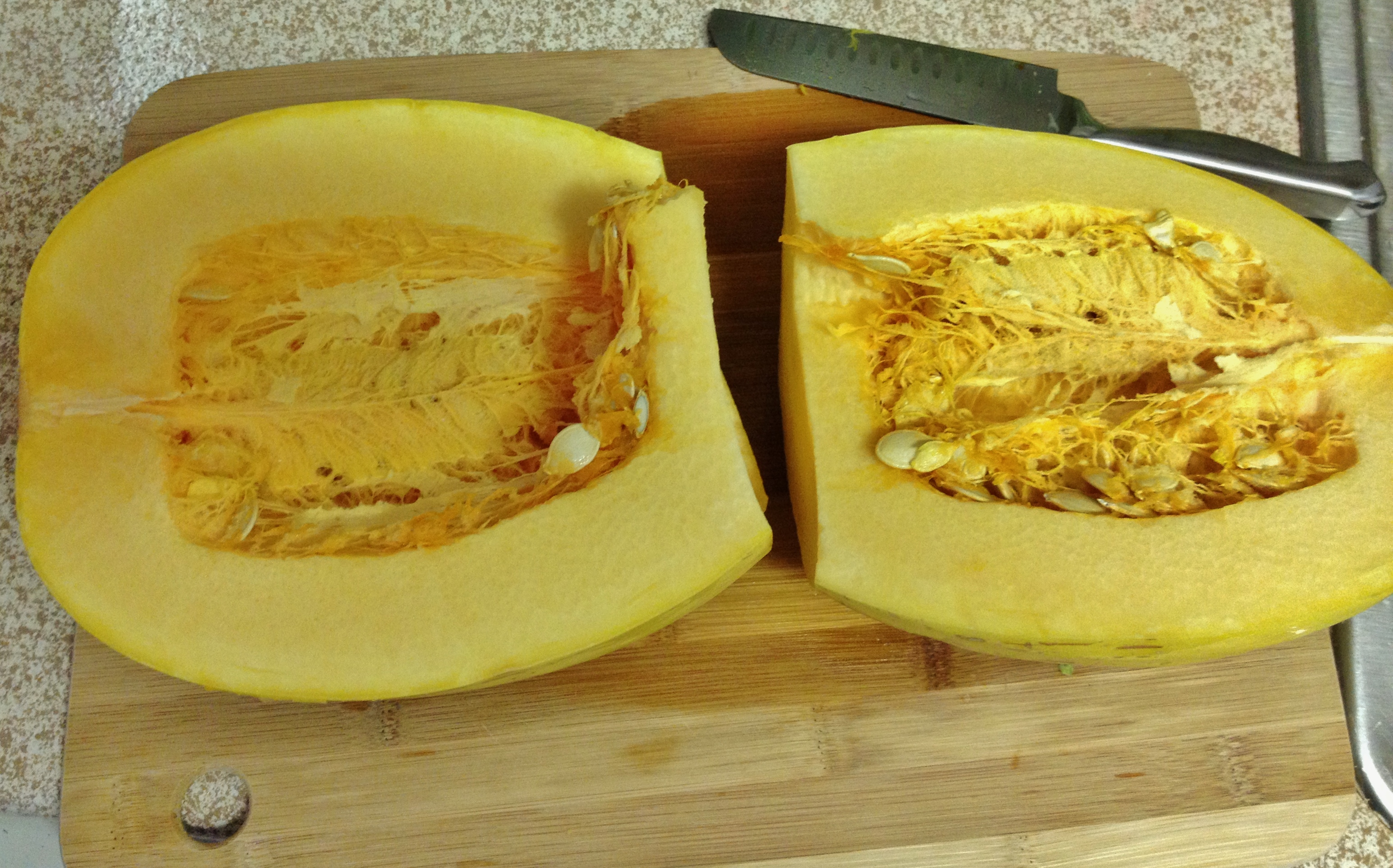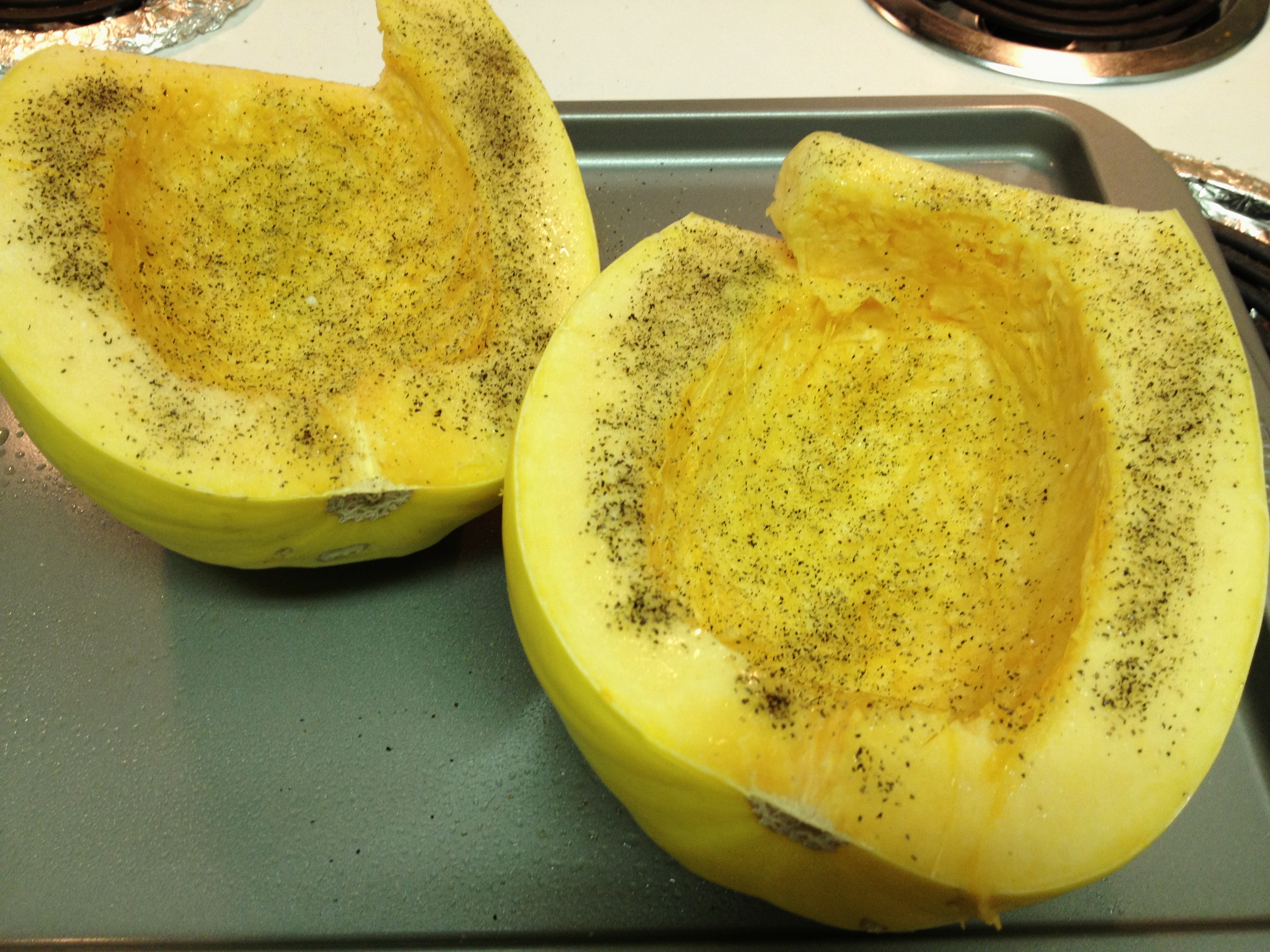 About an hour till when I thought it would be done I started the spaghetti squash, and man do I hate breaking that bad boy open. I have cut them and deseeded them before but this time I used Rachel Rays quicky method of first chopping the stem off. Oh man, why didn’t I ever think of doing that before? Seriously, trying to cut through that stem so hurts your hand and I have almost broken really sharp knives before. This time, but the rind around the stem then cut it in half, the scrape out the seeds and other yucky stuff.