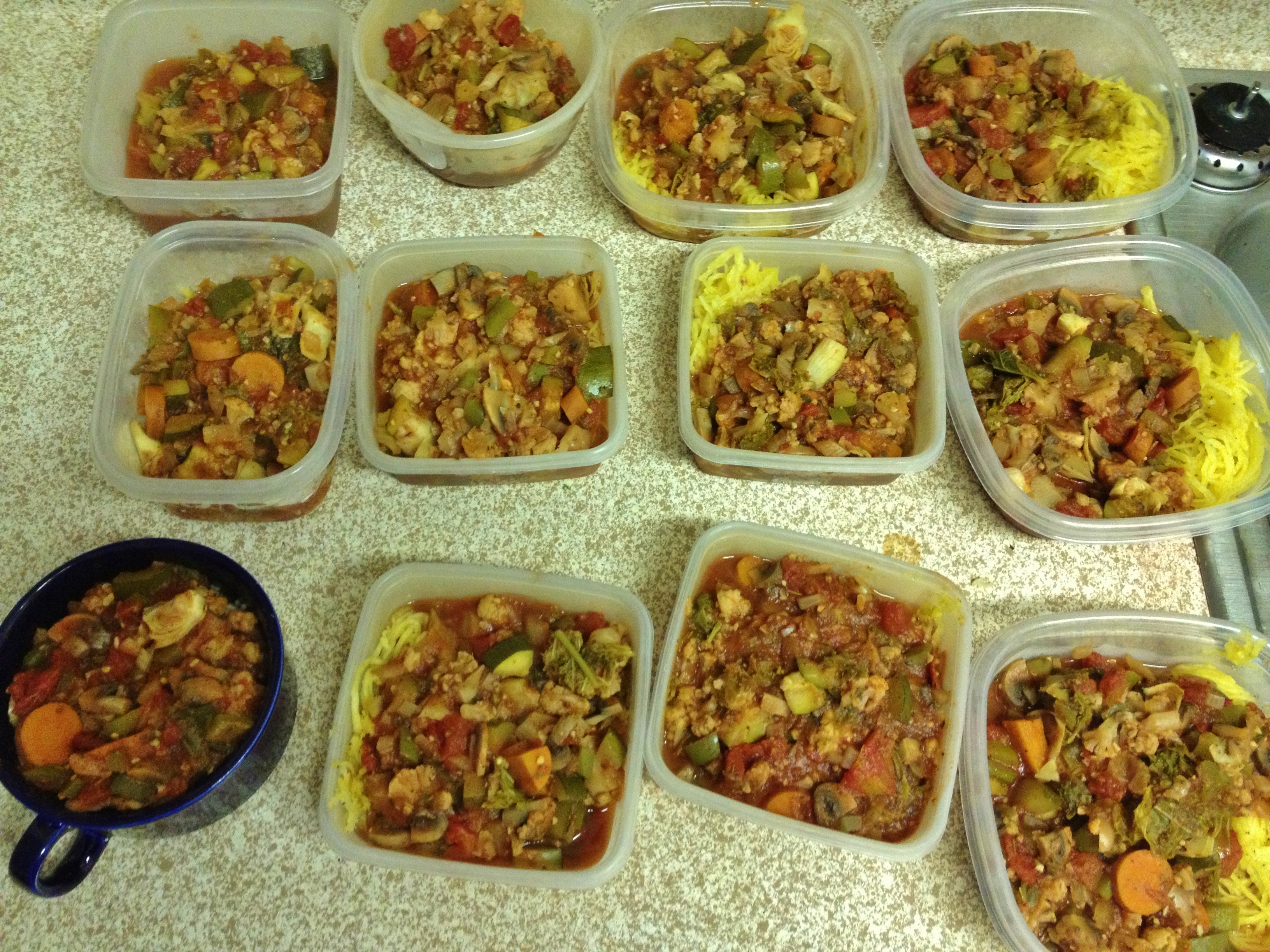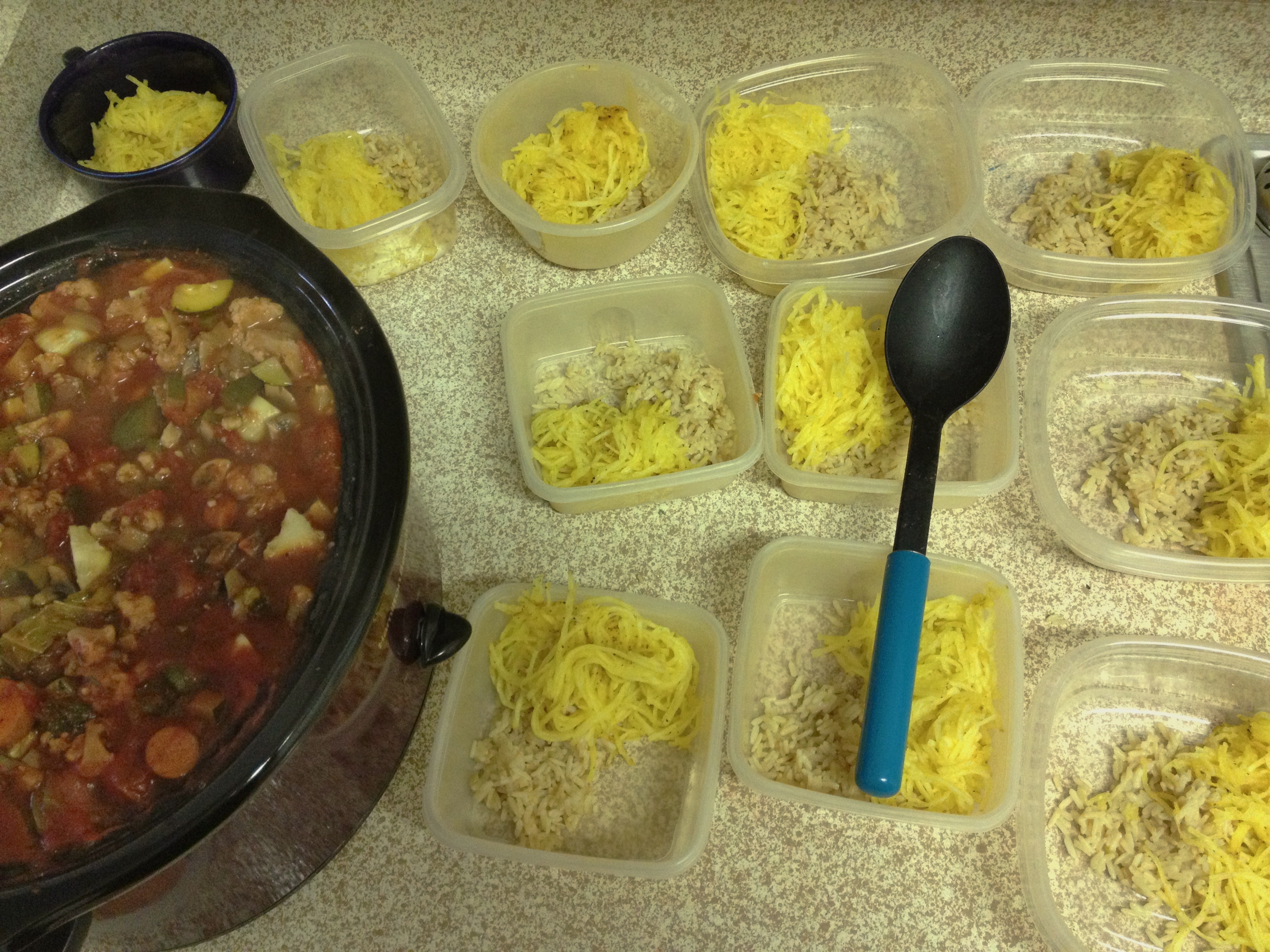 While I let the squash cool down enough to handle without burning myself I started putting out my containers and measuring out my rice. I got out my 1/4 cup measuring cup and measured the amount into my 12 containers. I then started in on the spaghetti squash, forking about a 1/2 cup into each container next to the rice. Then it was time for the veggies and sauce. I measured about two cups to 2 1/2 cups; there were leftovers which I put in a larger container and froze for another weekend meal (incidentally I just sauteed some tofu shirataki noodles…mmm).