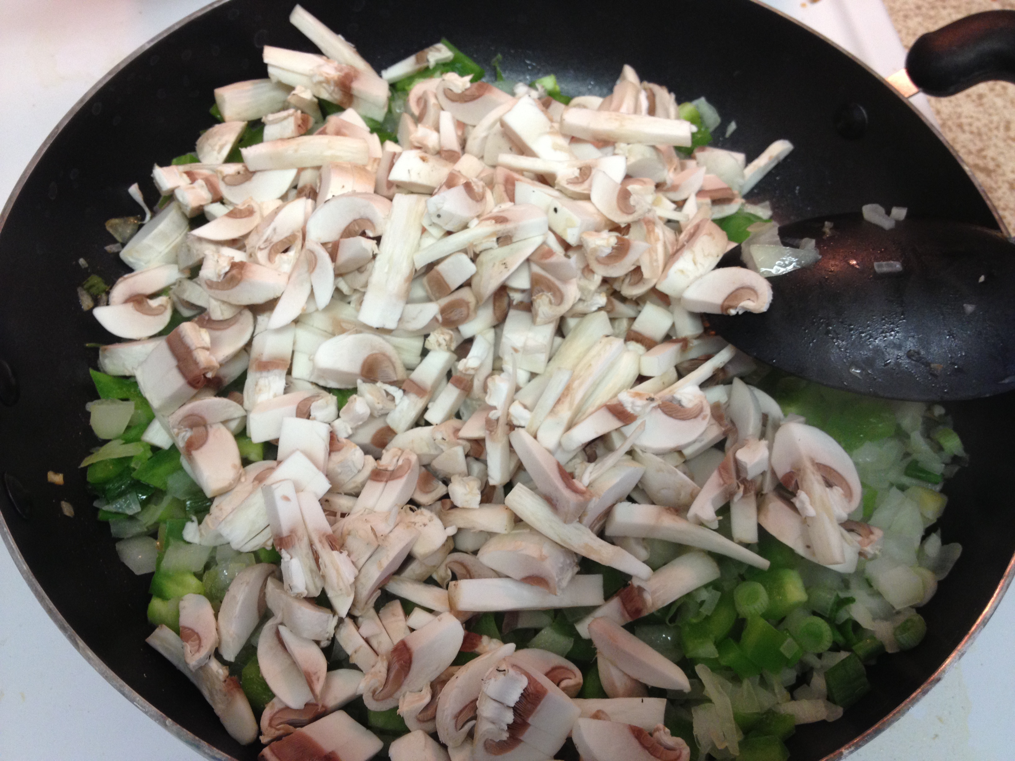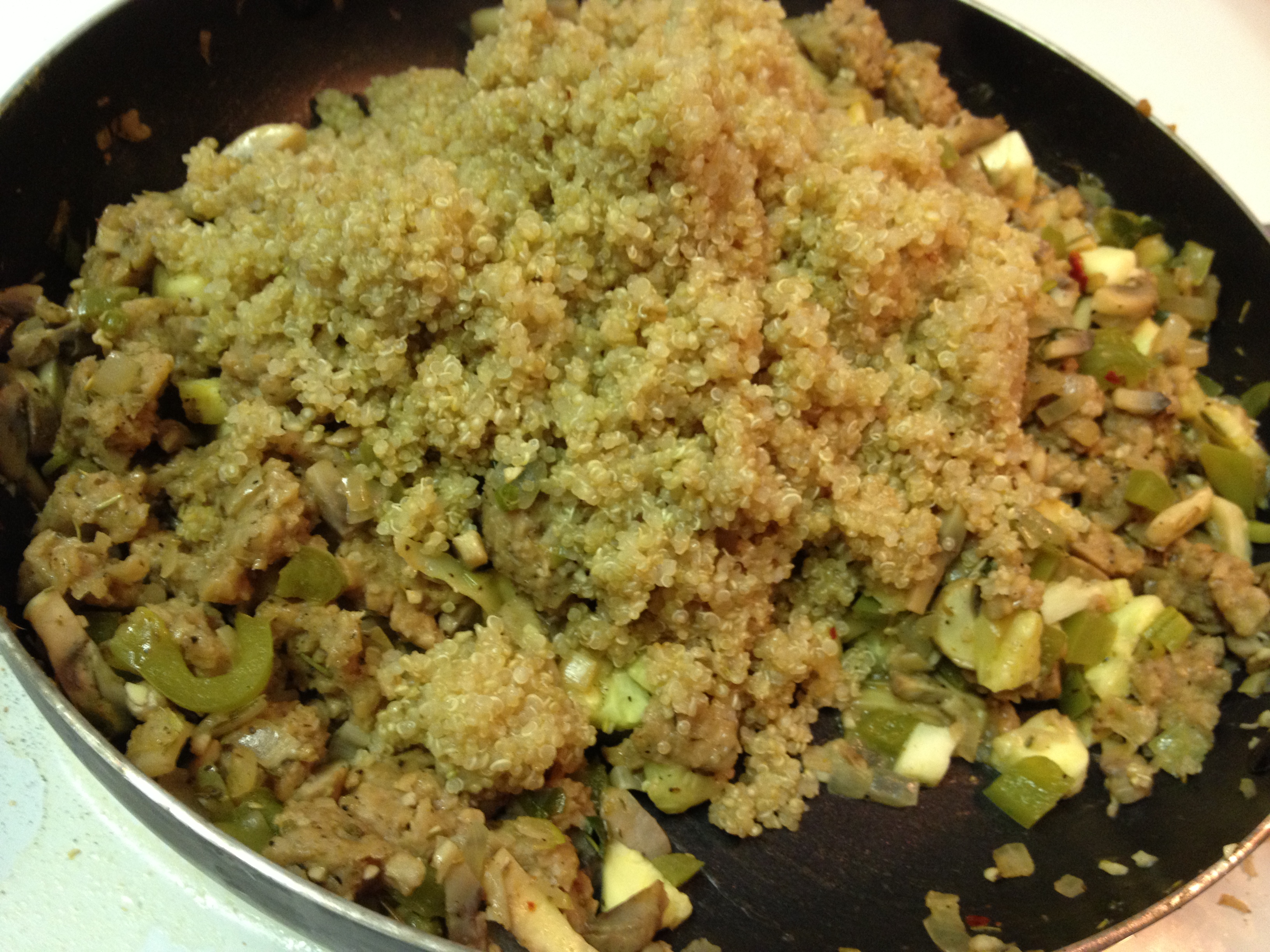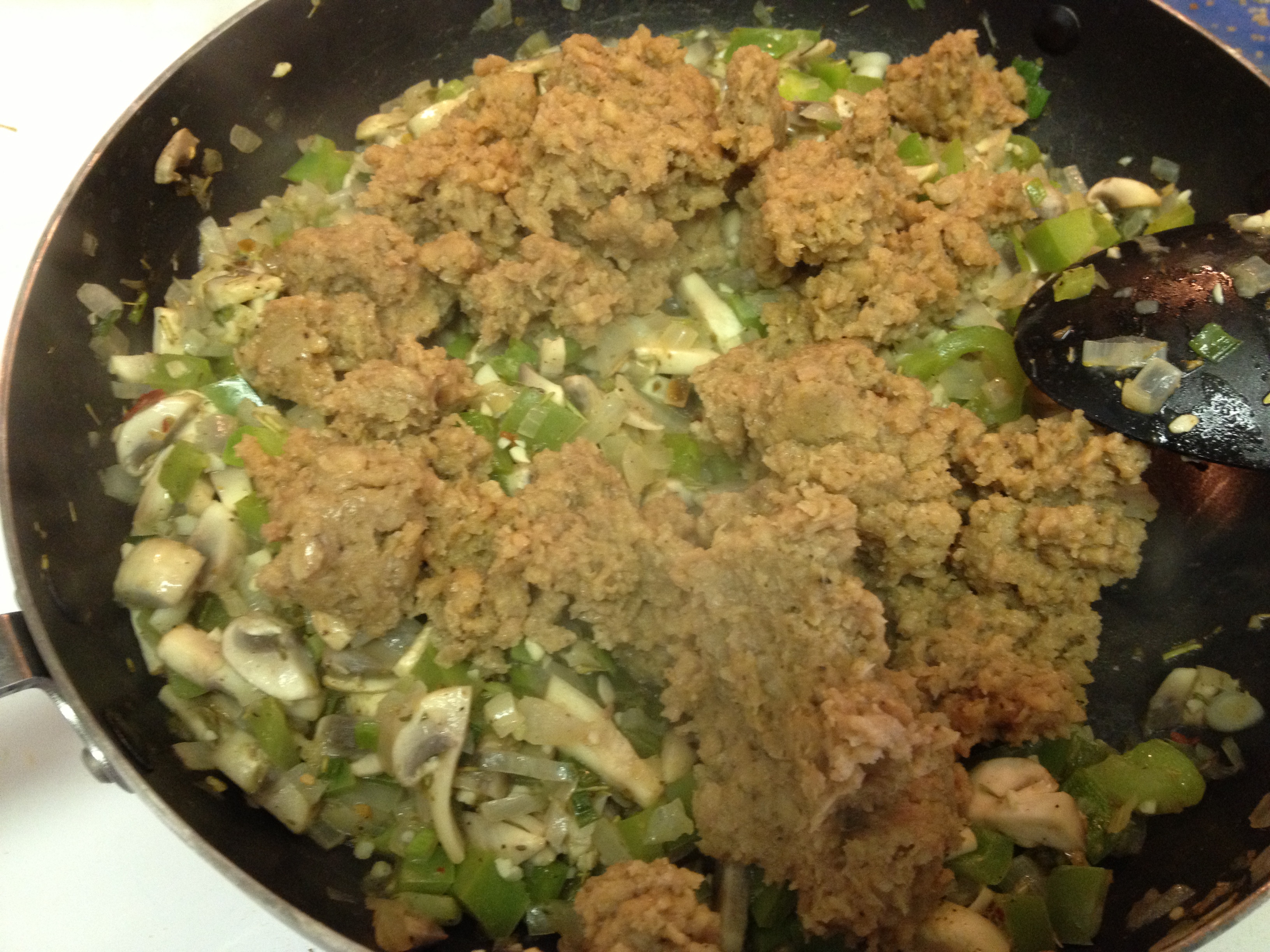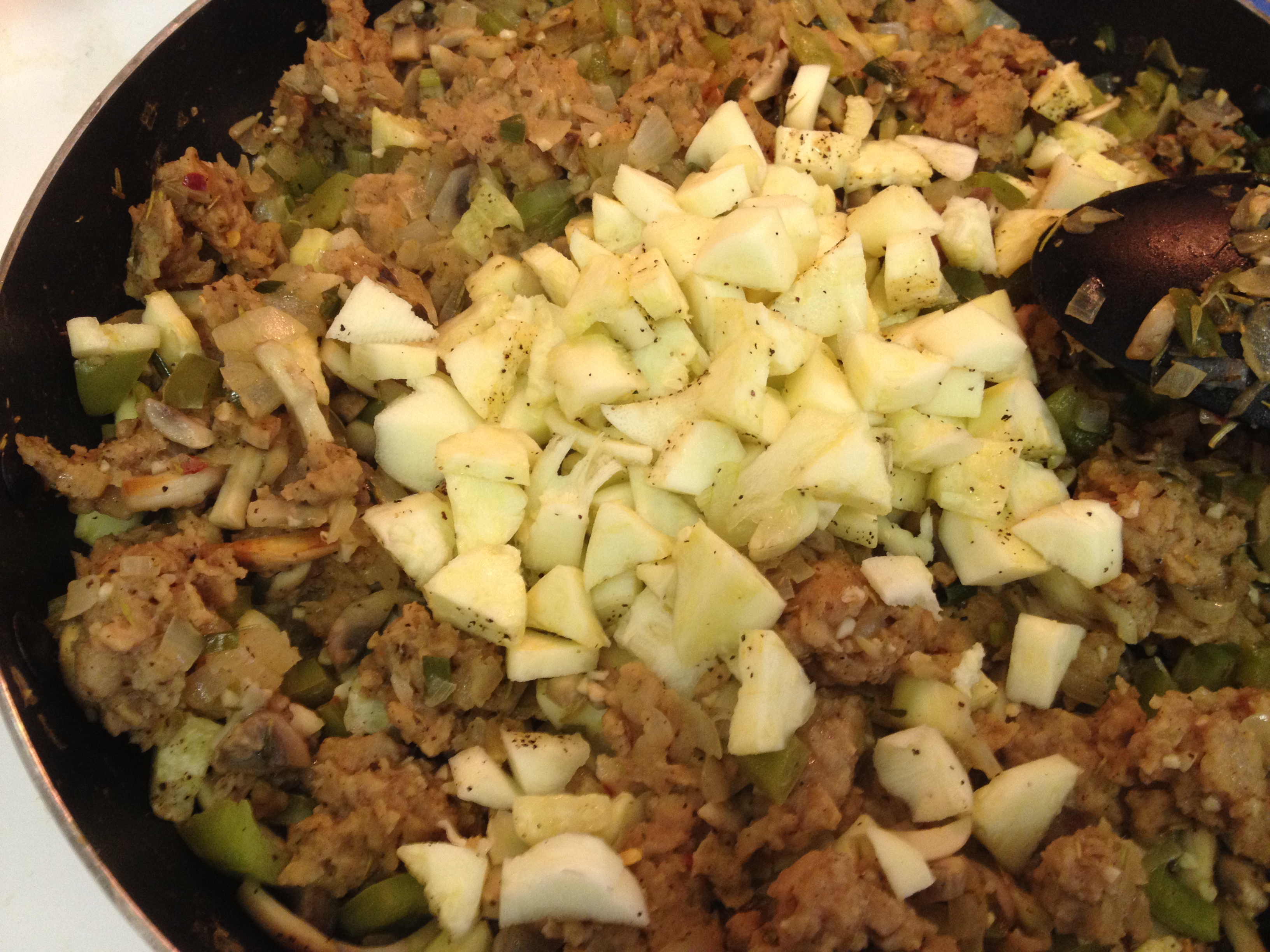 I decided that I wanted my stuffing to have more of a Thanksgiving flavor, so I bought some Light Life Go Lean Sausage-I haven’t used this in forever, mainly because unless I have a coupon I don’t buy it. Yay coupons! I had one for a dollar off-score! To get the seasonings right I just kind of randomly took what I thought might be holidayish. I used Thyme, Oregano and Rosemary and added heat with both black pepper and crushed red pepper flakes. The unusual thing I used was the Dijon mustard. I have been using it like crazy in my simple salad dressing recipe, and yum I love the flavor. So I decided to add that in for some sweet flavor to compliment the savory of the sausage.