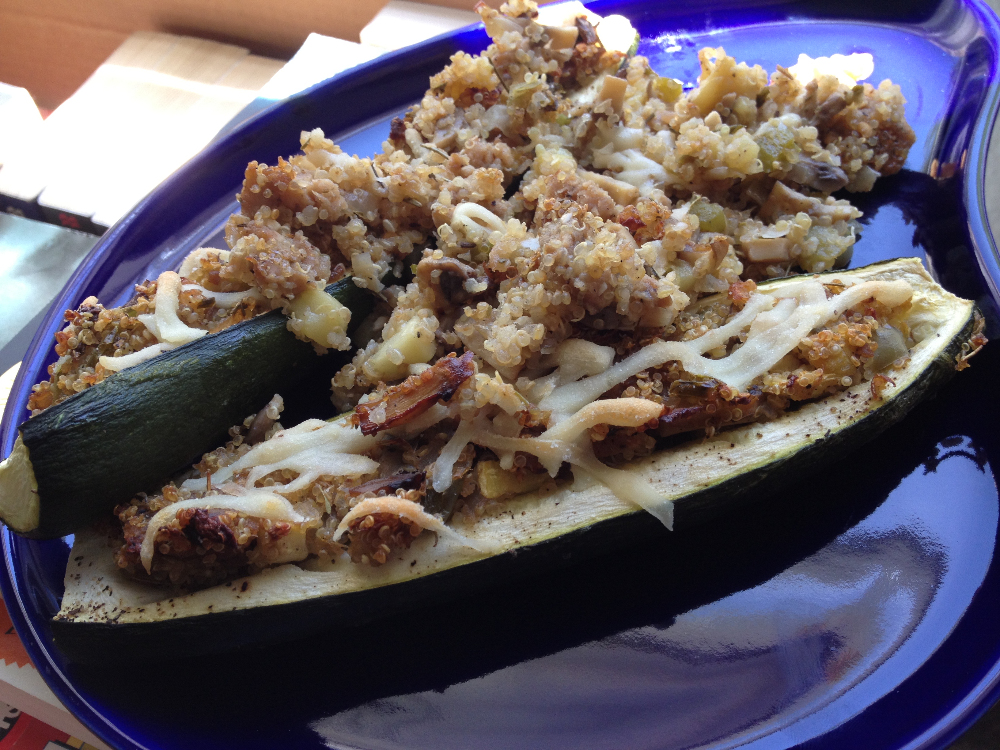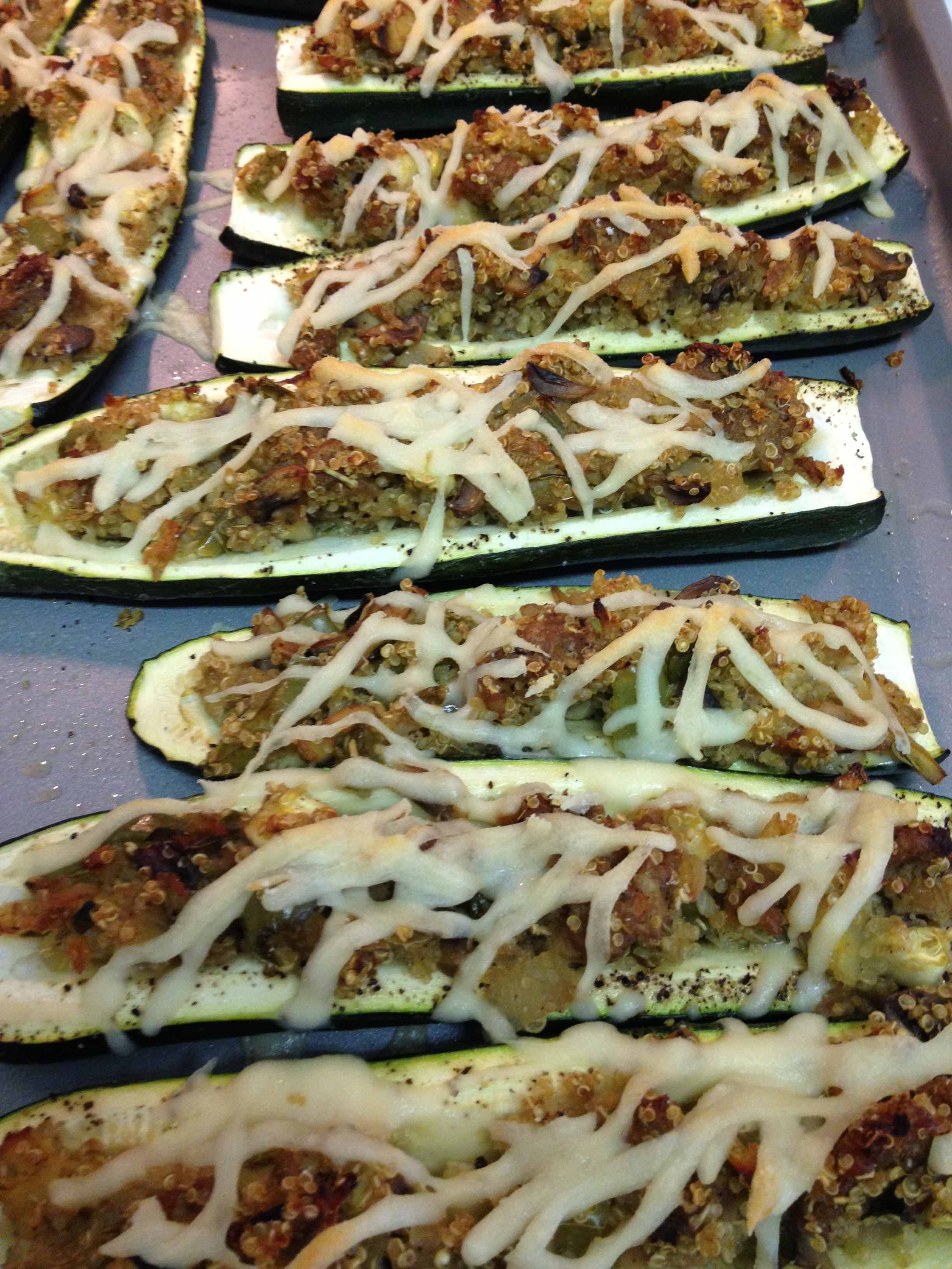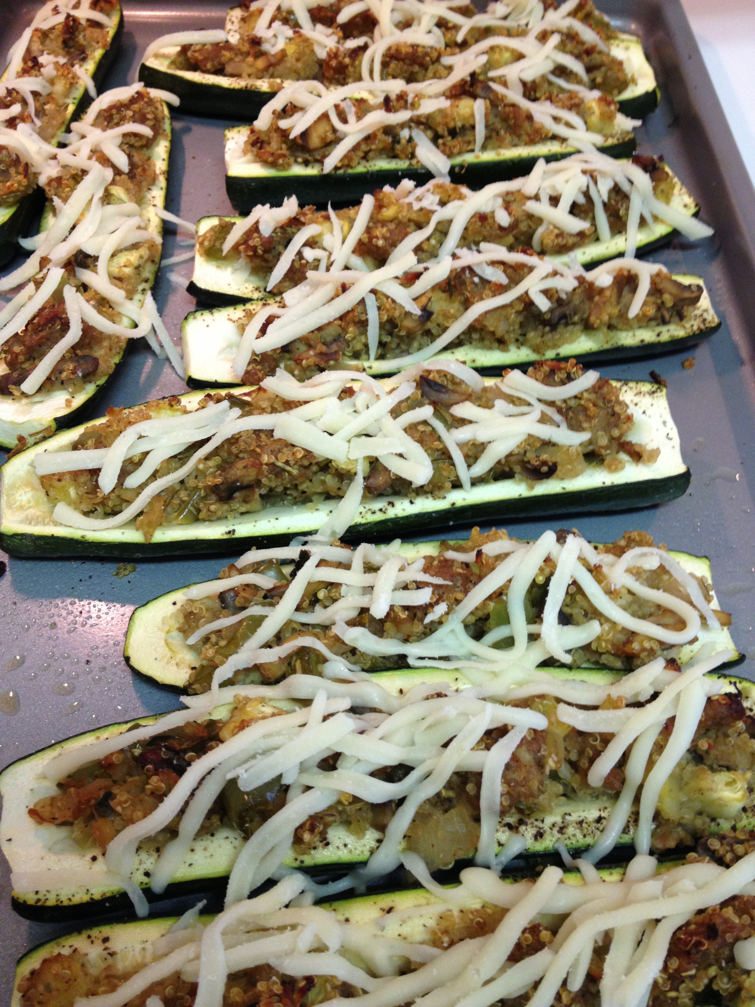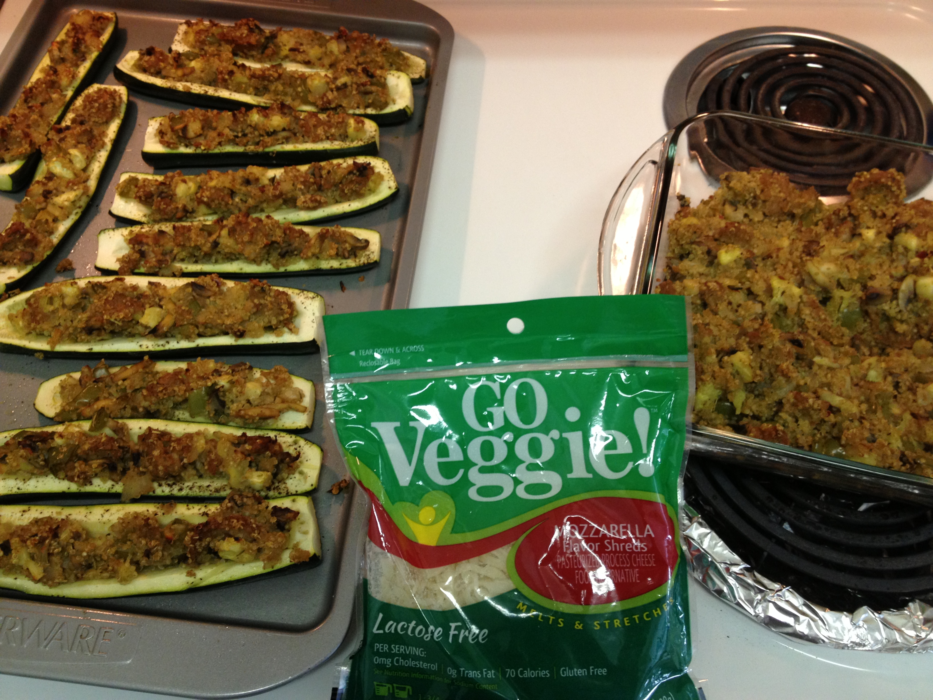 For the zucchini prep…I did follow what Paula said by baking them first, but I didn’t bake them long enough and by the time they came out of the oven and cooled everything was cooked through. I had to use a knife to get the middle out and chopped it up into small pieces. Not like I planned but it didn’t hurt the stuffing. For the carbs part of the stuffing I used quinoa. I love quinoa but I rarely use it. It is not common in my cupboard arsenal of ingredients, but after this dish I think I may be adding it in! Also, I let the boats bake for 35 minutes then sprinkled Go Veggie! Mozzarella Shreds on top and baked for another 15 minutes. Oh. Yum. These turned out awesome!
