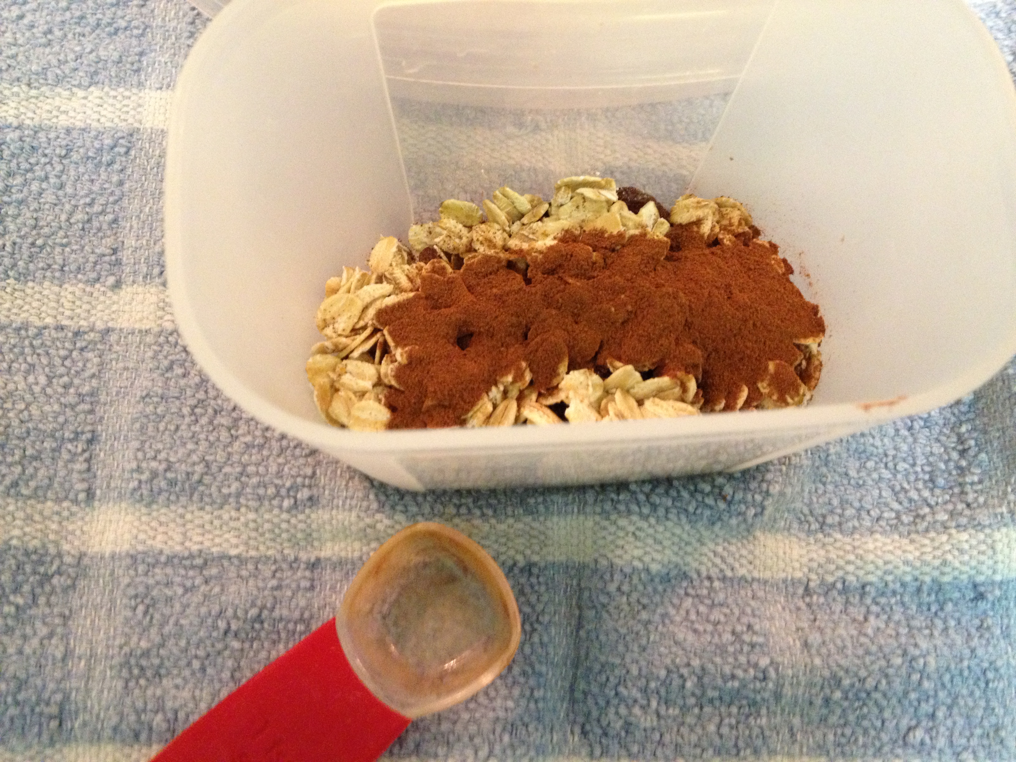 This was the easiest thing ever. One larger apple, cut in half and cored. Place open face up in plastic container or on a plate. In small container mix crumble ingredients and stir. Plop onto each apple half and stick in microwave for 5 minutes. Done. Yum! Not to sweet for my blood sugar, and it was like crumbly applesauce! So simple!