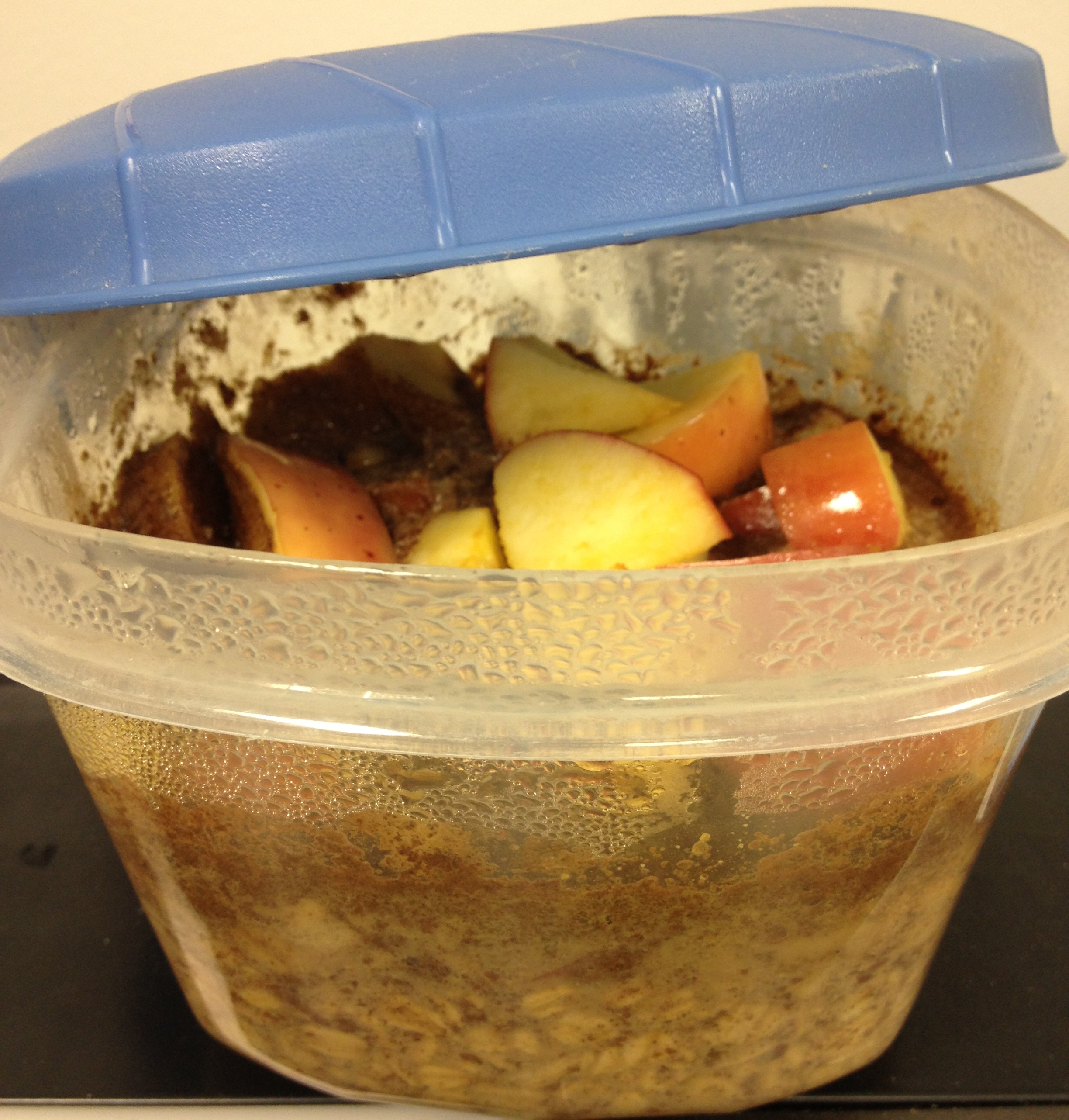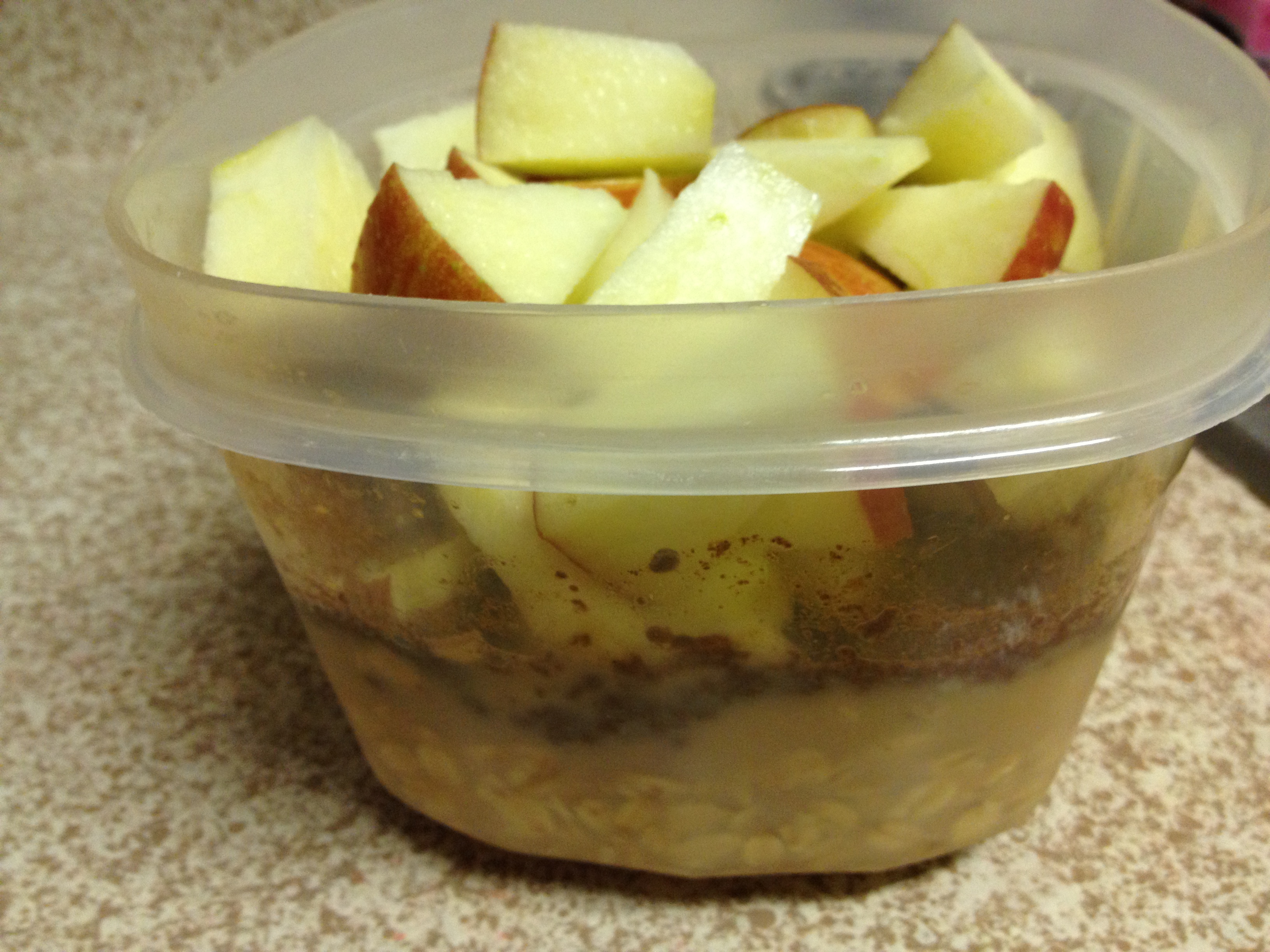 Seriously, it tastes like oatmeal-applesauce. It is great! The apples mush up like they are getting ready to be mashed up into applesauce, and with no sugar added at all in this wonderful oatmeal your blood sugar will not spike like crazy! Just be sure your container is tall enough so that your oatmeal won’t spew over the sides overnight.