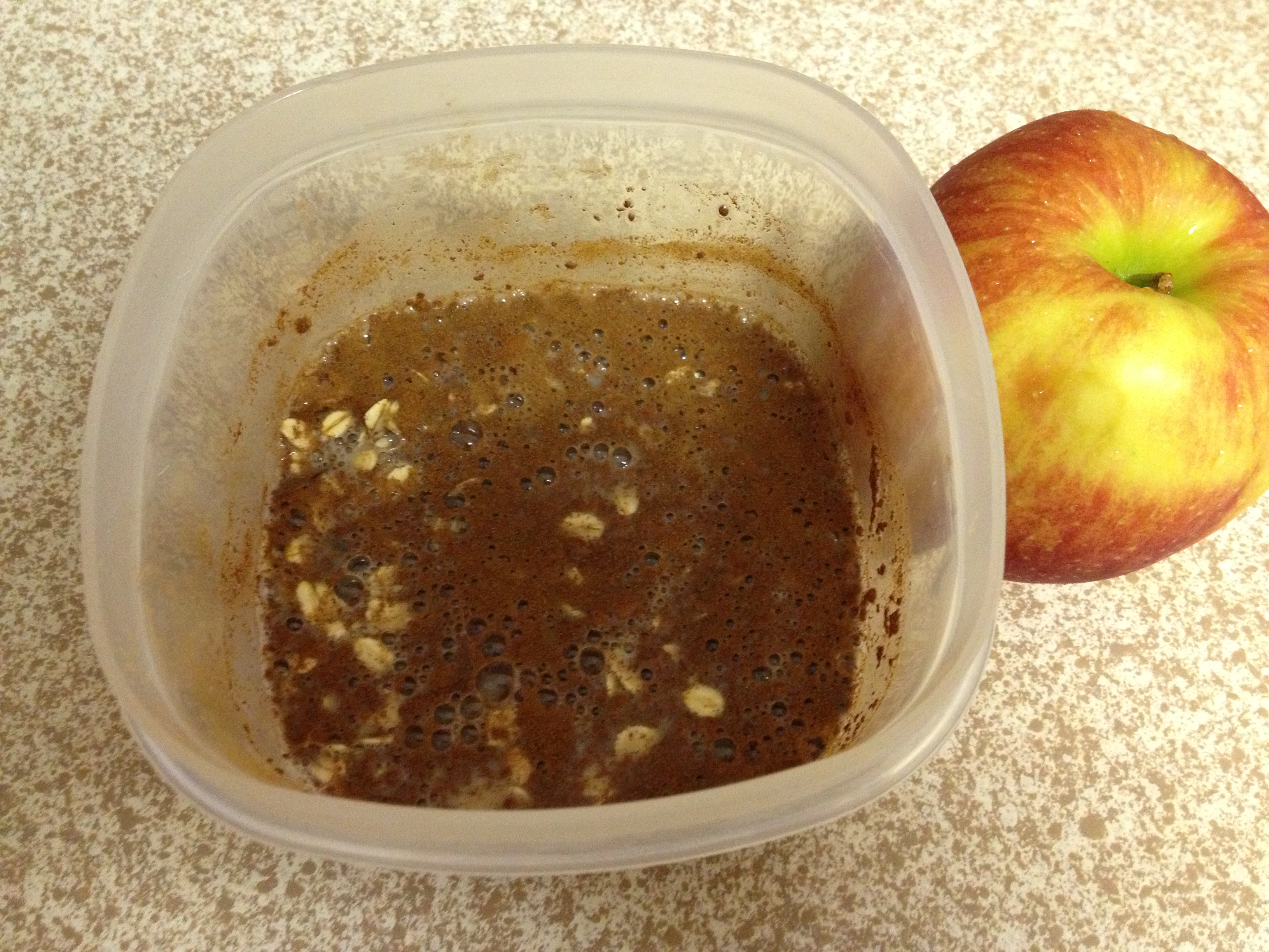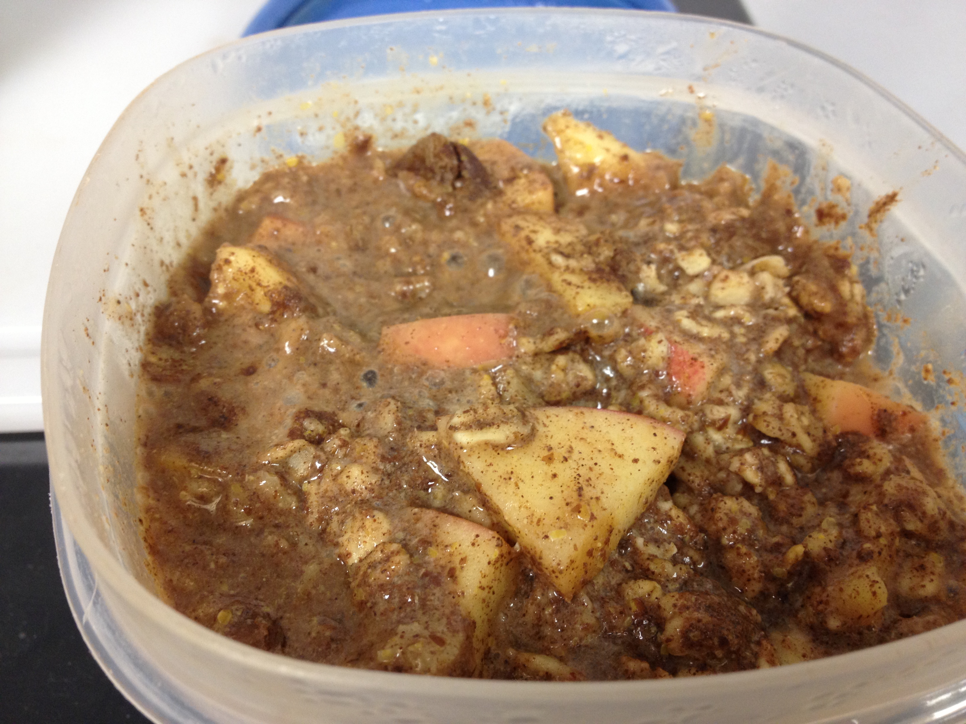 I have also evolved my overnight oatmeal with some amazing apples! After measuring and stirring together oatmeal ingredients, I cut up a small apple into small chunks and drop them in. Cover and let blob up. After microwaving for 3 minutes, add a little water (about 1/8 – 1/4 of a cup) and stir oatmeal and apples. Microwave for 2 more minutes…and voila!