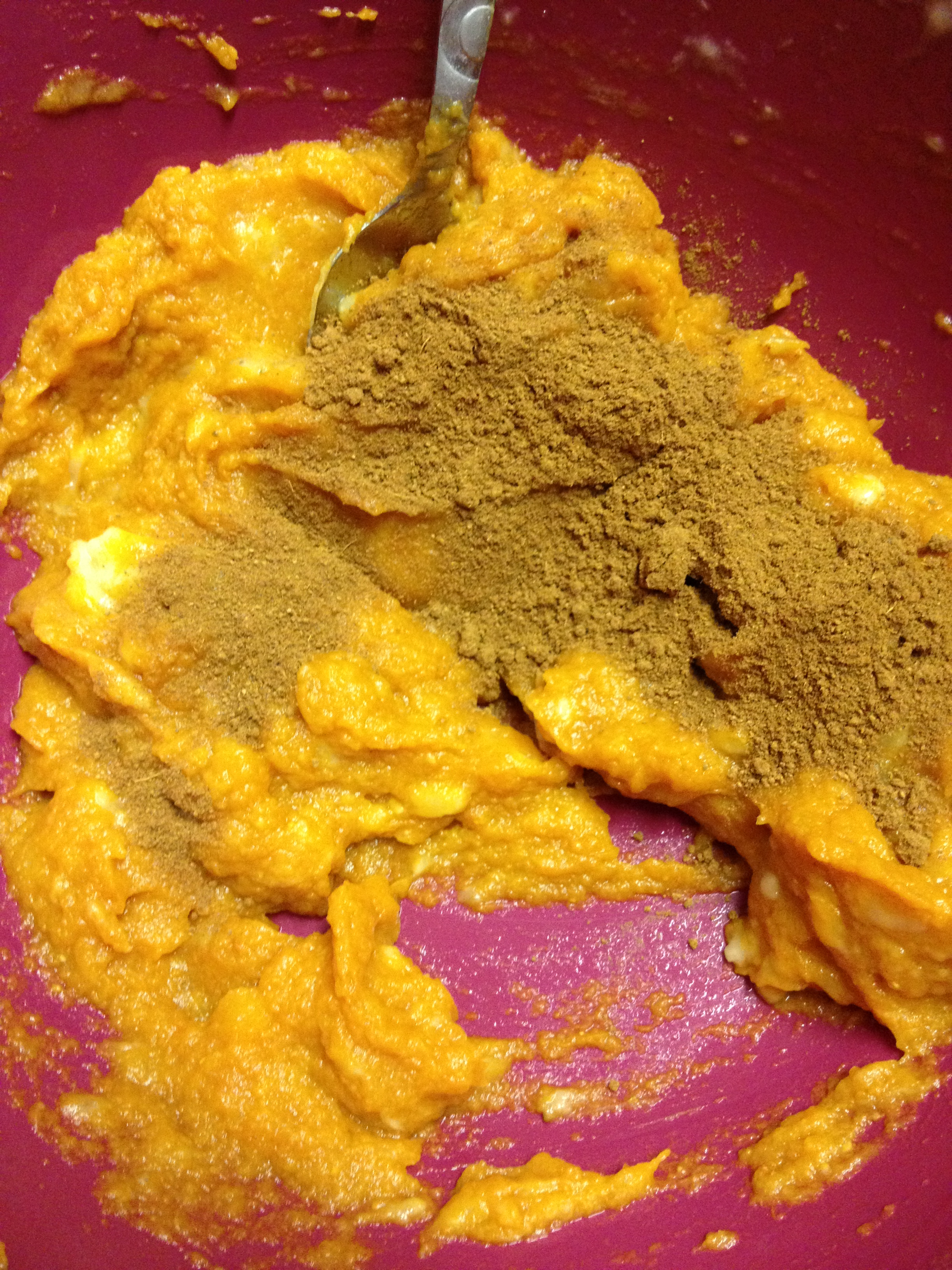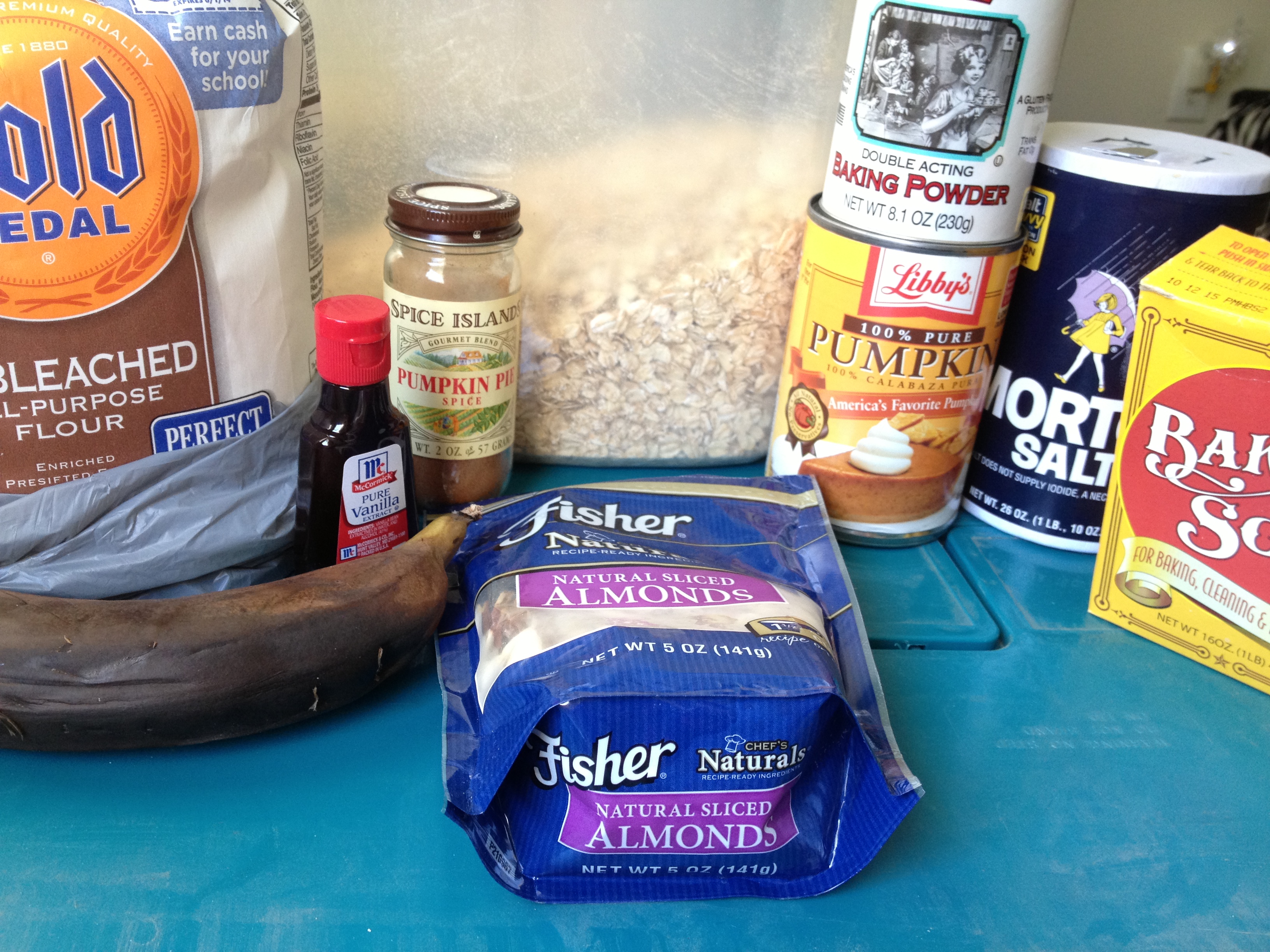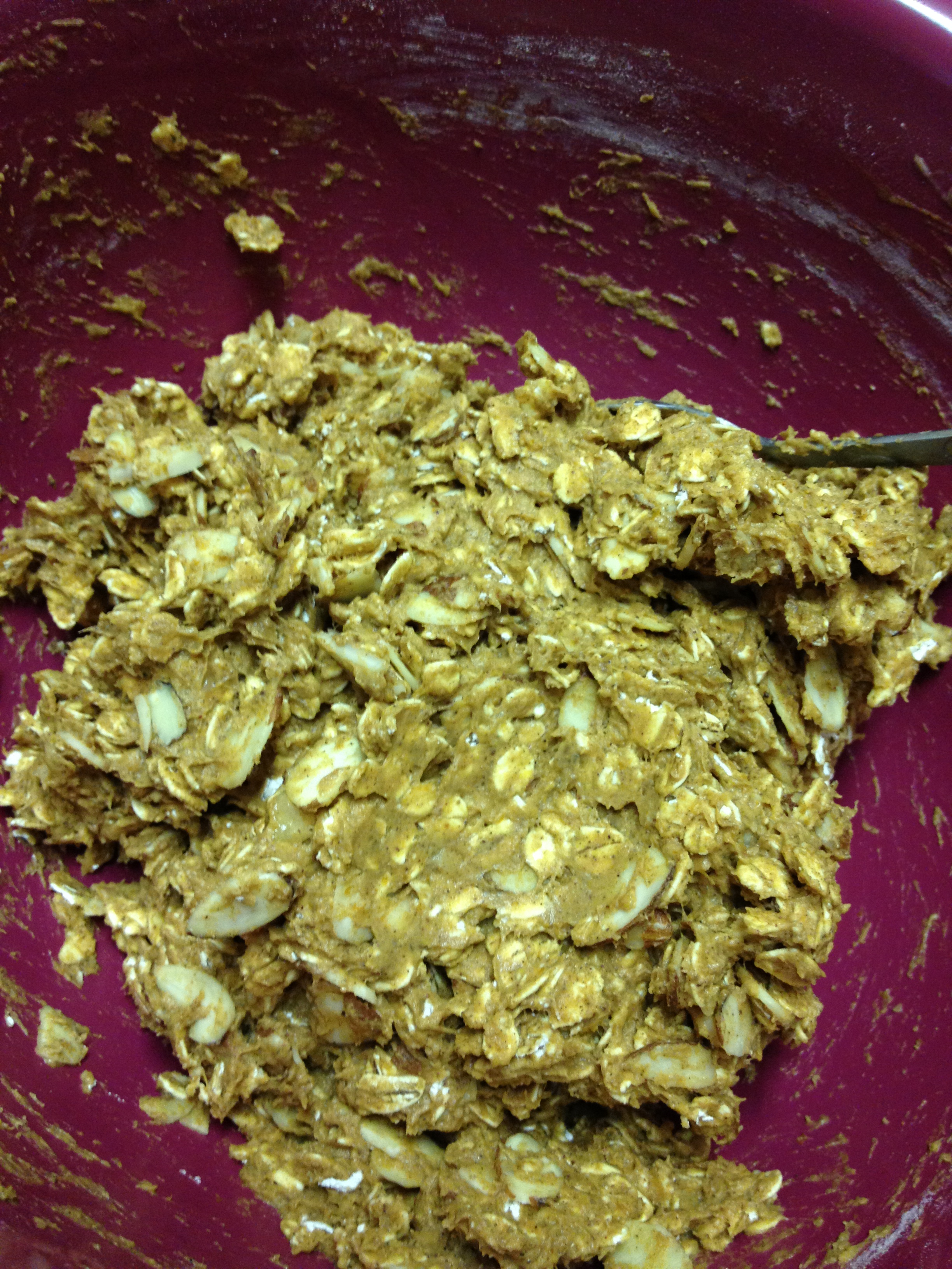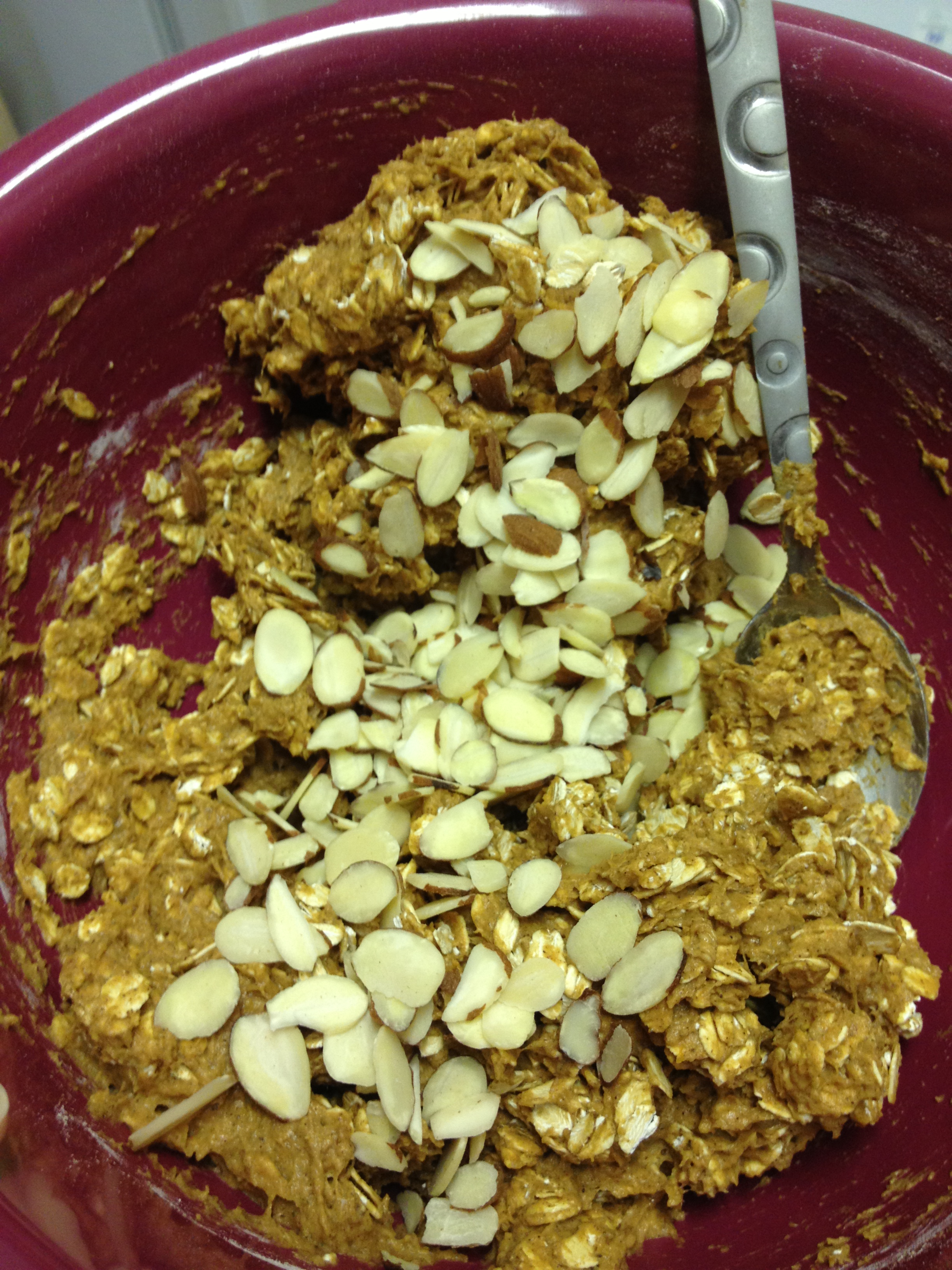 if it is now May-pumpkin time is reigning in my house! I switched out the normal date paste or applesauce for pumpkin and kicked out the raisins for…wait for it…Fisher’s almond slices! Oh man-new terrain here for me. I also didn’t feel like taking out my food processor to process some oat flour, so I used the all purpose that I had on hand. AND-no sugar. So I am not getting anything sweet out of this; it is purely for my eyes to see that I am having a snack, a cookie.