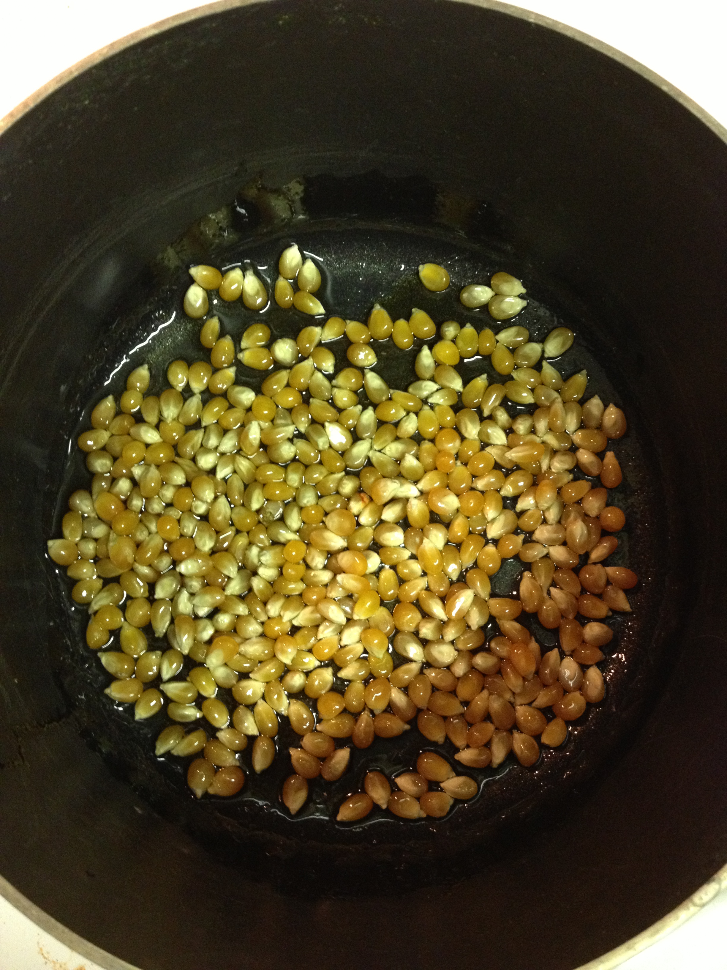 So all I did for this one pot wonder was measure and pour 1 tablespoon extra light olive oil and 1 tablespoon maple syrup in the pot and turn on high. Measured and poured in 1/4 cup popcorn kernels then put the lid on. I turned down the oven to medium-high, then I shook the pot to get all the kernels covered, then as they were-a-popping I shook the pot a little bit at a time. Keep shaking periodically until a few popping sounds come from the pot.