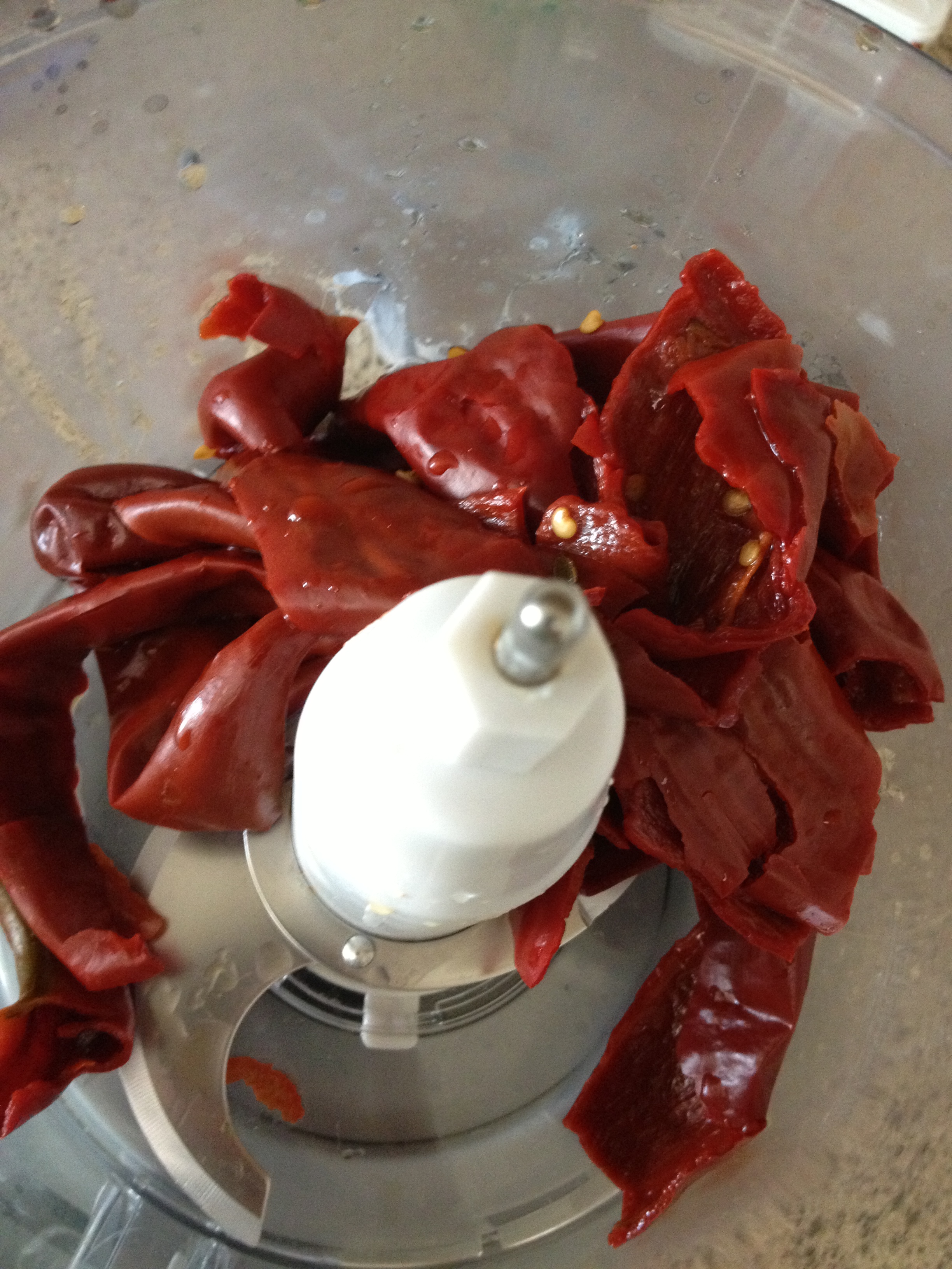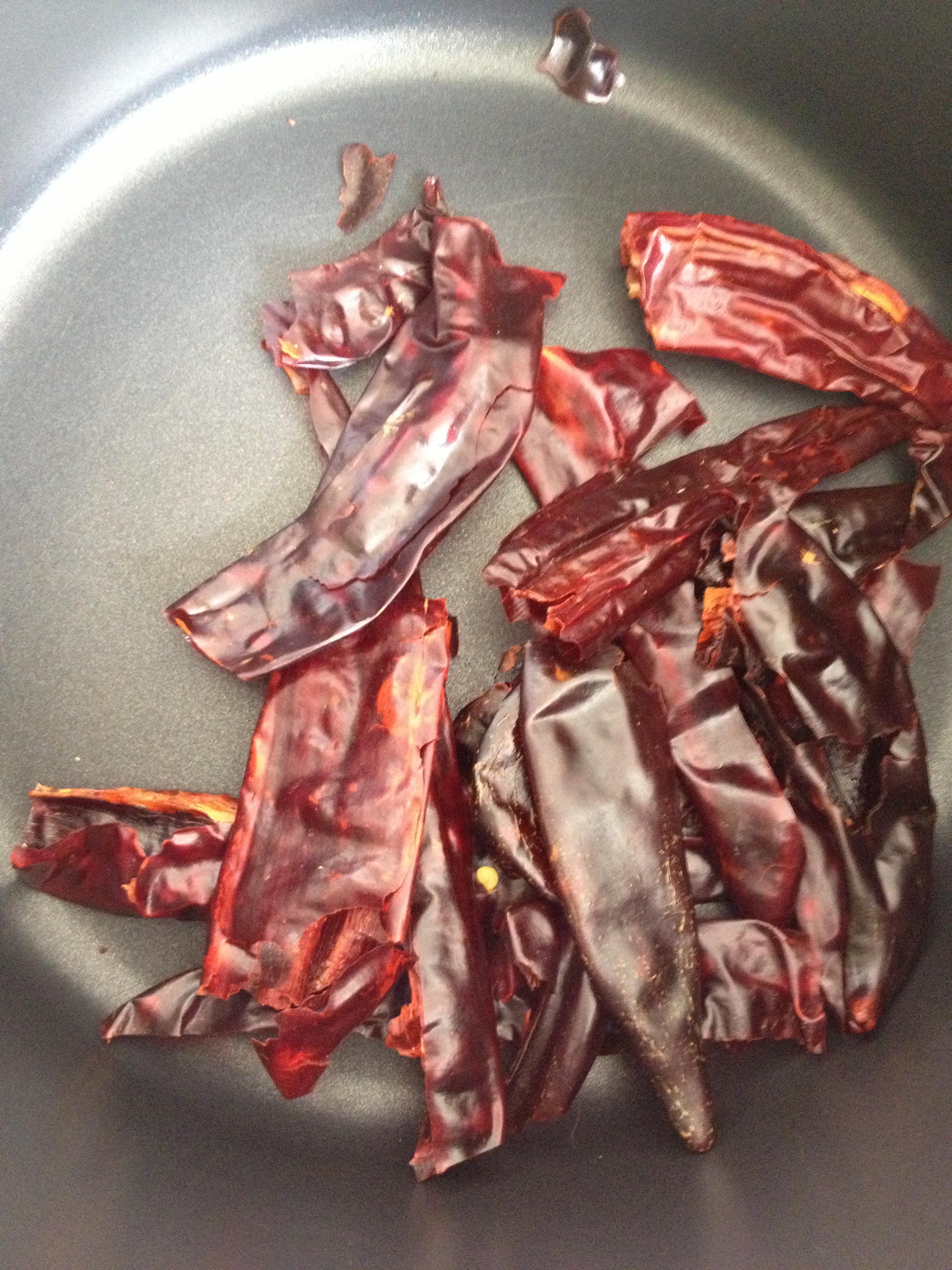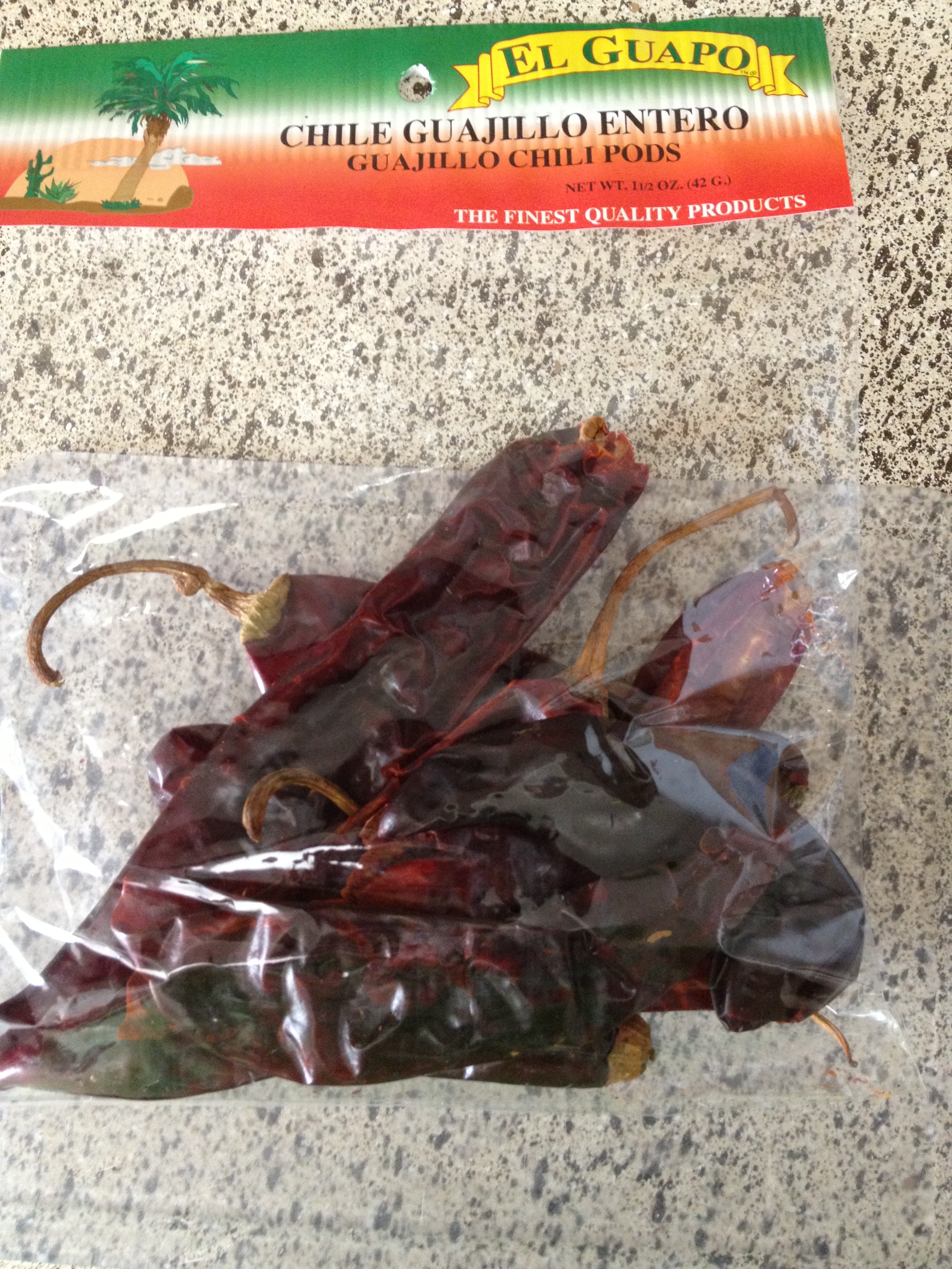So I randomly chose guallijo peppers-I thought they would kind of be like the ancho chili’s Rachael Ray would reconsistute on her 30 Minute Meals show. I had to read up on the guajillo pepper to find out how to reconstitute them and what the flavor is-spicy but fuity is what the site says. I found this helpful site and it lists every dried chili and was really helpful. I thought it would be harder to reconstitute something but it isn’t. I wish I had thought beforehand to pick up rubber or plastic gloves to cover my hands-I had a VERY bad experience once with I didn’t have any on and was cutting peppers and then rubbed my face and eyes after washing…ouch! I had to use a plastic bag to cover my hand. It worked.
