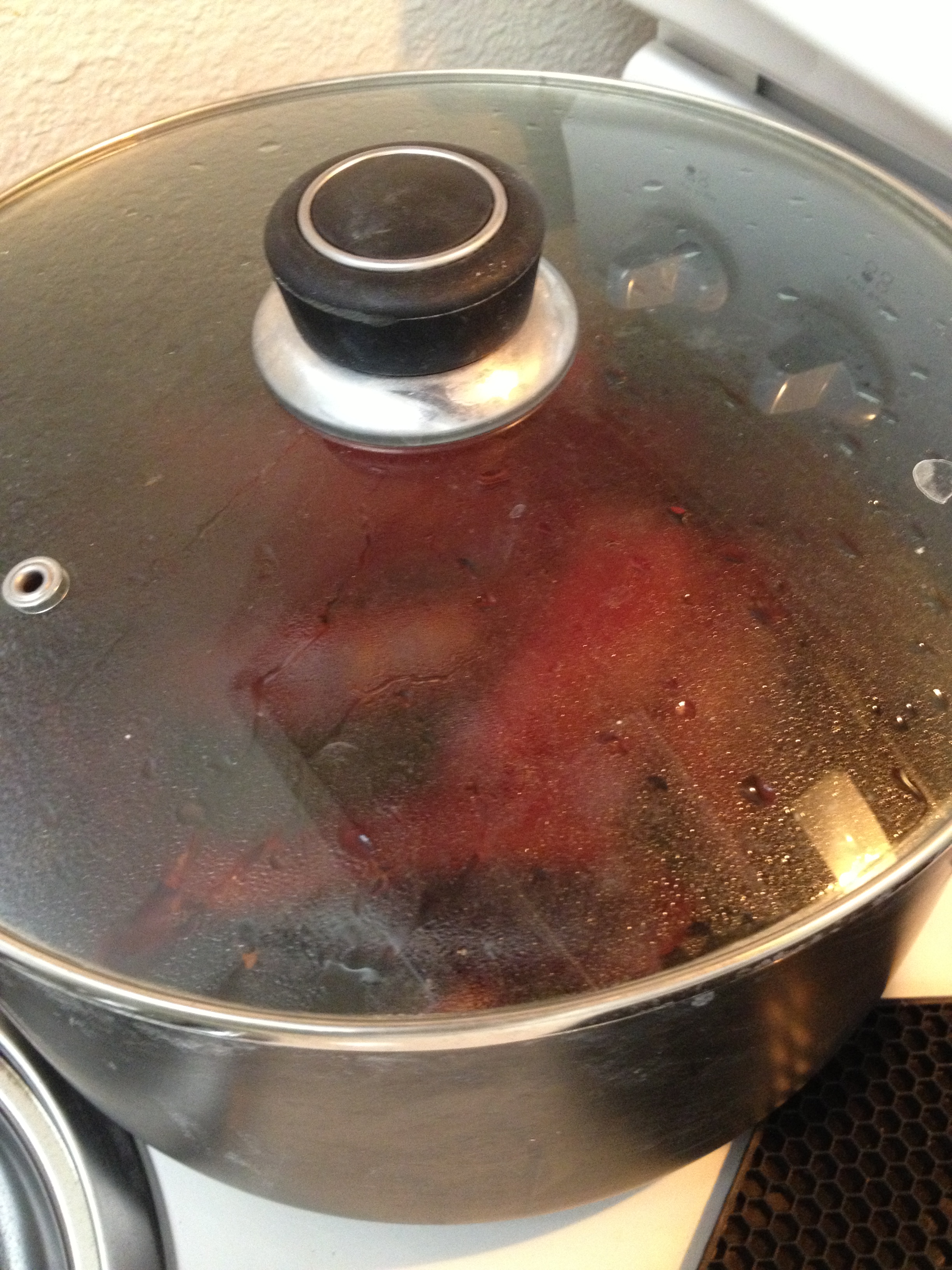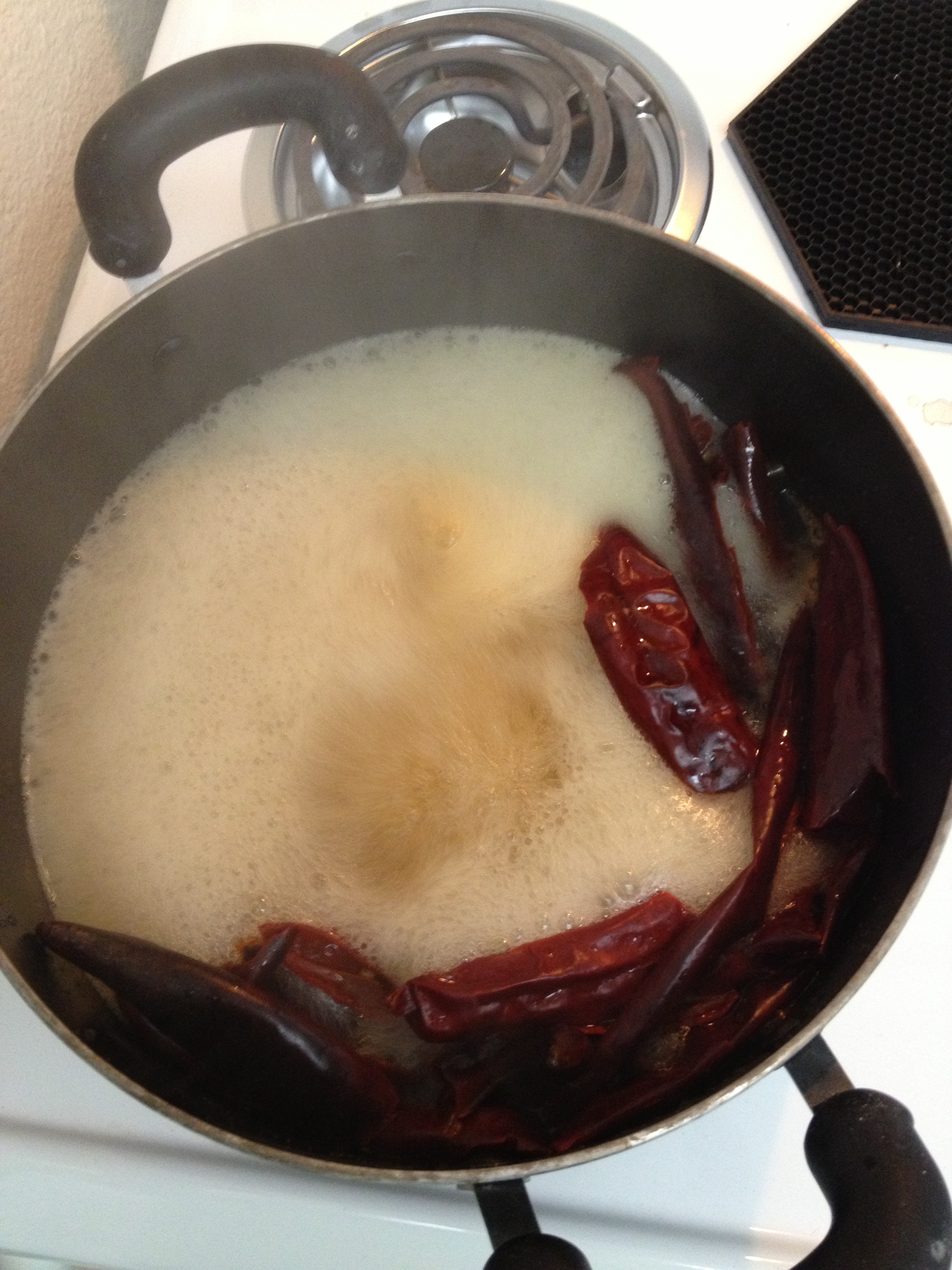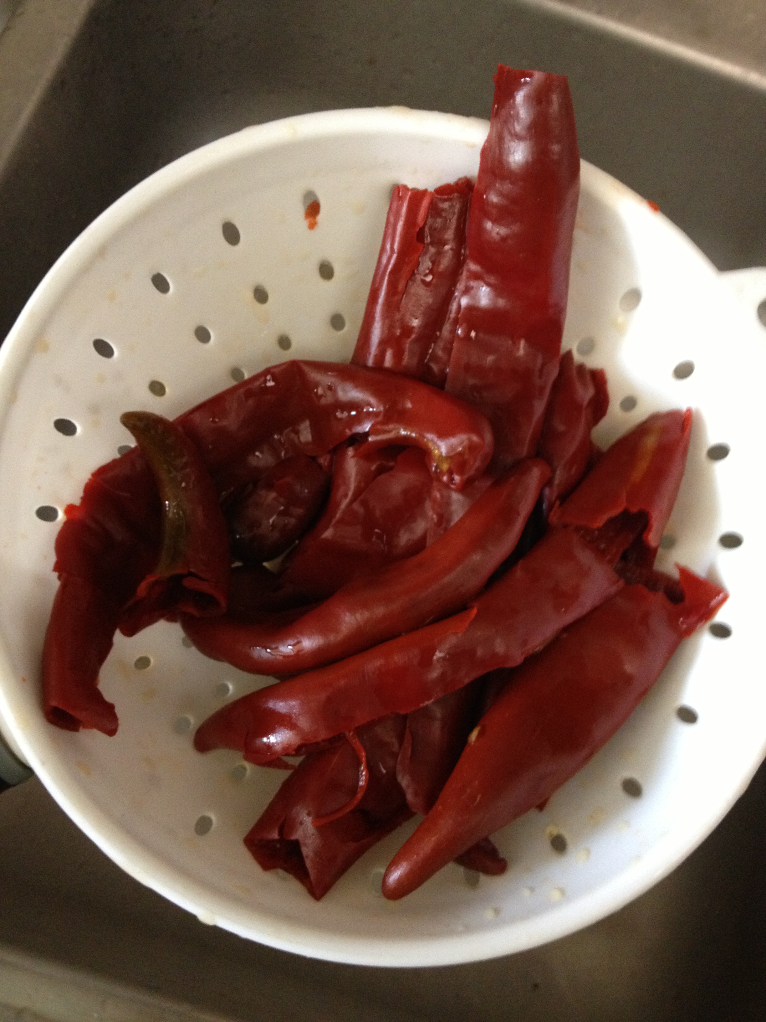 So I randomly chose guallijo peppers-I thought they would kind of be like the ancho chili’s Rachael Ray would reconsistute on her 30 Minute Meals show. I had to read up on the guajillo pepper to find out how to reconstitute them and what the flavor is-spicy but fuity is what the site says. I found this helpful site and it lists every dried chili and was really helpful. I thought it would be harder to reconstitute something but it isn’t. I wish I had thought beforehand to pick up rubber or plastic gloves to cover my hands-I had a VERY bad experience once with I didn’t have any on and was cutting peppers and then rubbed my face and eyes after washing…ouch! I had to use a plastic bag to cover my hand. It worked.