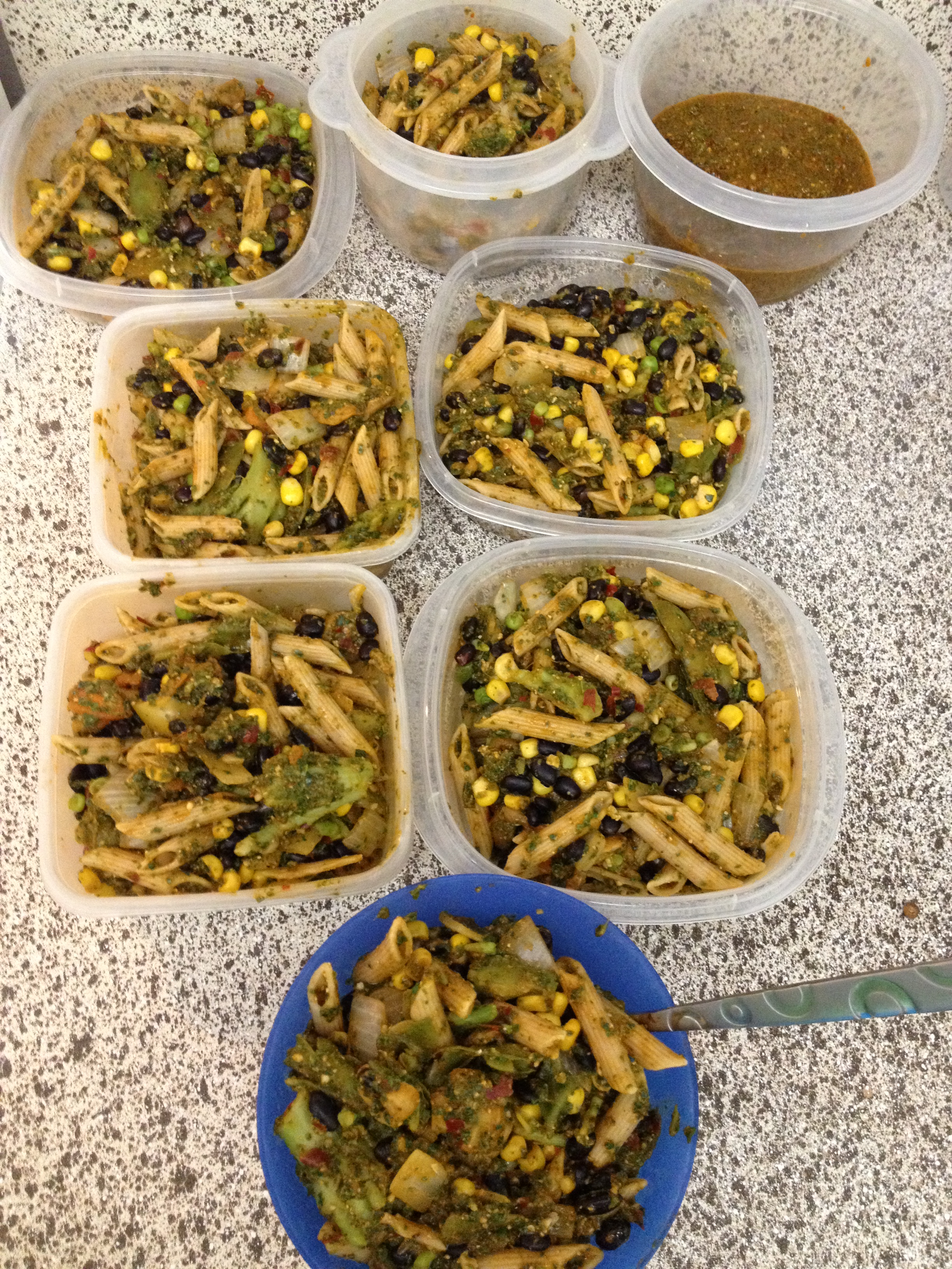Once the water in the pot starts to boil, add the noodles. When veggies and noodles are done, drain and set aside. Rough chop the onion and with a little oil add to pot. Let cook for two minutes then add corn and mushrooms and heat them through. Add veggies, noodles and beans. Slowly add pesto and mix. I used only 2/3 of the pesto and froze the rest. I will say that it wasn’t to spicy so I would have added more seeds to get more flavor. Also, it is best the same day not as good as leftovers as my other meals, but still good. Awesome that day though. So my Dollar Tree meal for seven meals plus leftover pesto was only $8 from DT, I had the spices and noodles already and only bought the kale and cilantro-an extra $1.07. Whoop!
