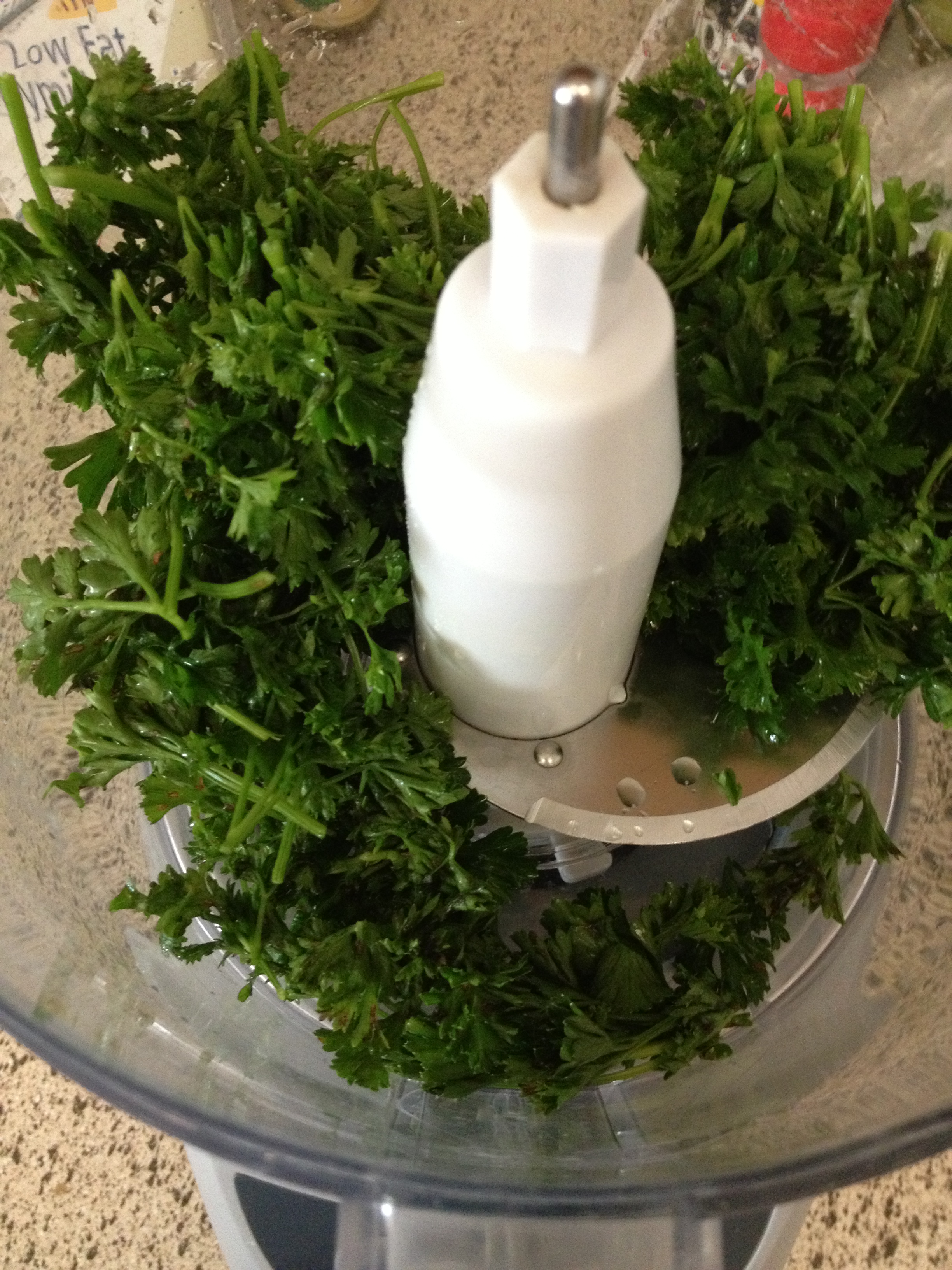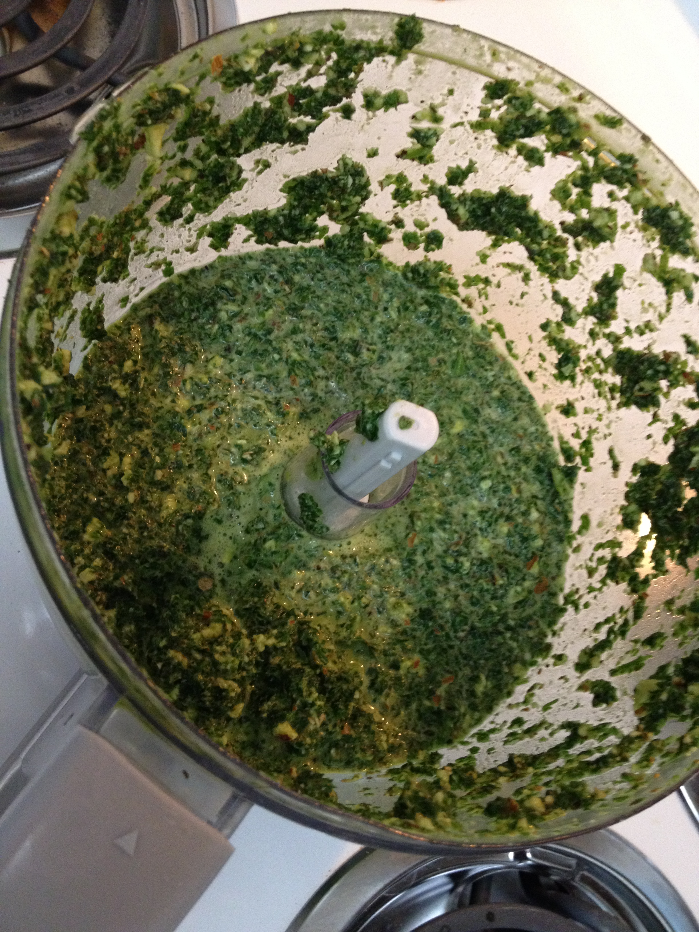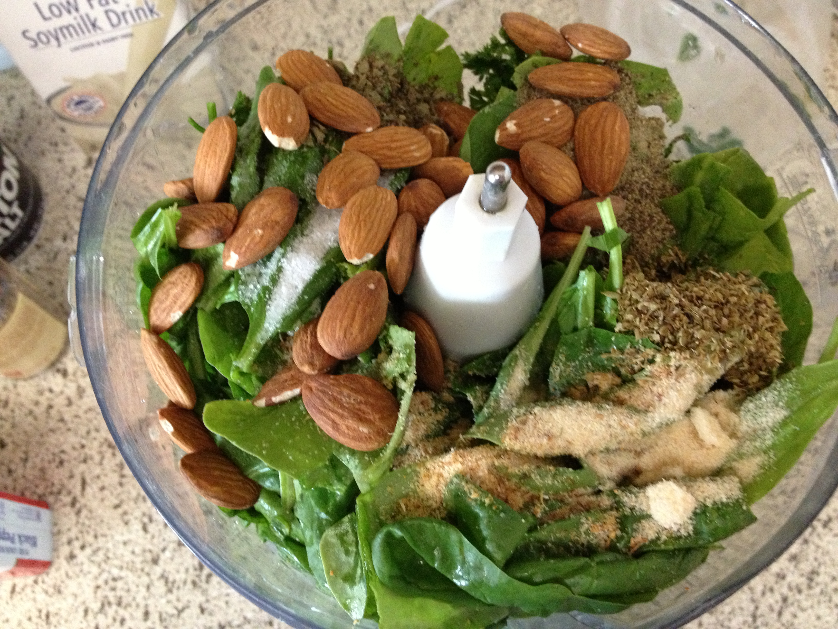 For the pesto I tried to think of what I wanted in it this time, and was still related to summer veggies. What did I come up with? Parsley and spinach. What an awesome combo! All those spinach greens and the fresh parsley were amazing, and made me think about just sauteing some parsley and spinach for a quick dinner during the week! For the nut factor in the pesto I used un-blanched almonds…yes, un-blanched. Every recipe you read that calls for a nut, you need to blanch them. Well I knew I was going to need something with a little more texture with sautéed veg and noodles, and a food processor and almonds was just the thing.