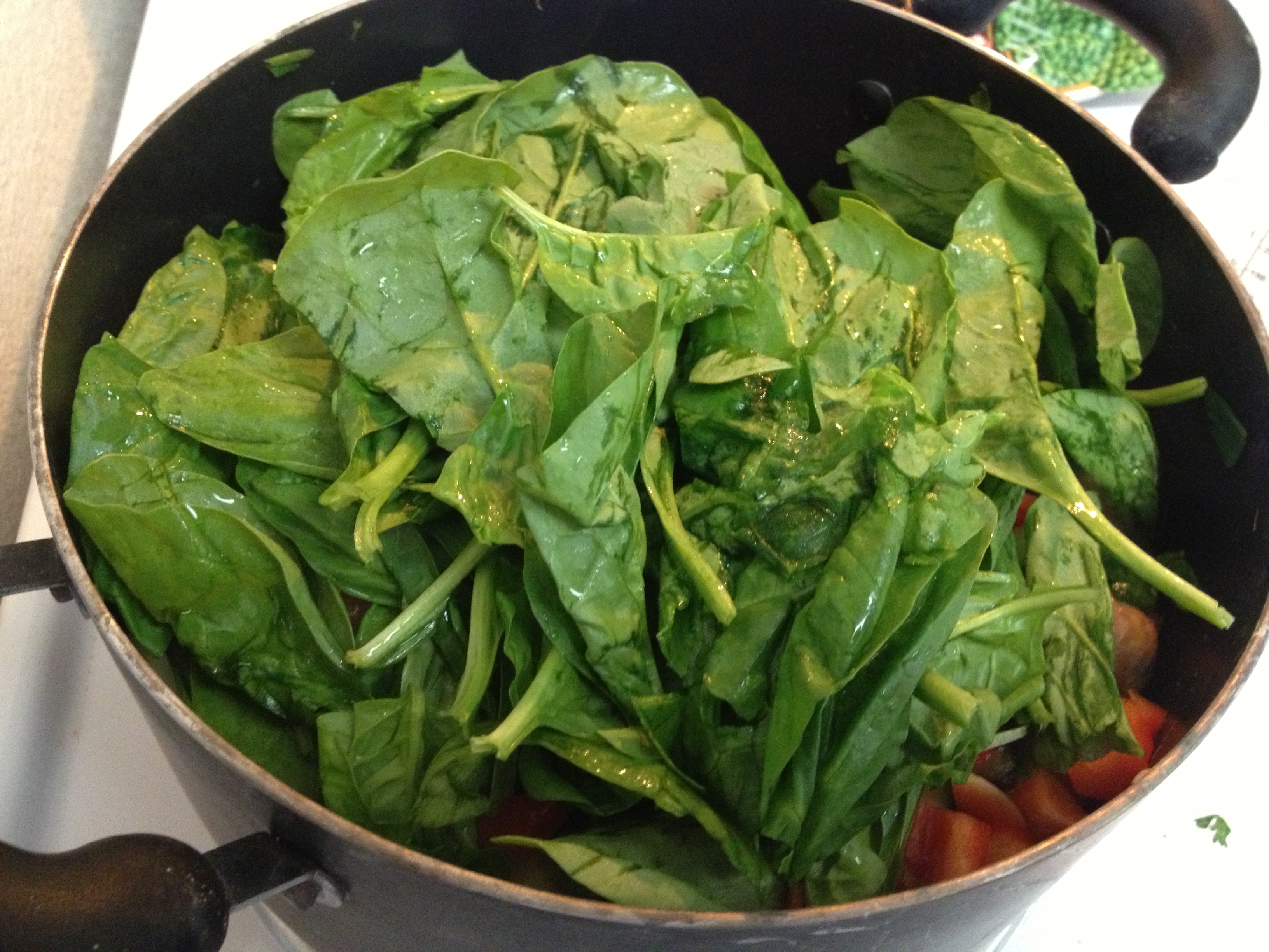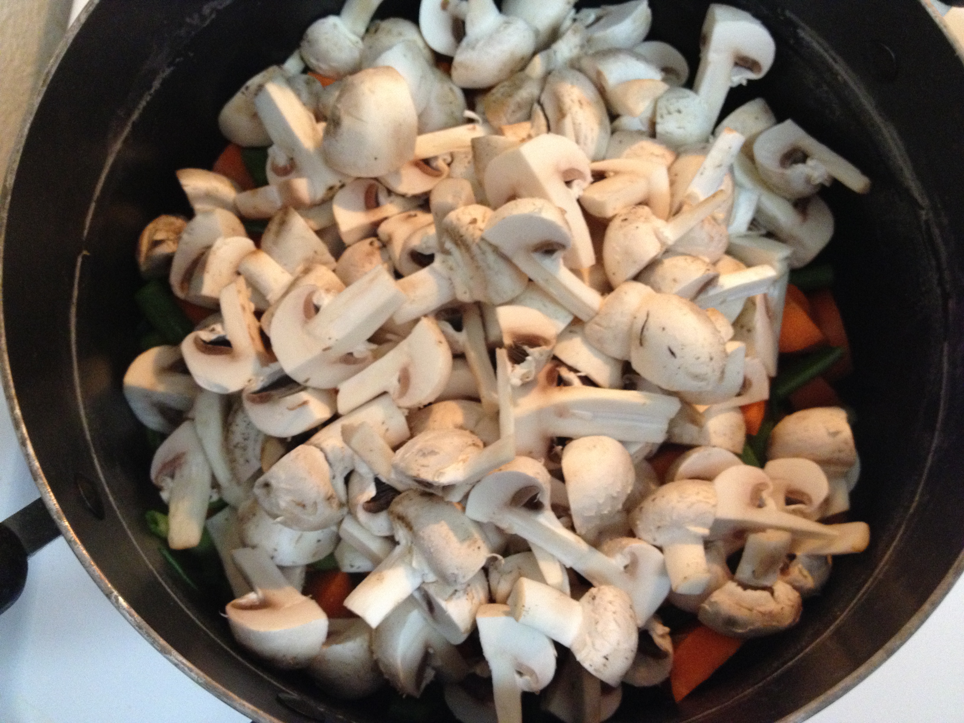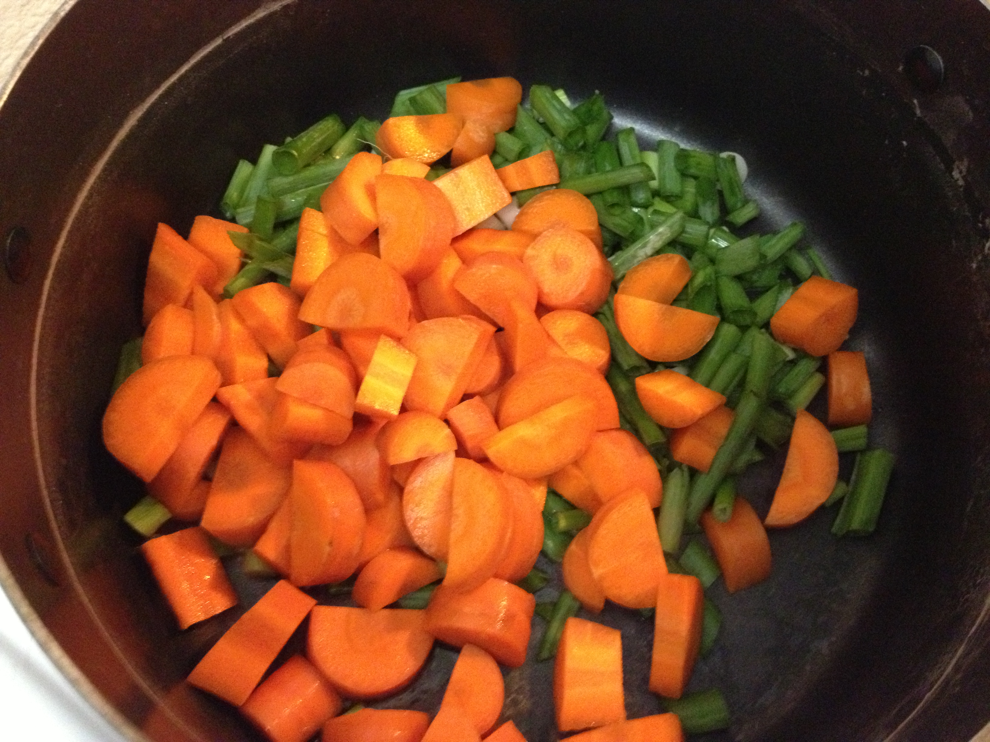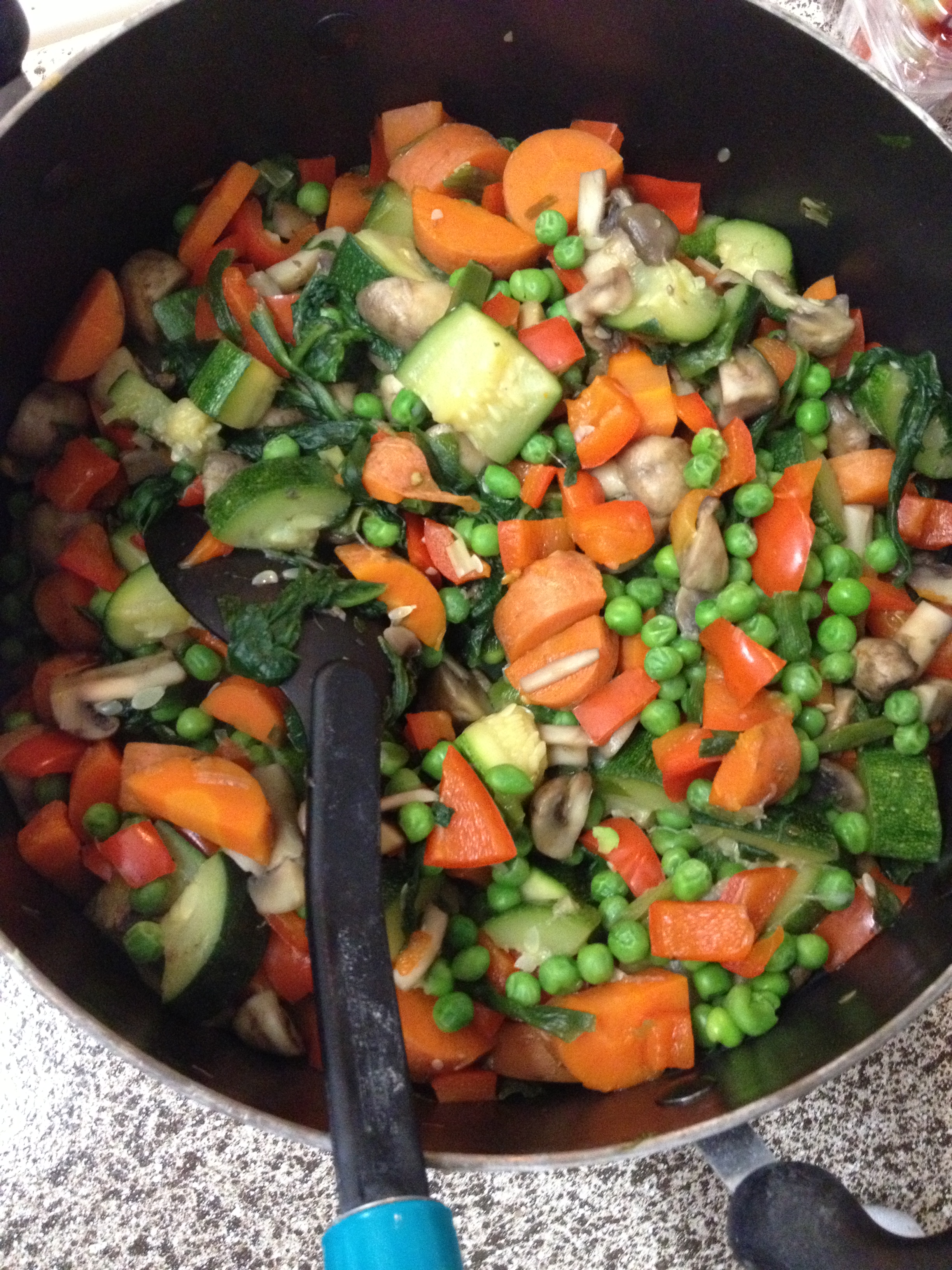 This is another of the one-pot wonders. I had gotten my big pasta pot out and boiled up a bag of large macaroni noodles. I didn’t want this “pasta” dish to be about the pasta. I wanted to have mostly veg and little noodles. I think the choice of large macaronies was the best option. You get your carb fix and still the good calories of the veggies.