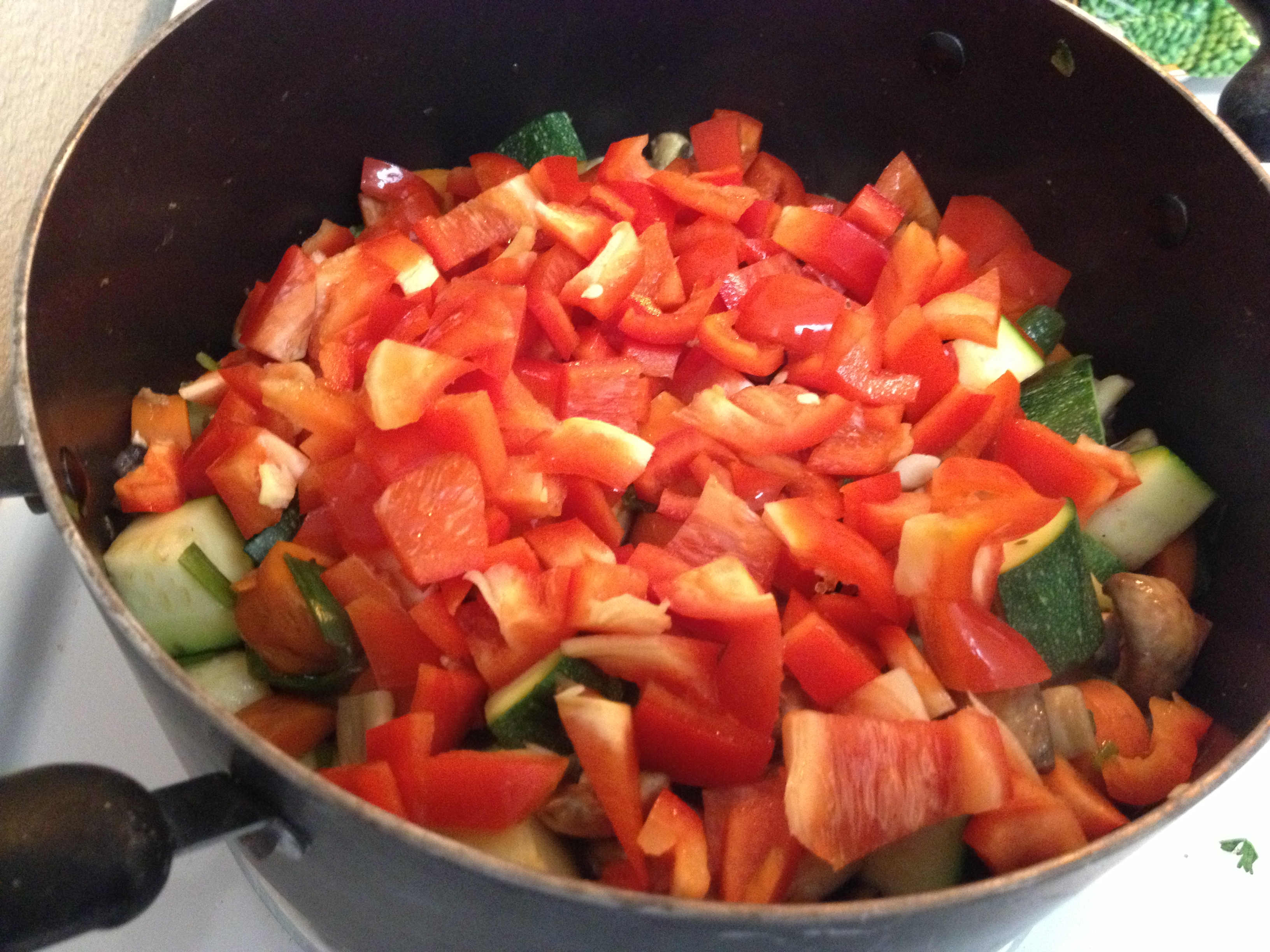 This pot has everything to do with consuming the end-of-summer veggies in bulk without a lot of fanfare. I was originally going to not do anything to the vegetables, just have them raw, but with week-long meal making veggies tend to go watery or bad pretty quick so I switched it up a little. I sautéed the veggies, but it was just a quick saute. I started cutting veggies and dropped them all in the pot. Total time wise I probably only had the veggies in the pot for about 20 minutes. All veggies still had crunch and good texture.