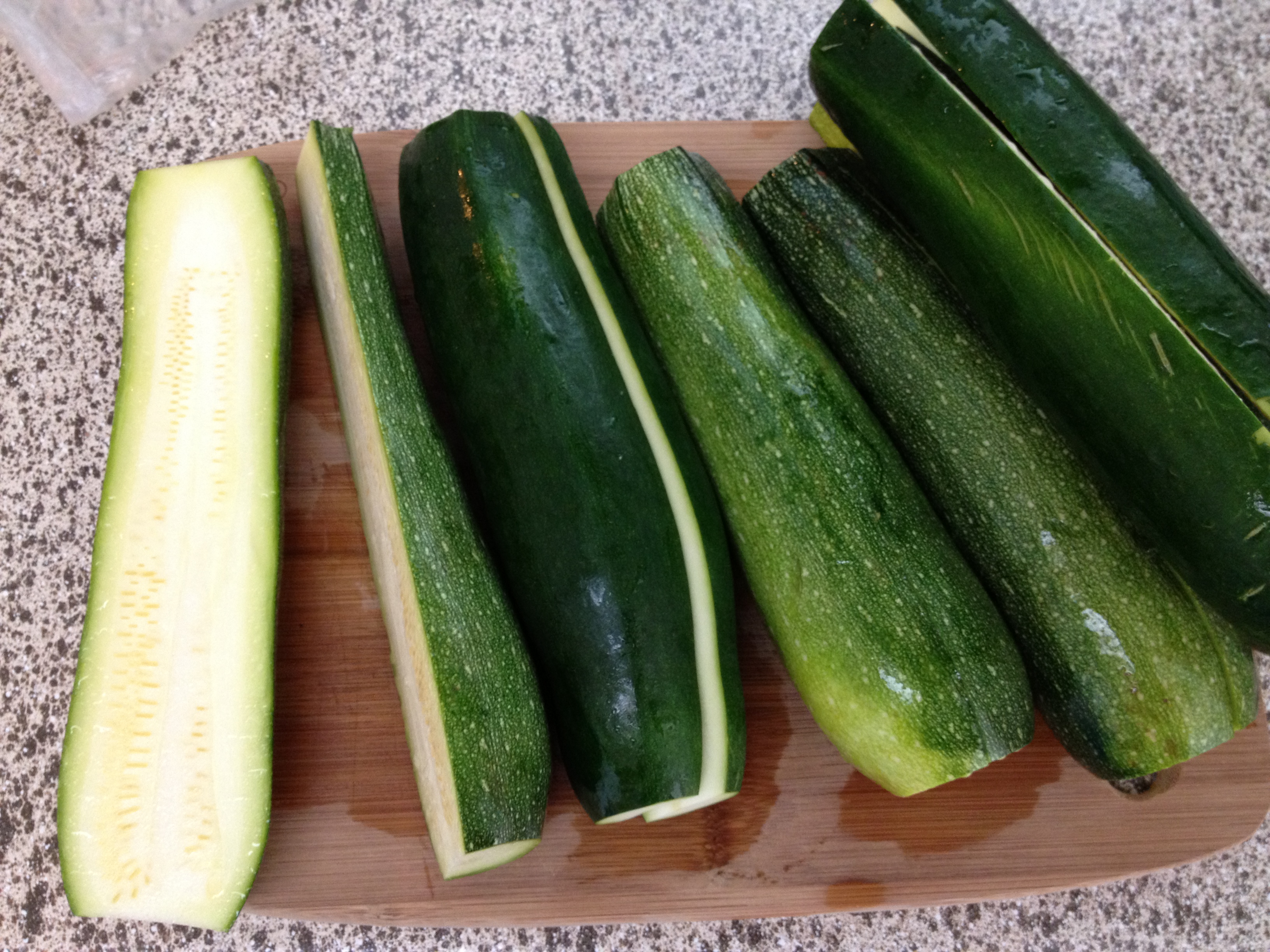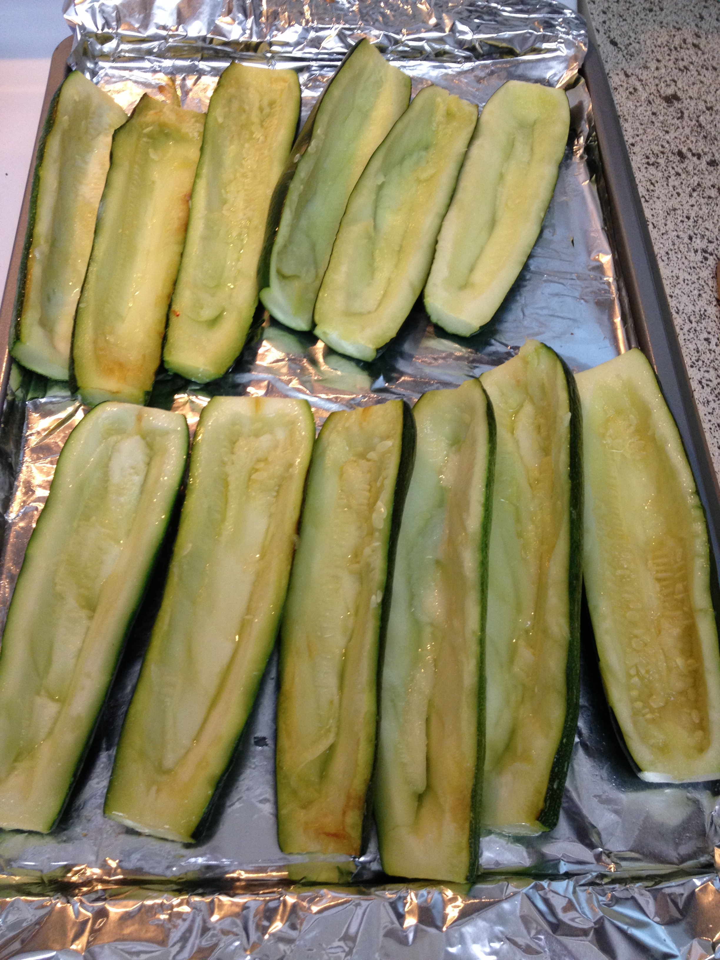 1. Wash and halve zucchinis. Lay tinfoil over baking sheet. Spray halved zucchini with olive oil or Pam.