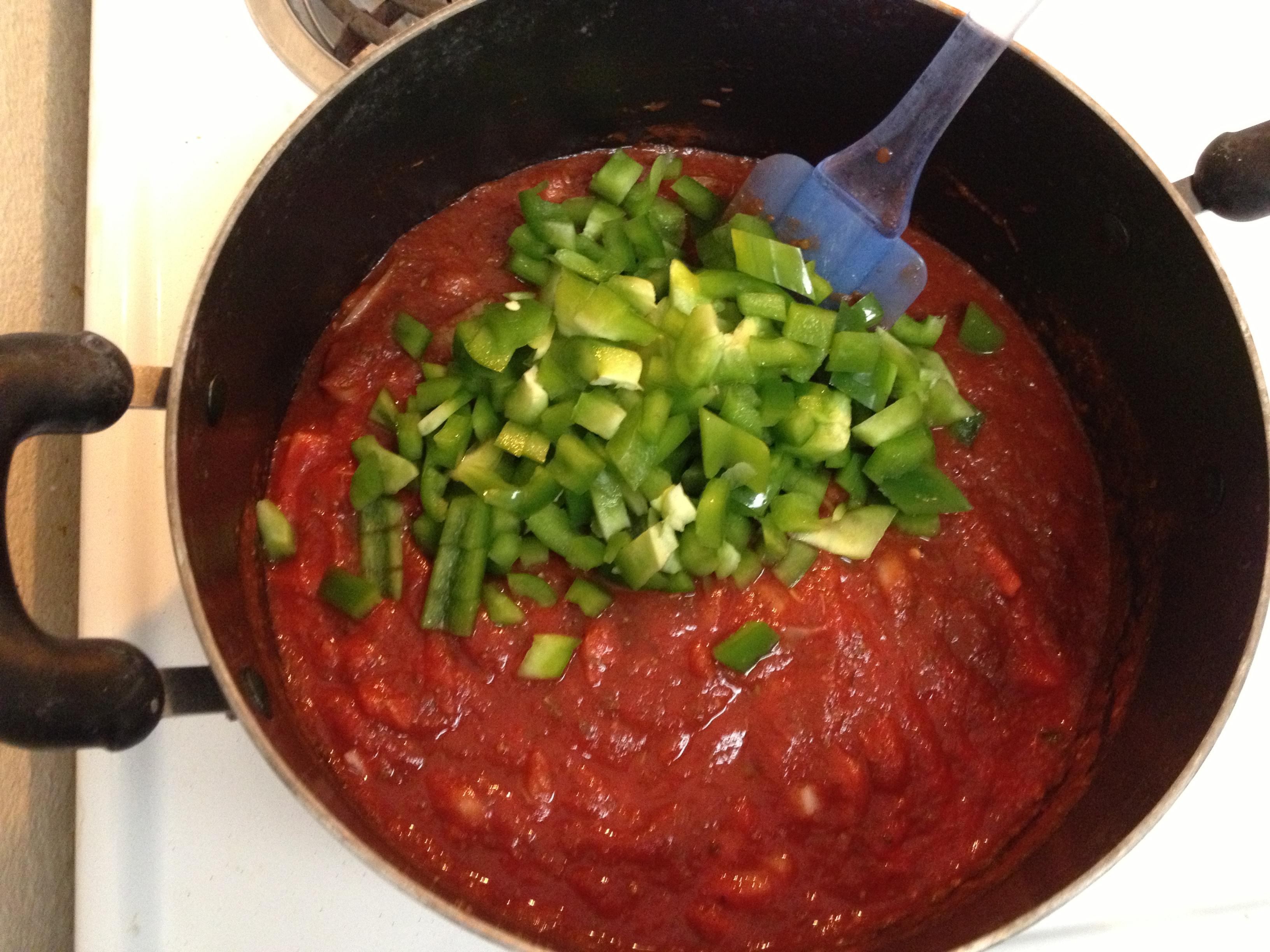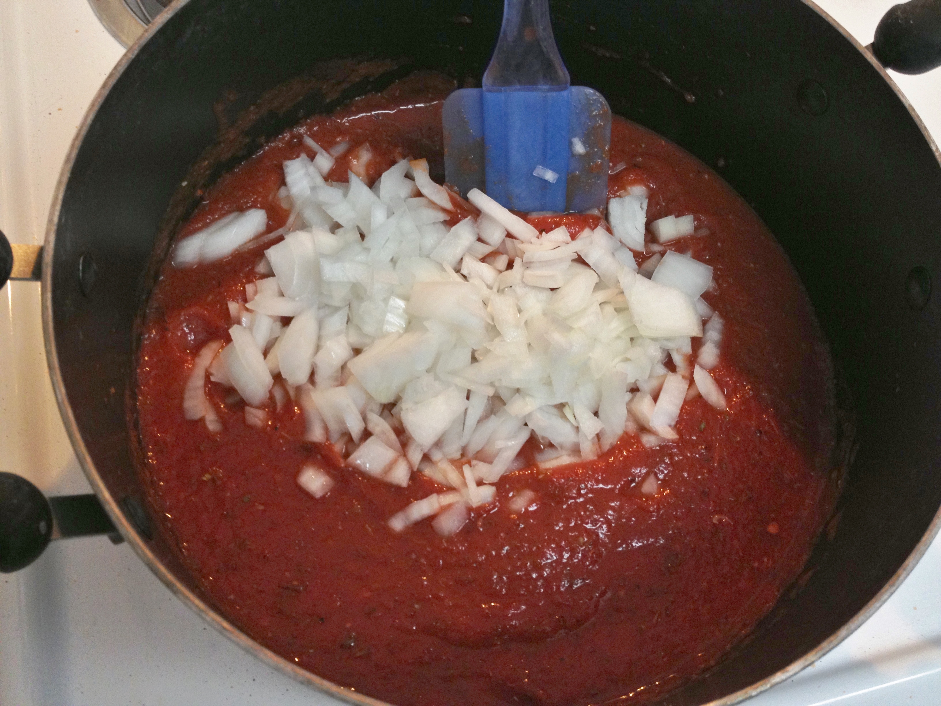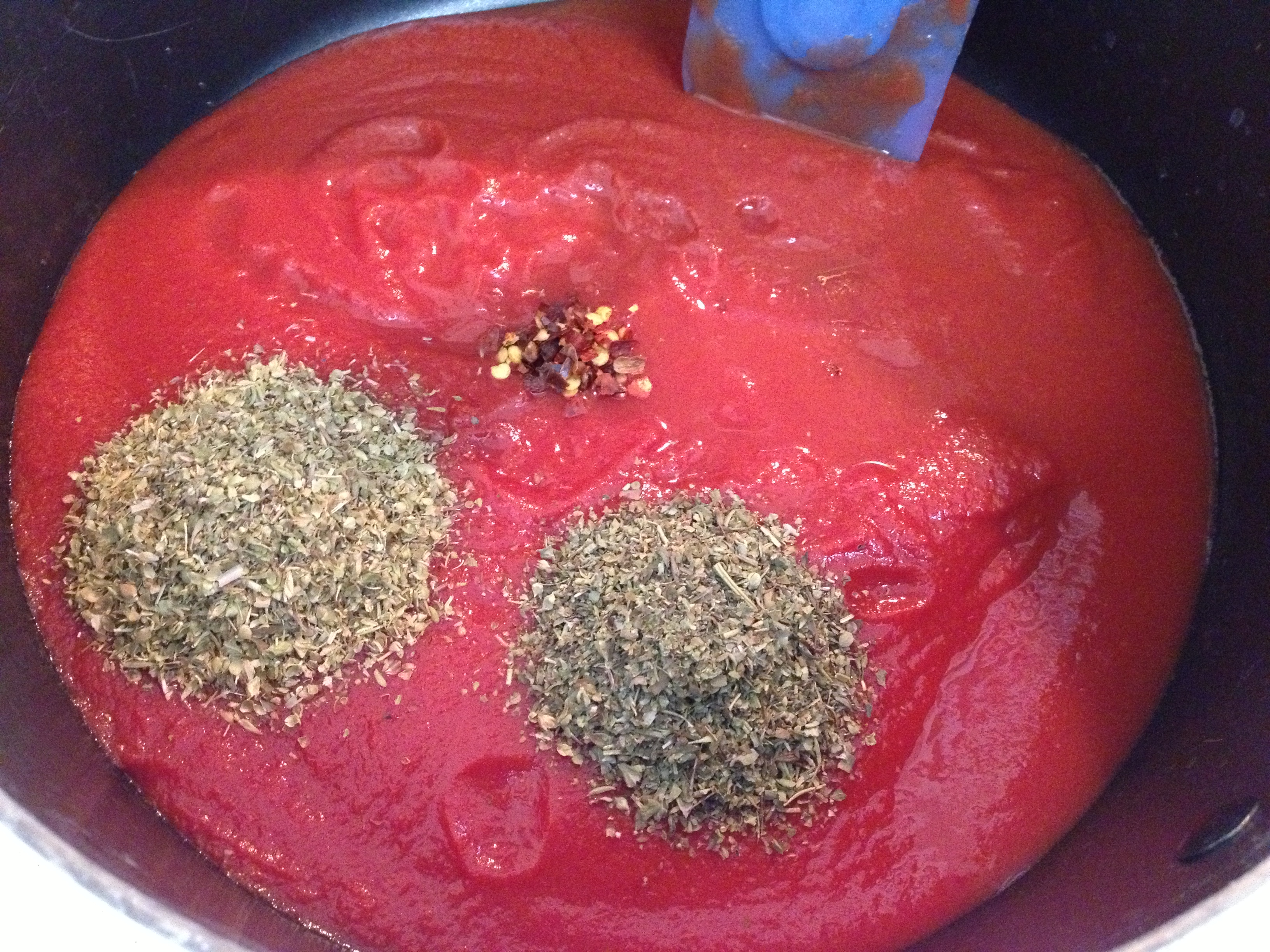 3. While zucchini are baking, put a large pot on burner and pour in tomato sauce and spices. Bring to a boil then lower to simmer.