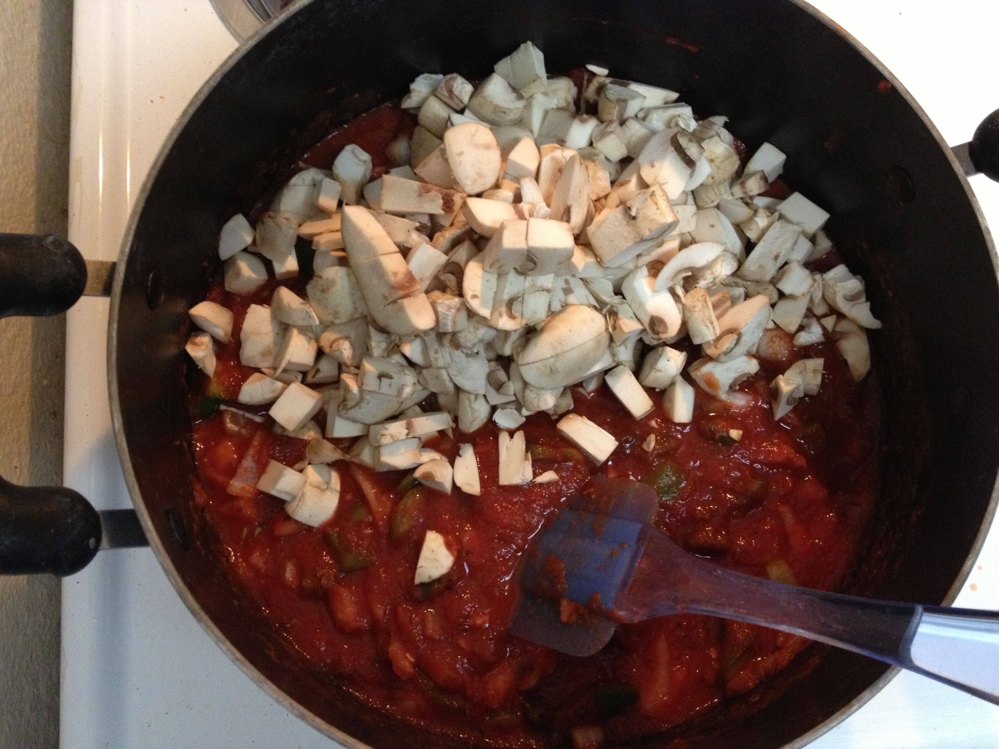 For these boats, I just halved the zucchinis and baked cut side down for 20 minutes. While they were baking I started the sauce. Simple sauce of tomato sauce and a few seasonings. Brought that to a boil while mincing half an onion. Lowered the heat then added the onion, then pepper, then mushrooms. Let that cook together and added the water to thin it down a little.