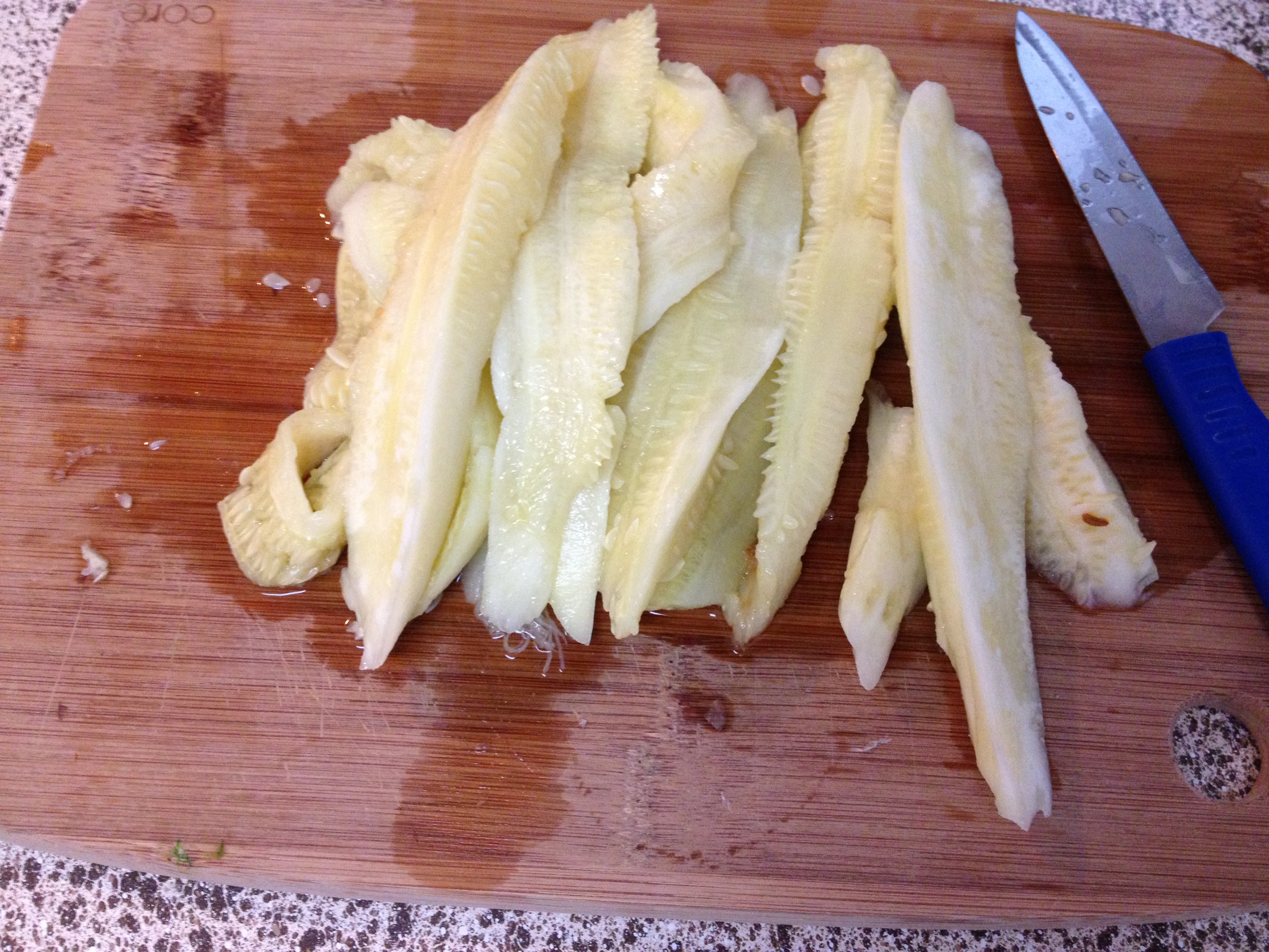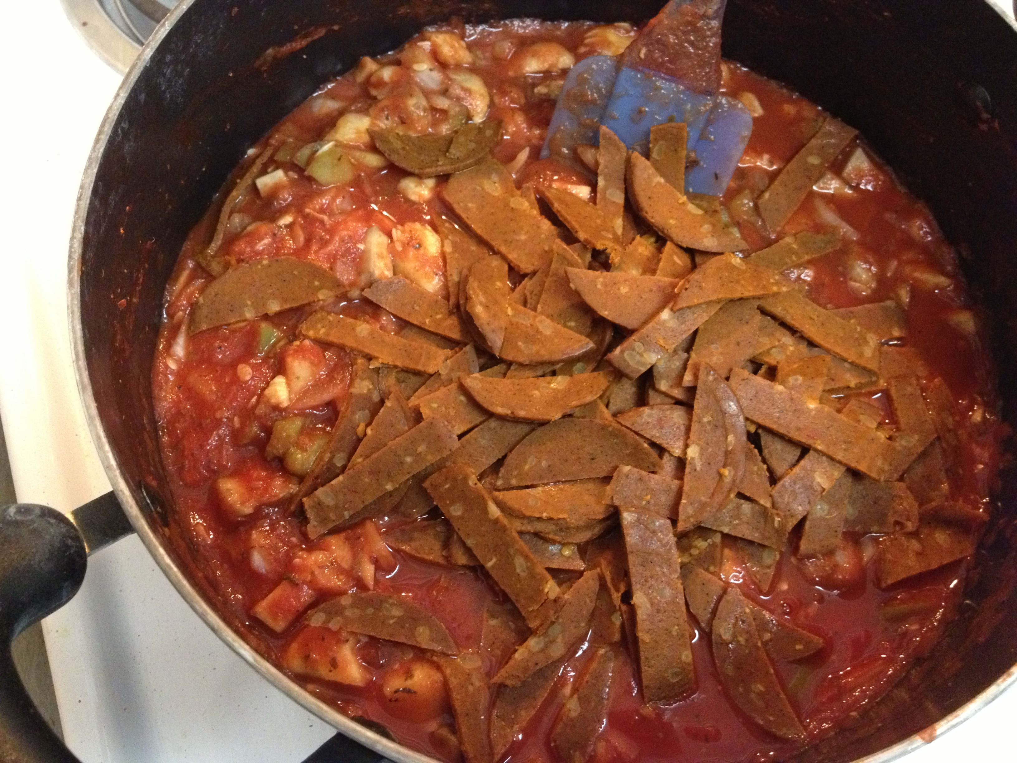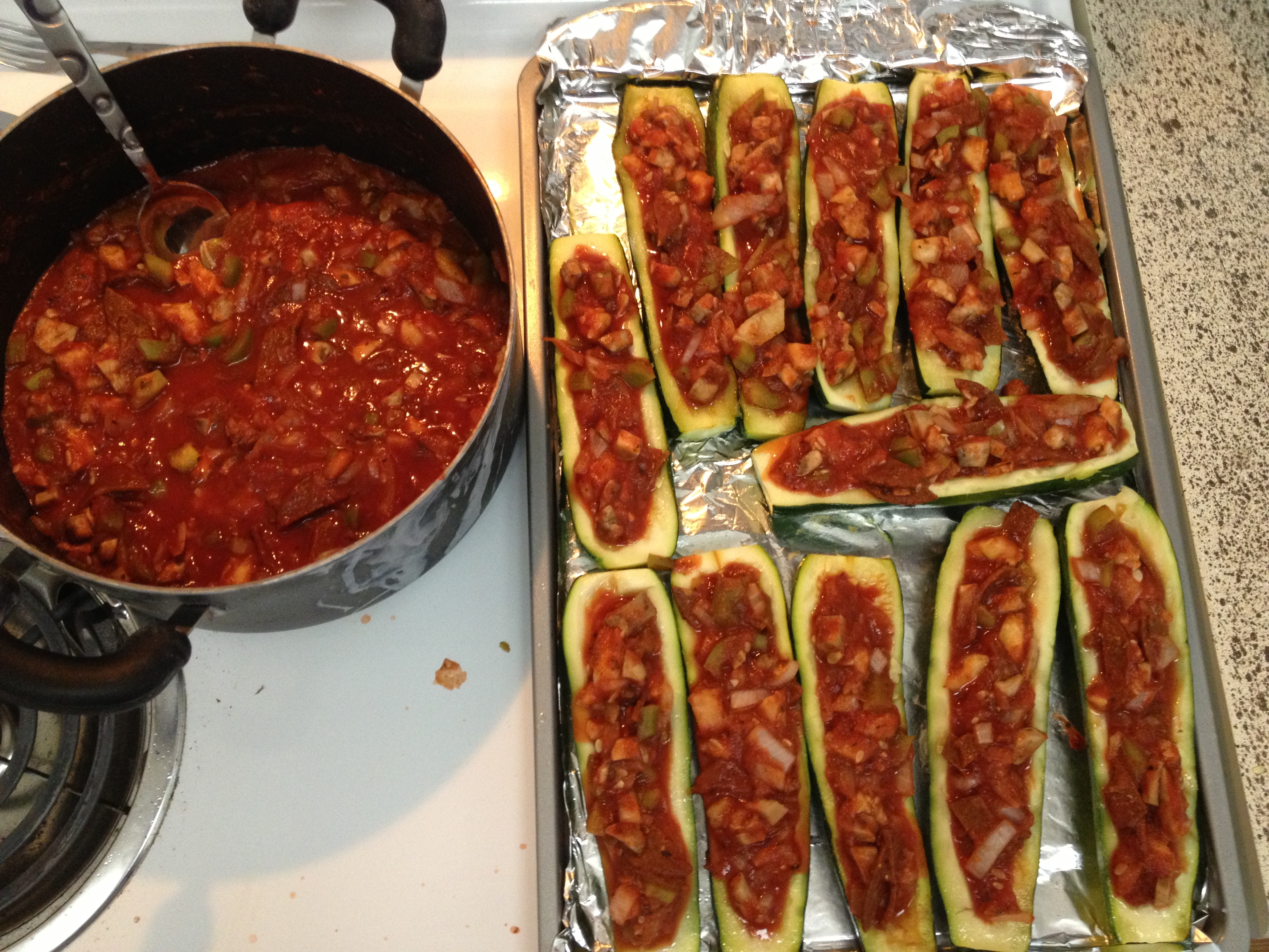 After the zucchini’s were out of the oven and cooled a little, I hollowed them out with a small paring knife. Cutting those centers out is like cutting a Subway sandwich. You cut in at an angle all the way around. The middles were just a little hard which was perfect. I minced up the innards then put them in the sauce also. While the sauce continued to cook I cut the Tofurky Pepperoni Slices into strips then added those too.