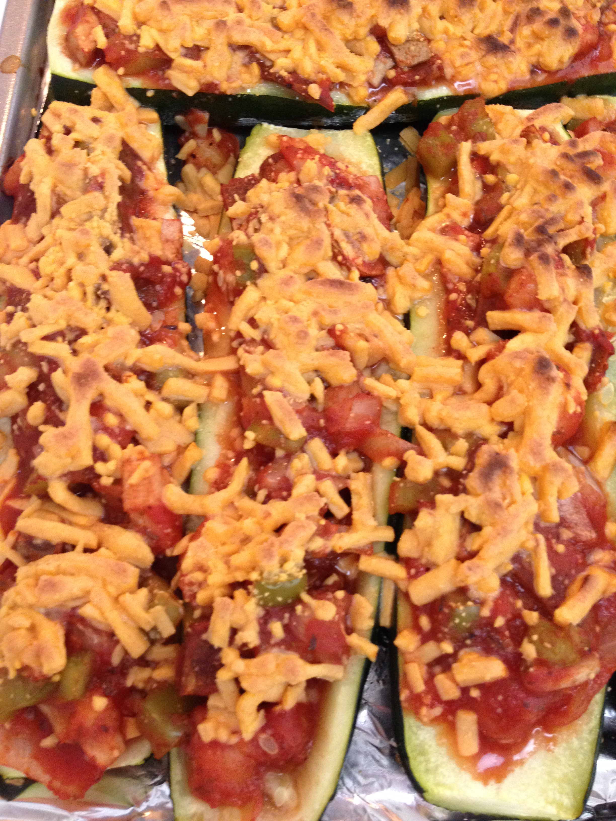After adding the pepperoni I just stirred really good then turned the burner off and turned the broiler on. With everything already cooked through, the broiler was all that was needed to finish the cooking. Using a smaller spoon I dropped spoonfuls into the boats. There will be a lot of left over veggie-sauce but I will enjoy that at a later time; it is freezer bound. The last step before broiling was adding Follow Your Heart Cheddar Shreds. Broil for five minutes.
