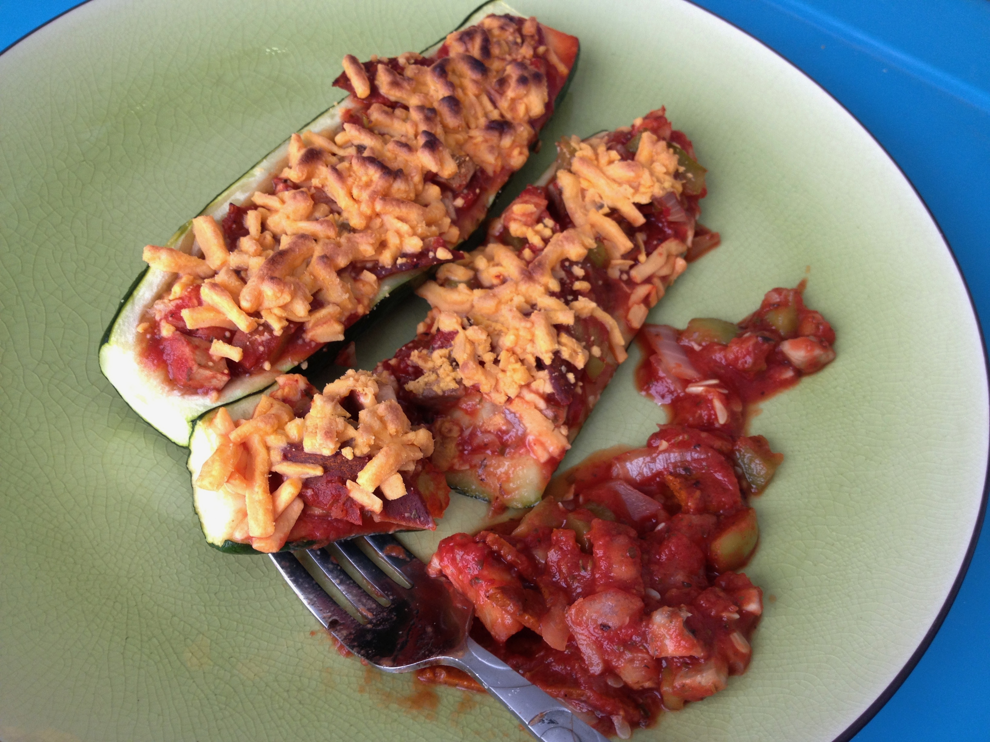 Kind of genius if I do say so myself. The amazingness of a good veggie pizza in the hollowed-out center of a medium zucchini. I am so happy for zucchini boats! I have seriously been having a pizza hankering, and since I didn’t end up getting that for my birthday dinner and my clean eating diet is back on the right track, I knew there was no store bought pizza going on in my near future.