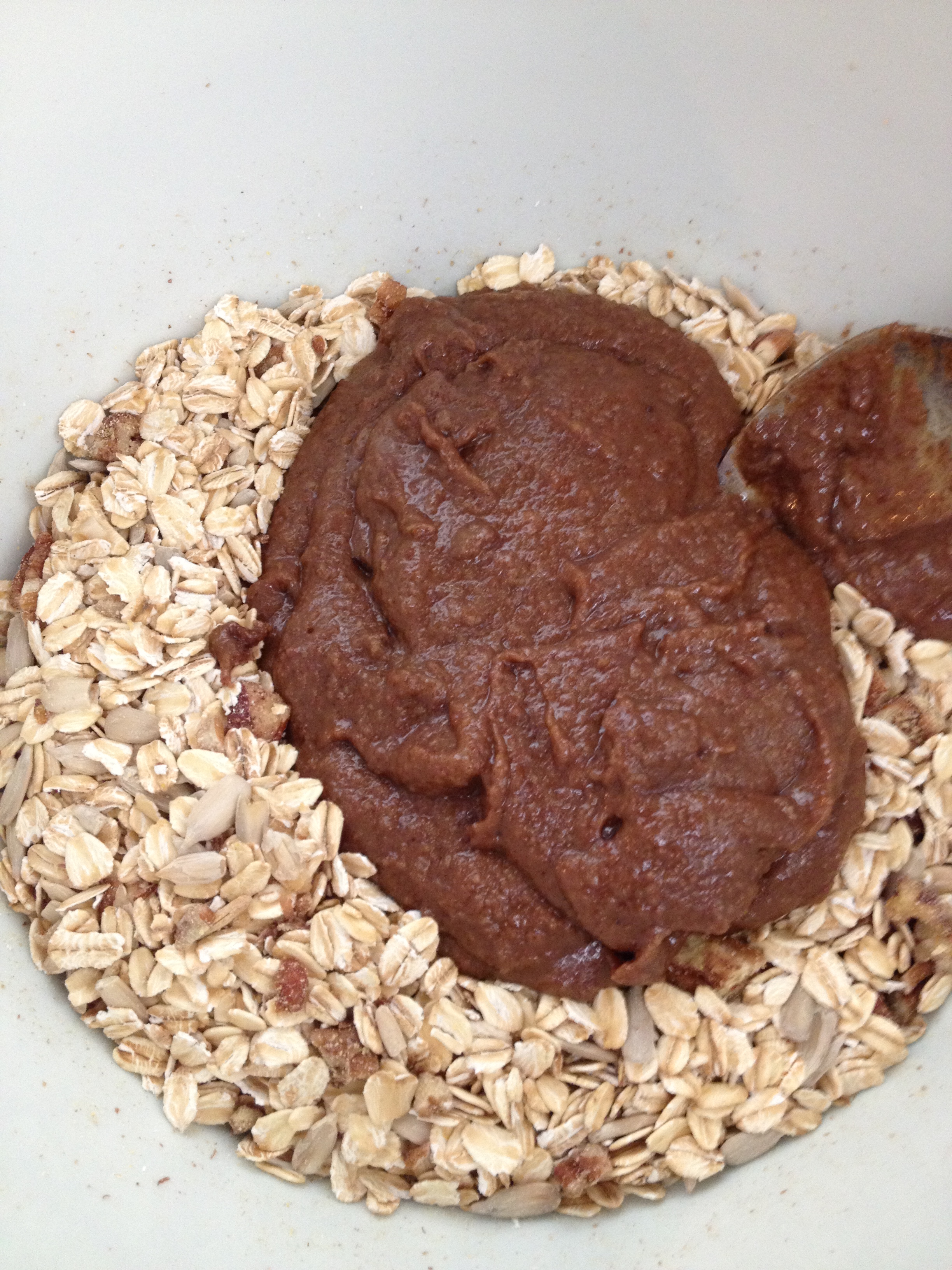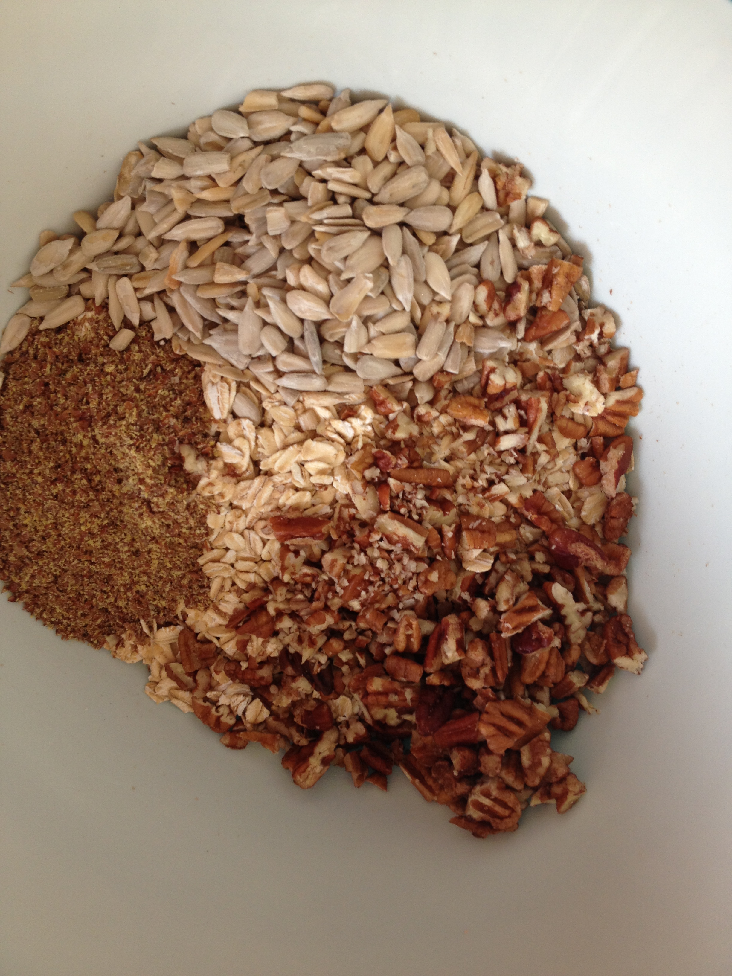 2. Pour Oats, nuts and flax-seed into large bowl. Combine.