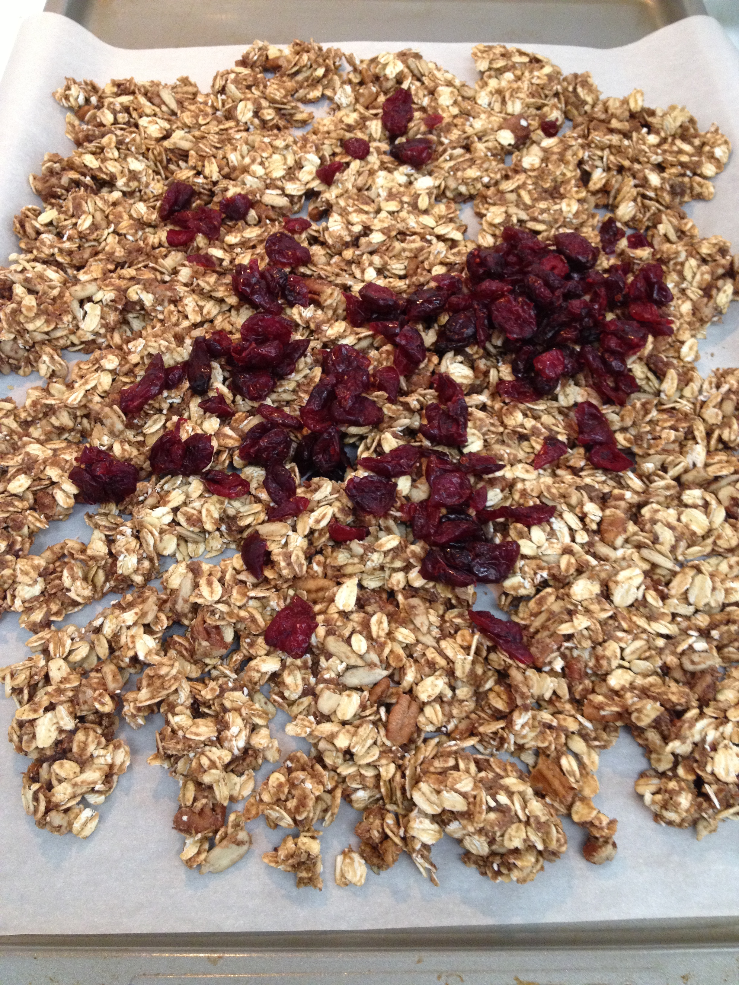 7. Take out of oven and pour craisins over granola and carefully mix, then pat down again.
