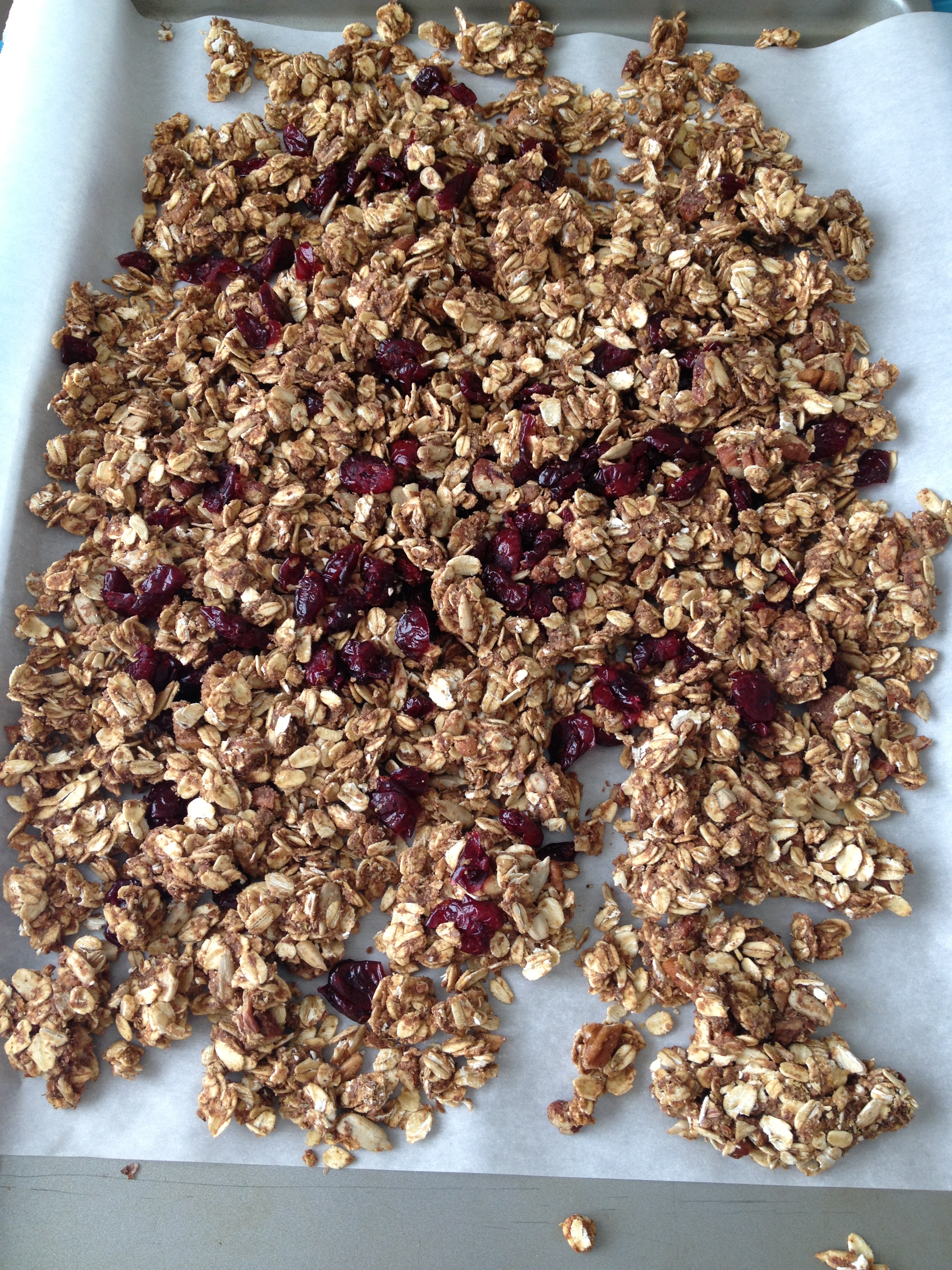 So I pretty much followed my last granola recipe, but baked at different times. Started with 20 minutes, then mixed in the reduced sugar craisins and baked for another 25. Oooh, just the way I love granola – with big chunks. Mmm. This turned out so good!