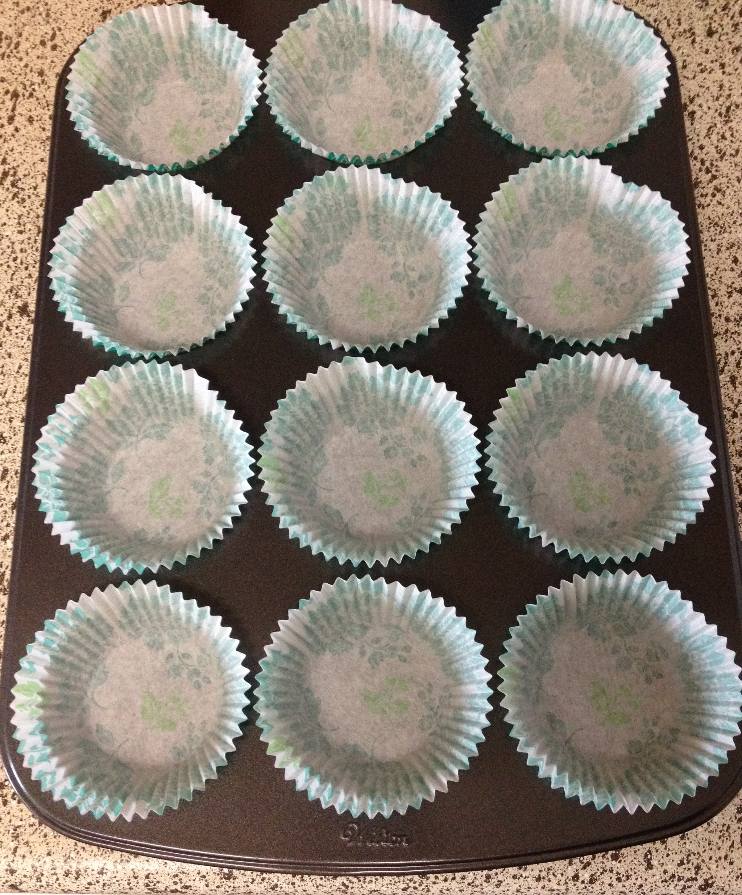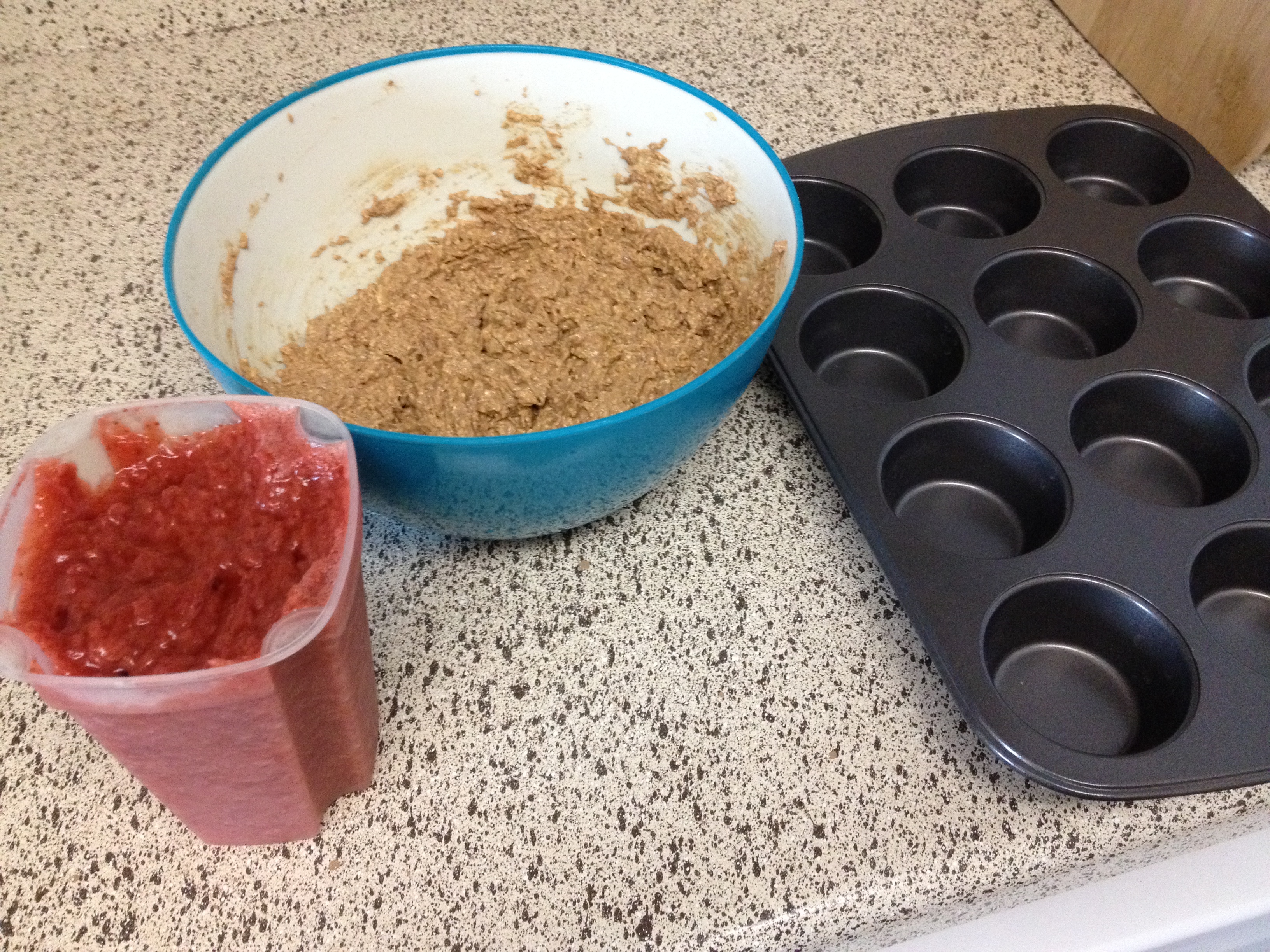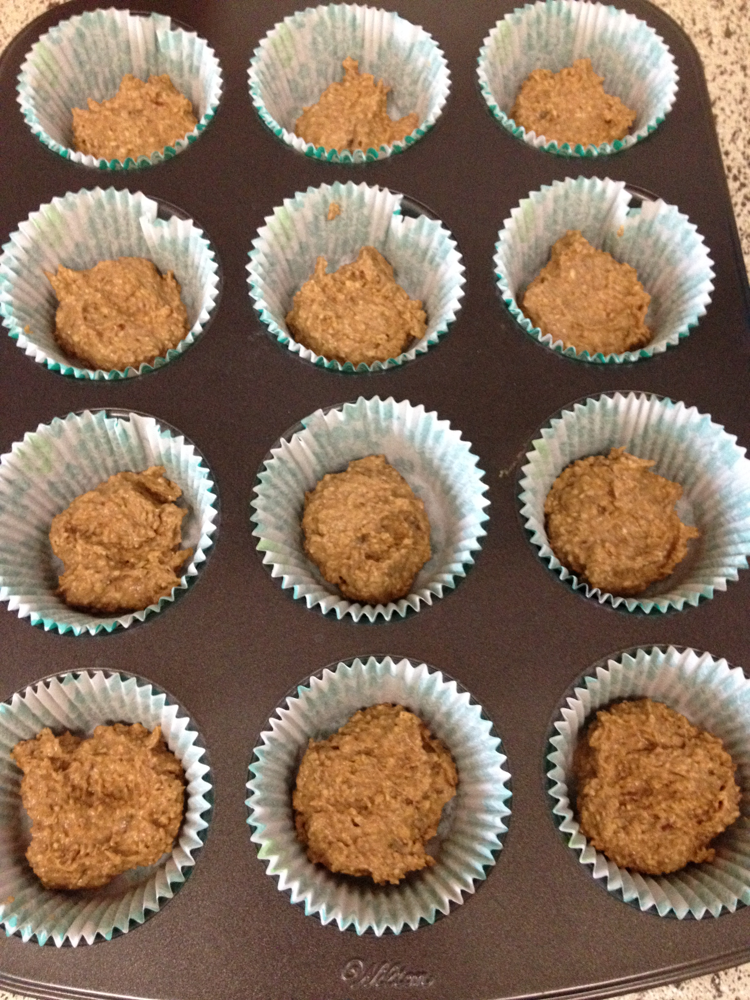 The muffins were just super easing. The dried ingredients all in a smaller bowl and whisked gently together. Everything else but the milk into a larger bowl. I used a cup of the awesome peanut butter and only a 1/4 cup sweetener so the real flavor and any sweetness in the muffins is all from the pb. I used a hand beater to mix the wet ingredients, adding the milk a little at a time. So much easier than trying to just use a spoon to mix these bananas and pb together.