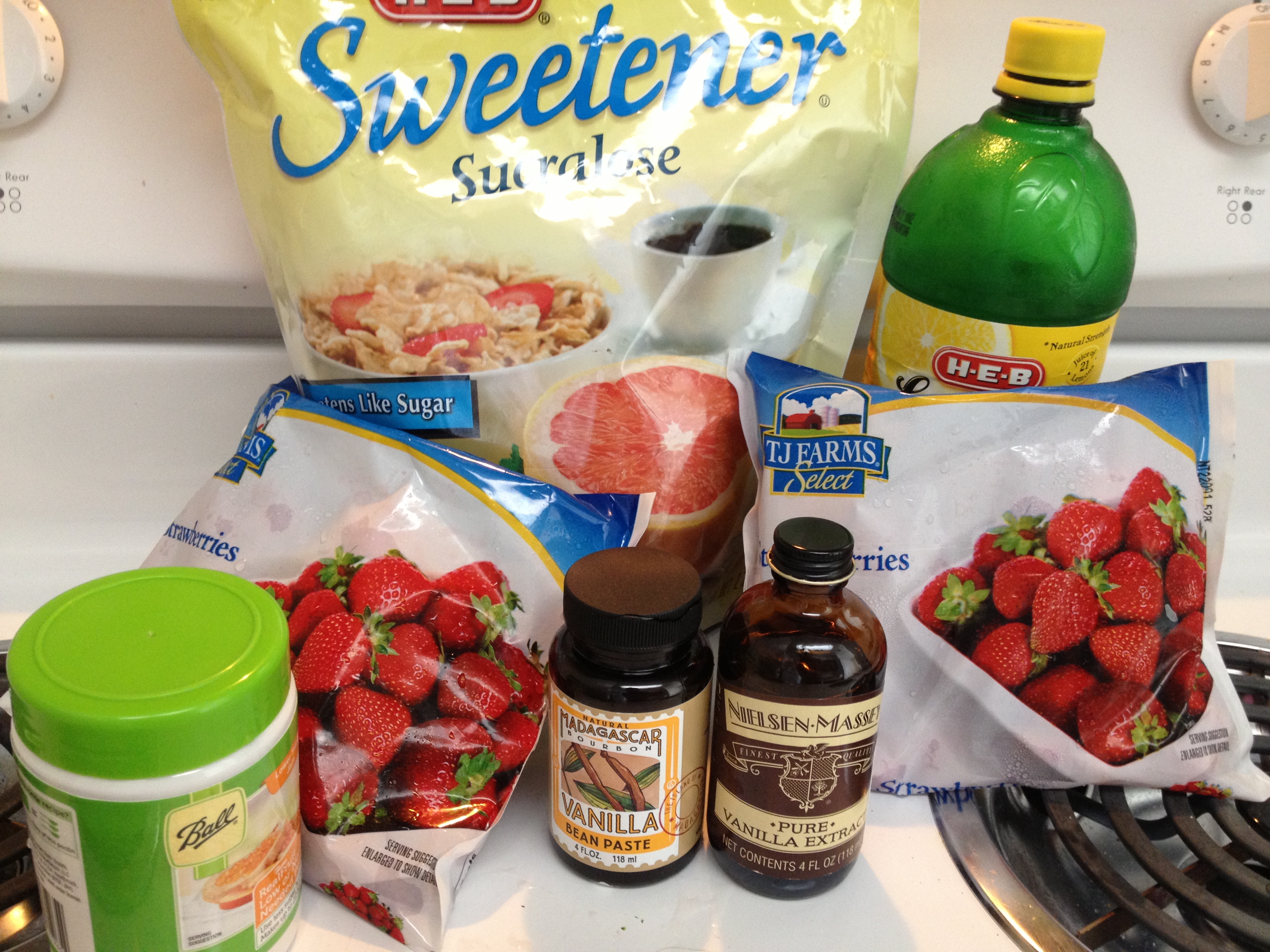 I have come to seriously love jam making! It is so fast, and costs less than buying it in the store. I mean, I buy my frozen fruit at Dollar Tree and I have everything else at home. Vanilla and cinnamon, pectin and no-cal sweetener? Yep, all there at home waiting for another jam foray. This time was all about the strawberries. And it only takes ten minutes total to make, then it goes in my fridge and a few hours later? Yumminess!