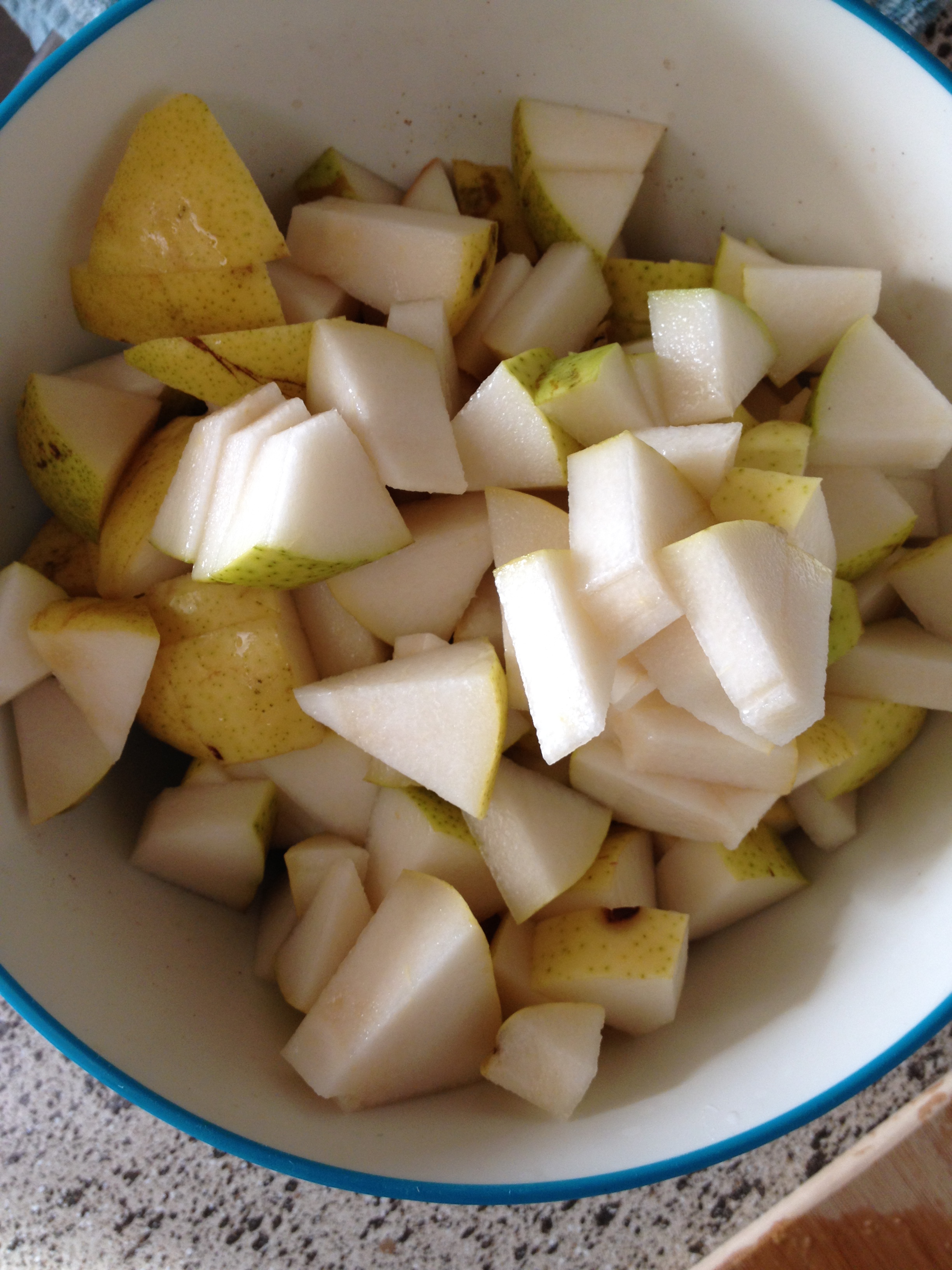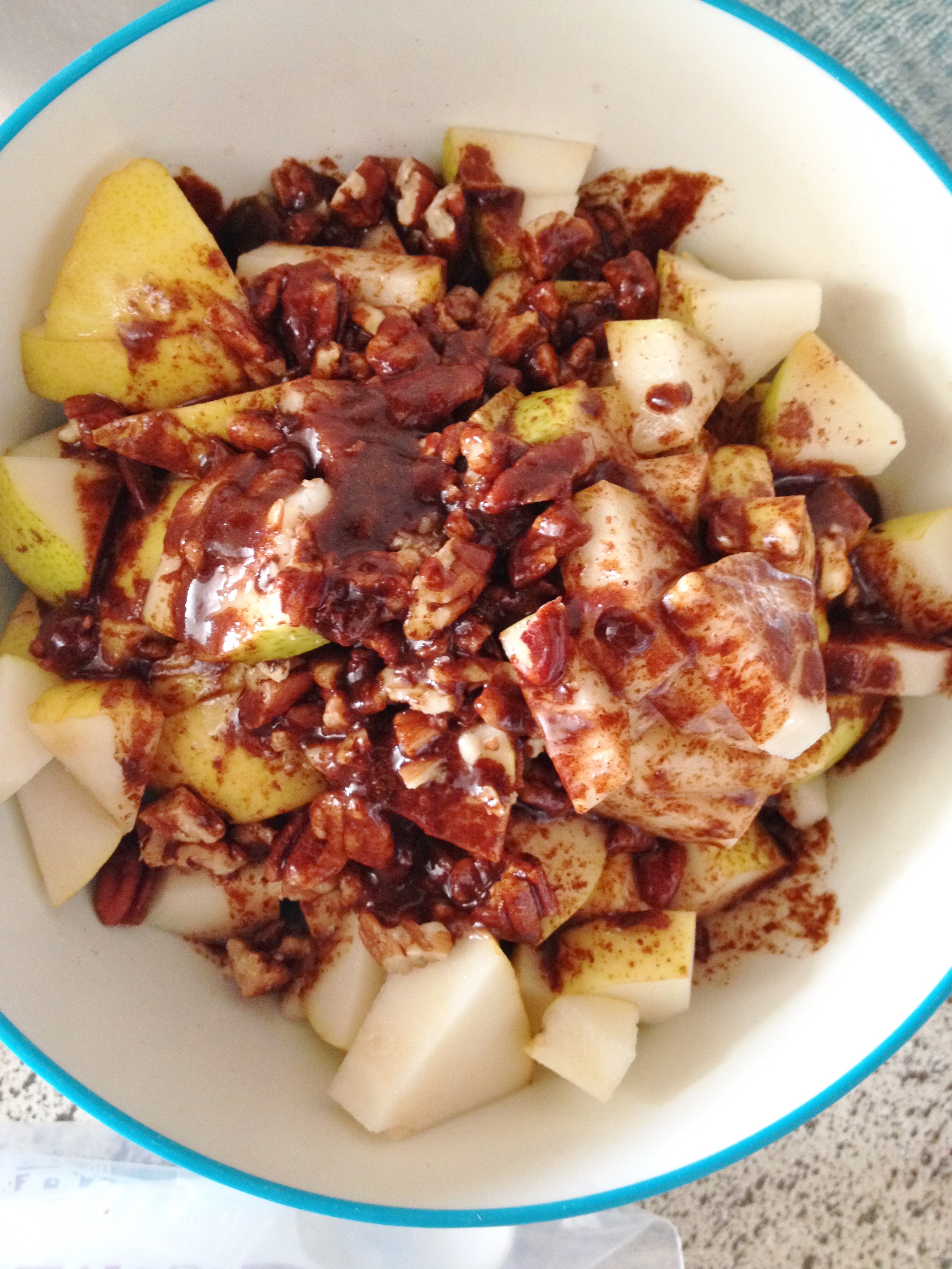 2.  Clean and chop pears and dump in large bowl.  Add chopped pecans.