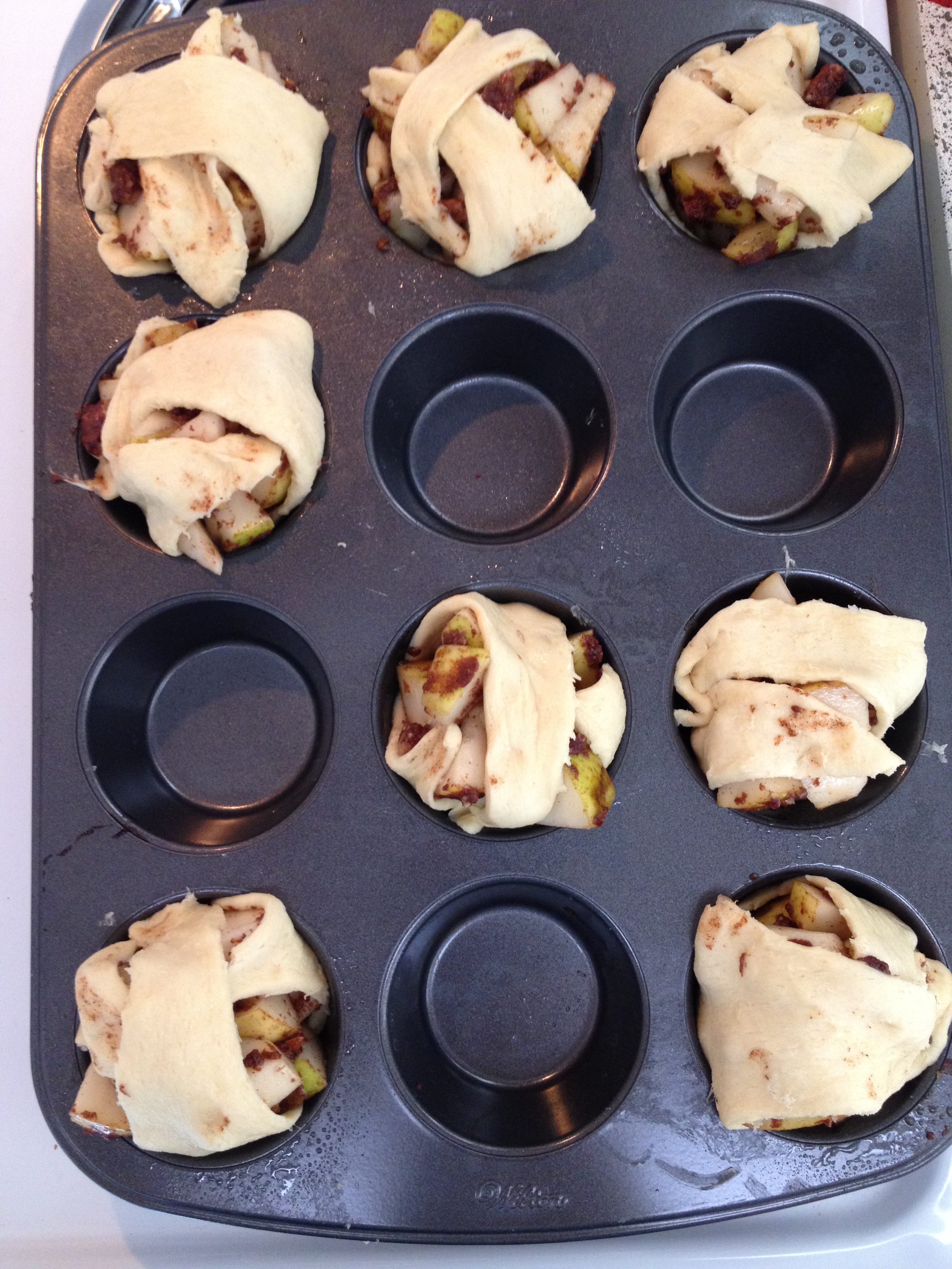 Add the mixture to the pears and stir to cover it all.  Open the crescent rolls and lay out on sprayed muffin tins.  Squish the pear mixture down into each crescent tin.  Fill over the top then lay the roll sides across the tin.  Bake at 350 for 20-23 minutes.  Enjoy these for breakfast, snack or dessert.  These are perfect for anytime of day!