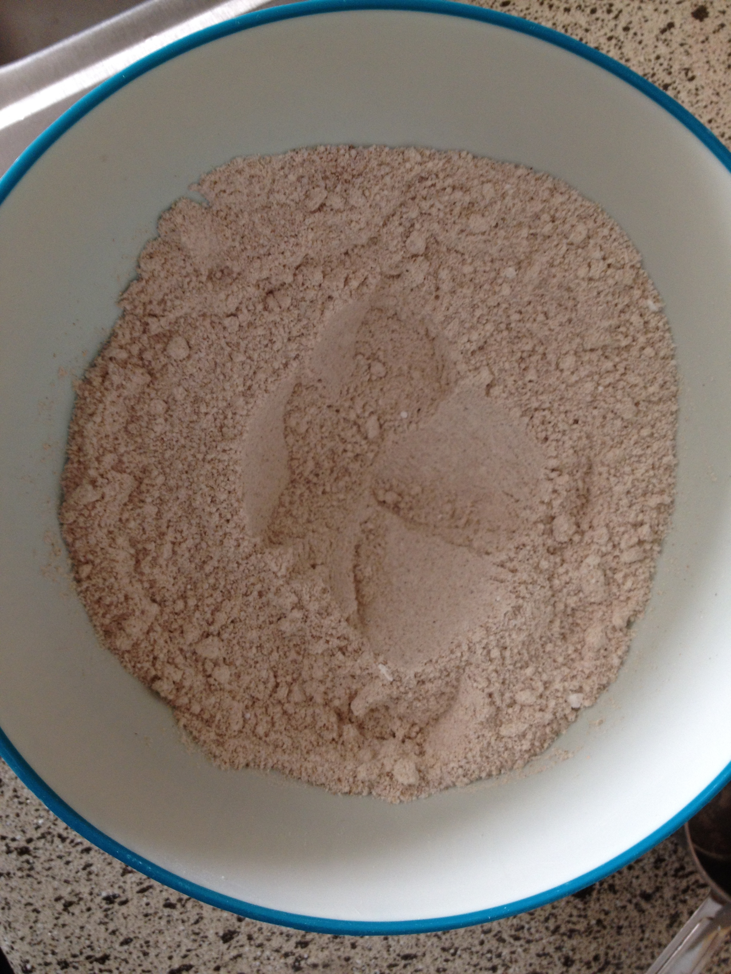 2.  Mix dried ingredients in large mixing bowl.  Make well in dried mix.