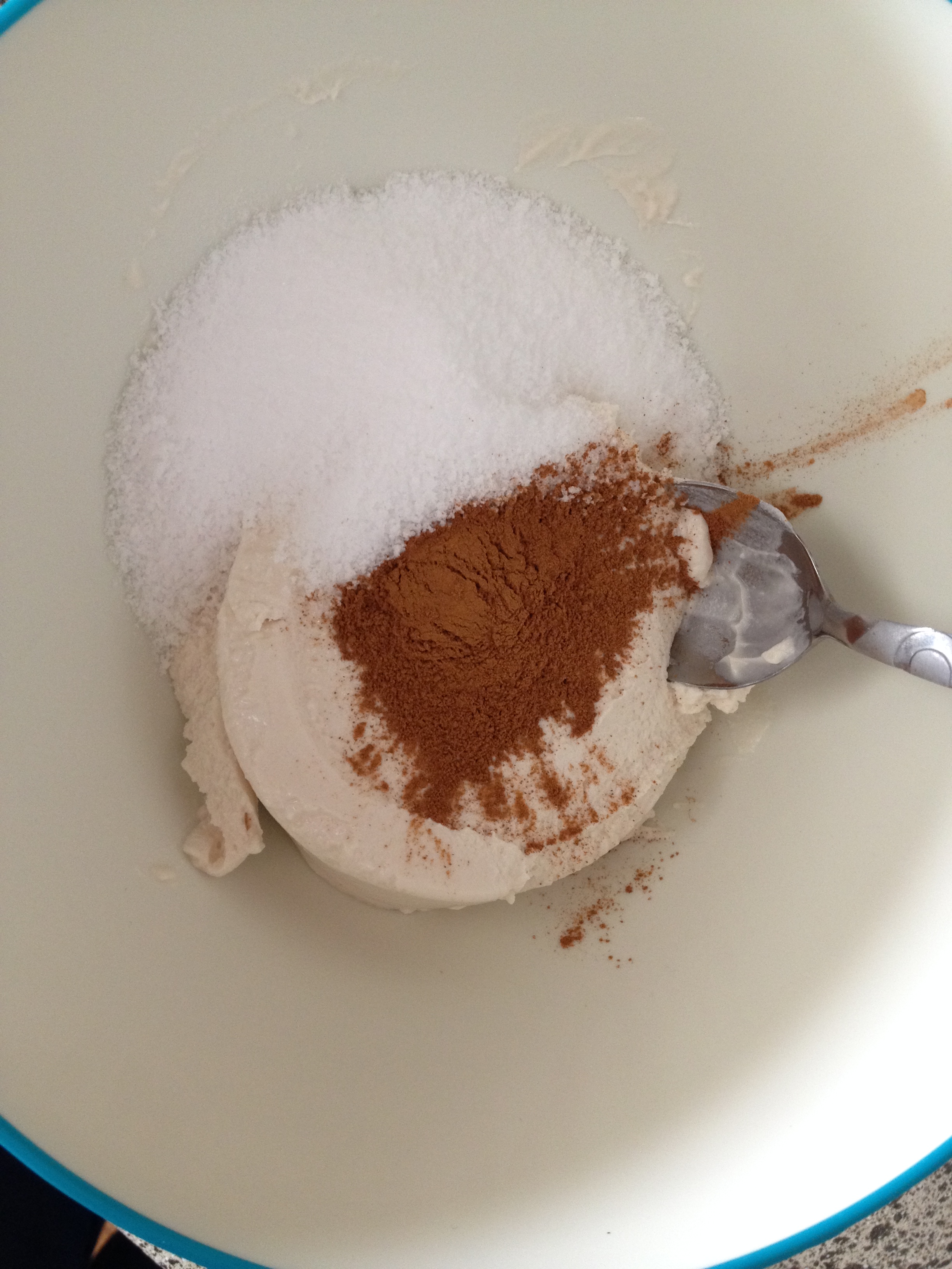 4.  Wash smaller bowl then add cream cheese, 1/2 cup sweetener and cinnamon.  Mix together well.