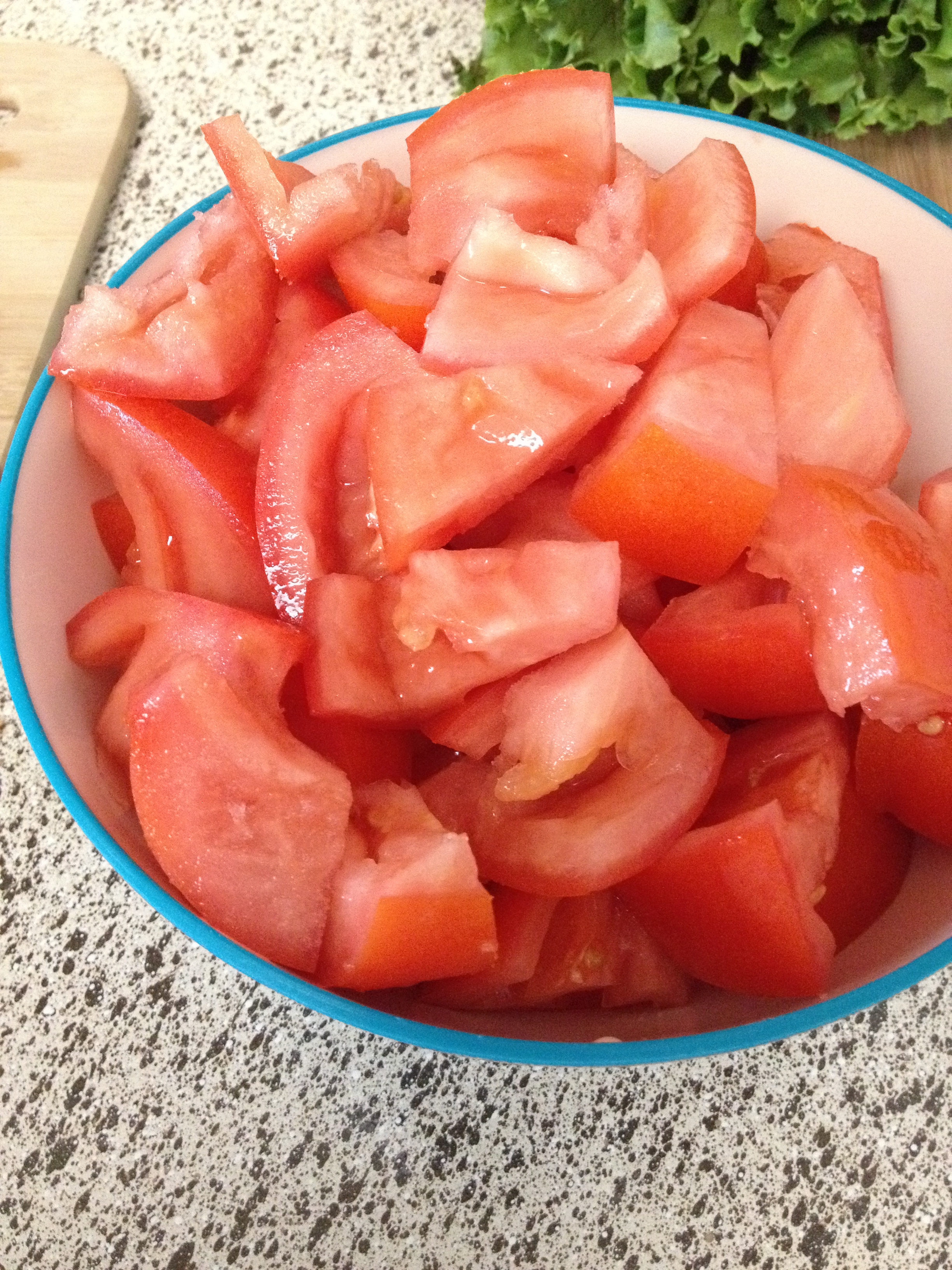 3. Chop tomatoes – be sure to swipe out the tomatoes seeds and juice. Toss de-seeded tomatoes into the bowl.
