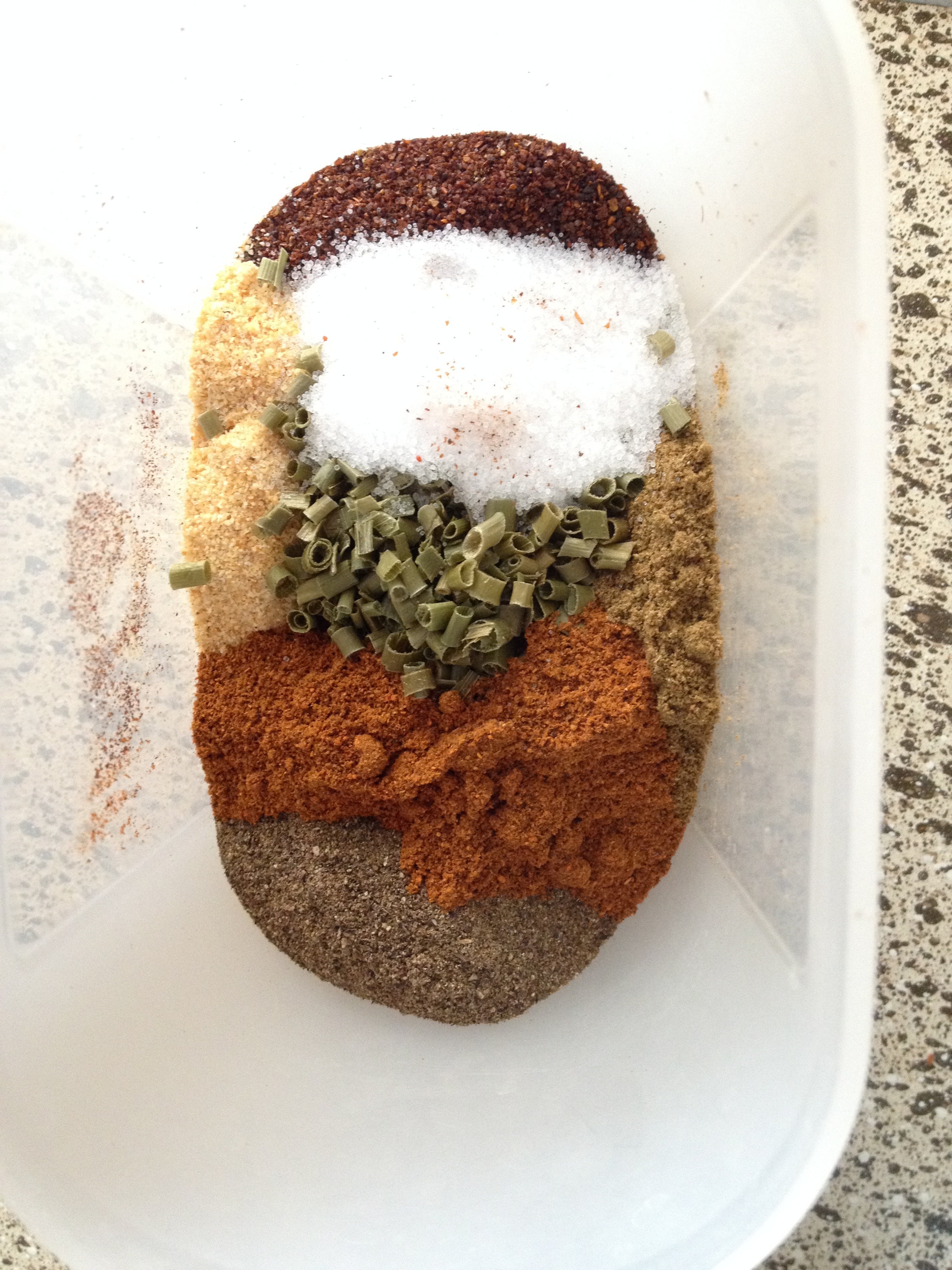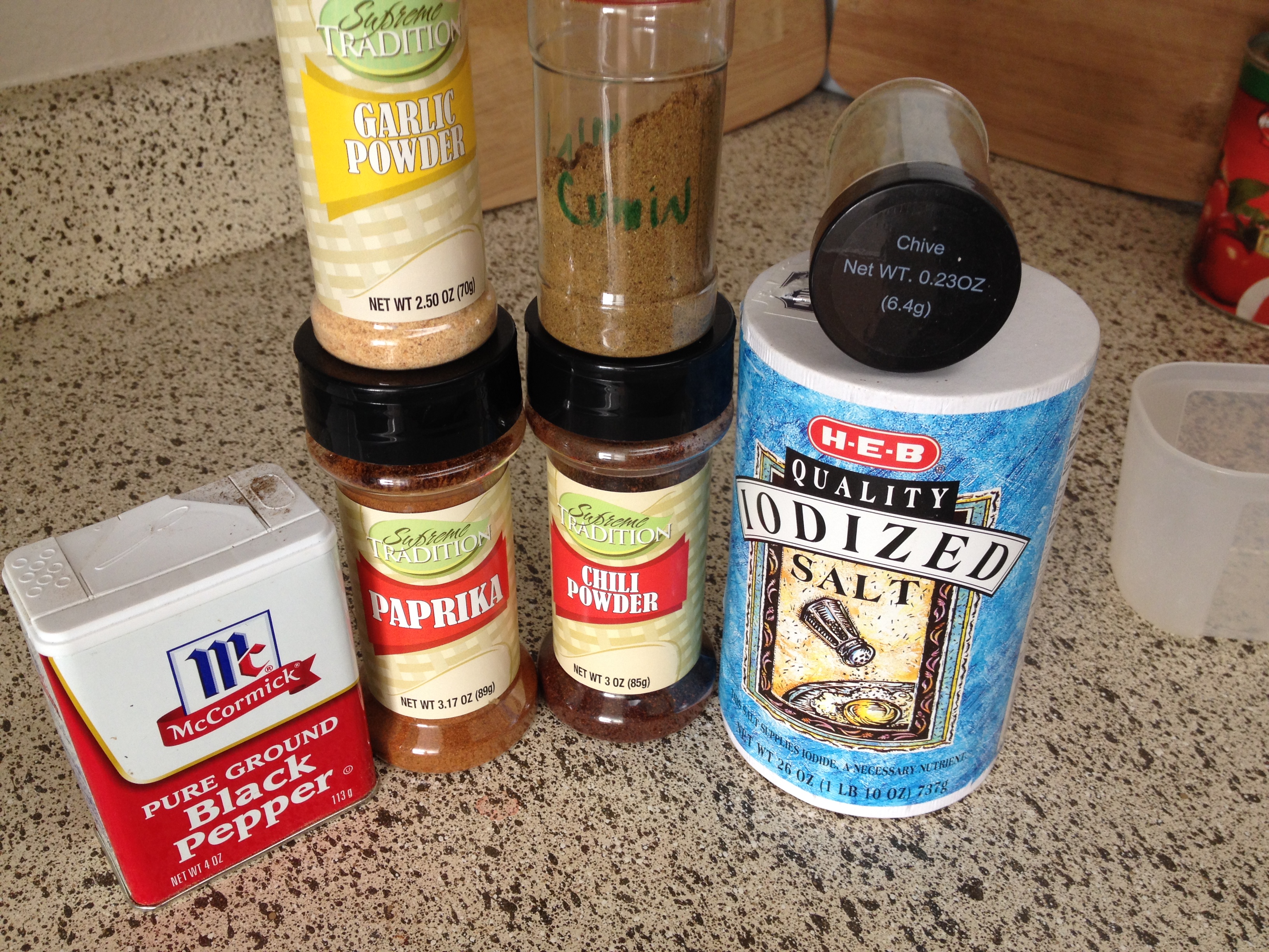 The first thing I did was look at the container of fajita seasoning I had in the cupboard to see what was all in it…and then I decided I needed to make my own because there was some things in it I couldn’t sound out and should not have been in a spice jar! So I went asearching and found a few recipes for homemade fajita seasoning but each had different ingredients so I picked and chose the ones I wanted. My recipe is below. I used the entire mix for my veggies, but you can put this in an old spice container for easy use again.