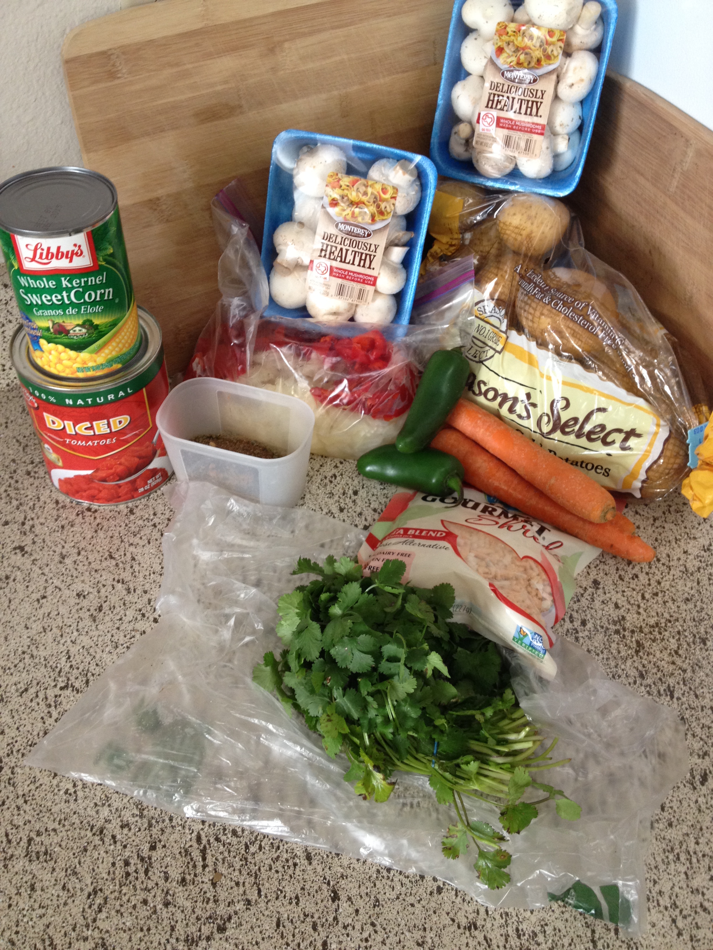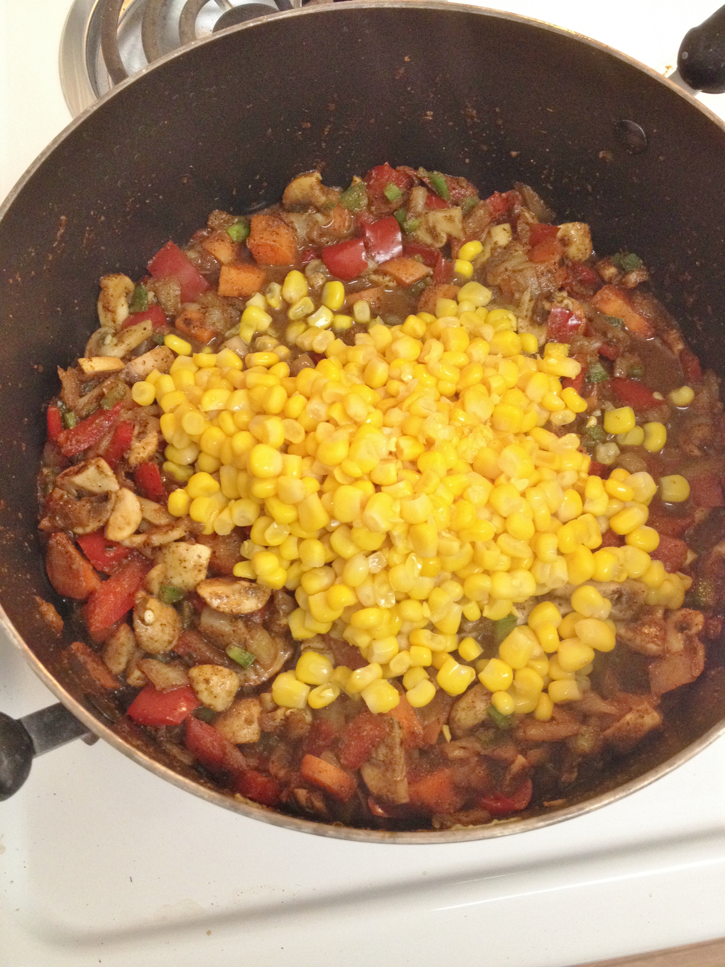 2. Chop mushrooms and Jalapeños and add to pot. Add corn and tomato sauce.