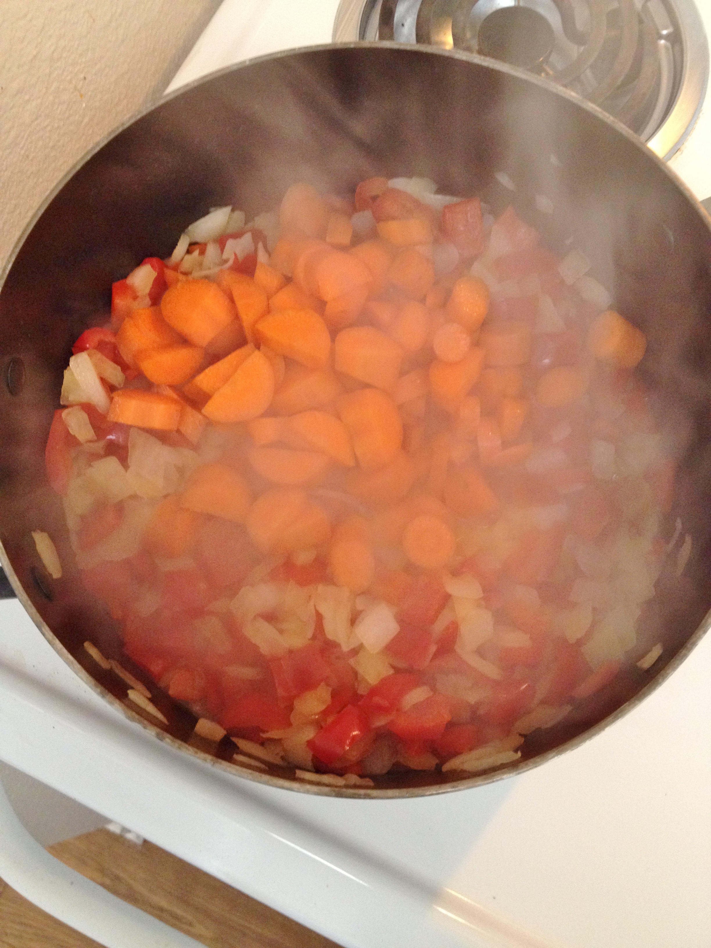 1. Chop onions, peppers and carrots and add to large pot. Sauté with Fajita seasoning.