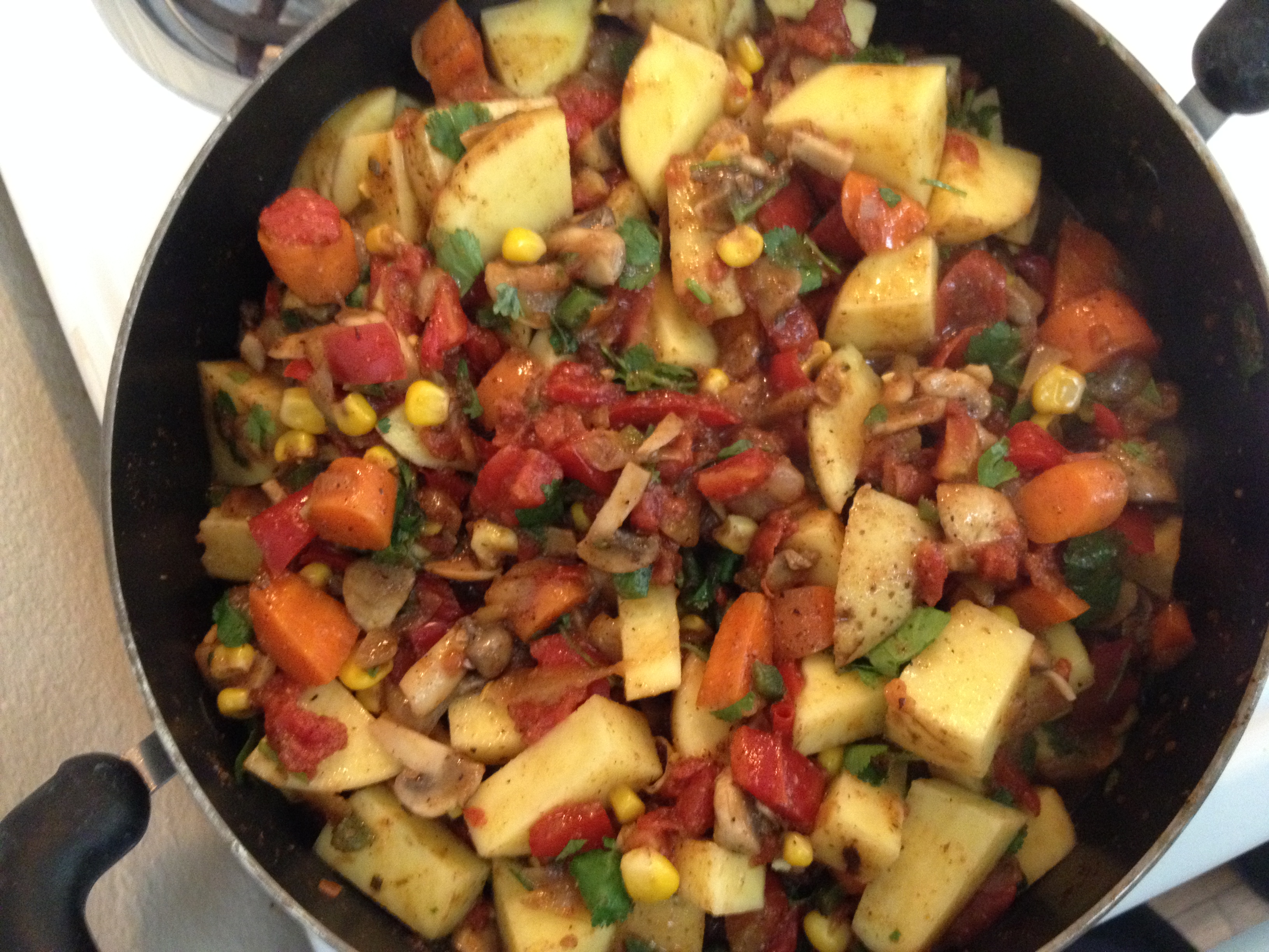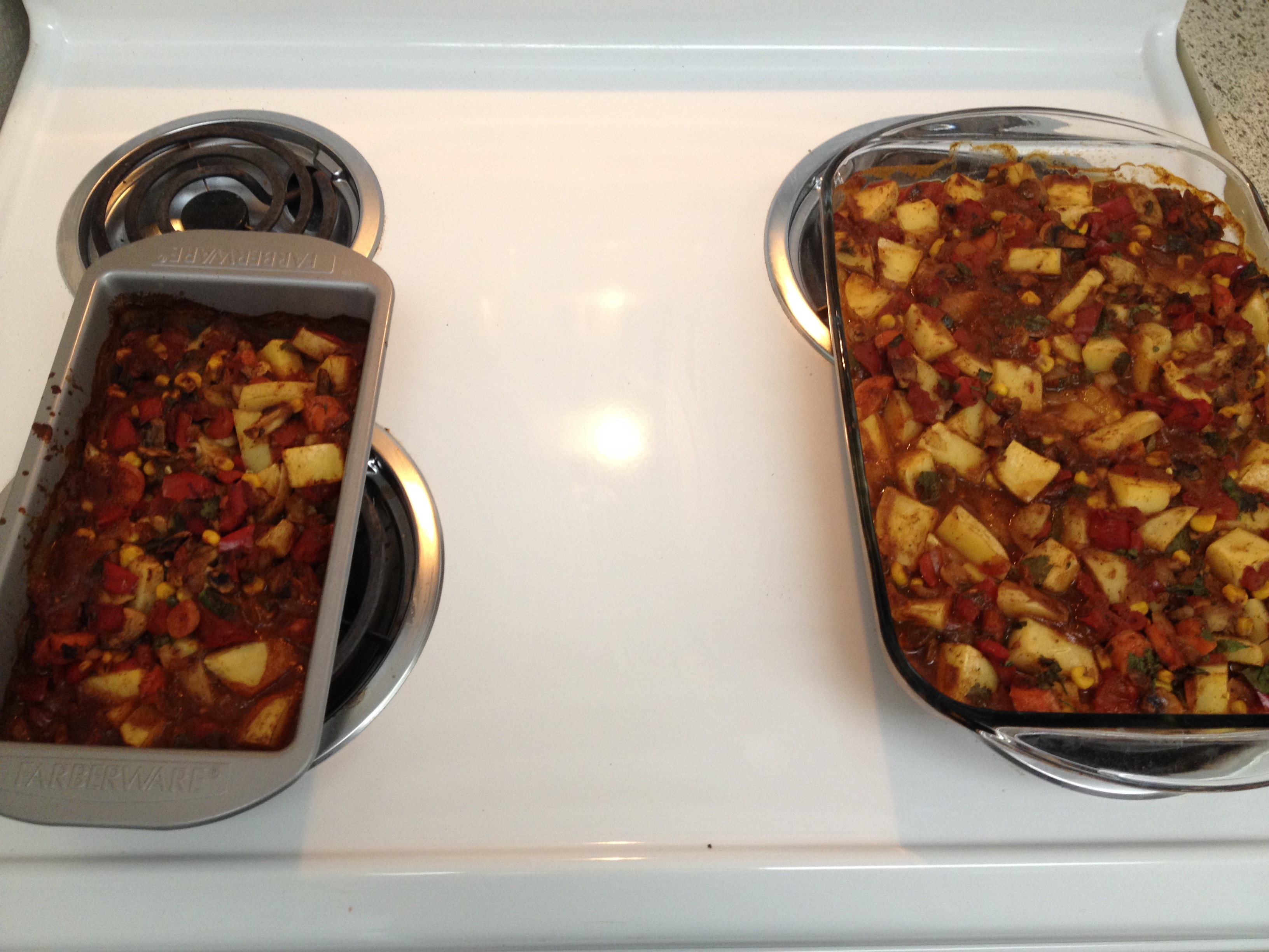 I chose the ever-present onion and pepper then of course had to add mushrooms…I can’t have a meal without them. I just can’t. Then I added carrots for sweetness and added canned corn because it goes well in casseroles and minced up a couple of jalapeños. Add the potatoes and yum! Some cheese topping and bake. This was awesome and spicy and so good. A perfect fall night casserole with a twist.