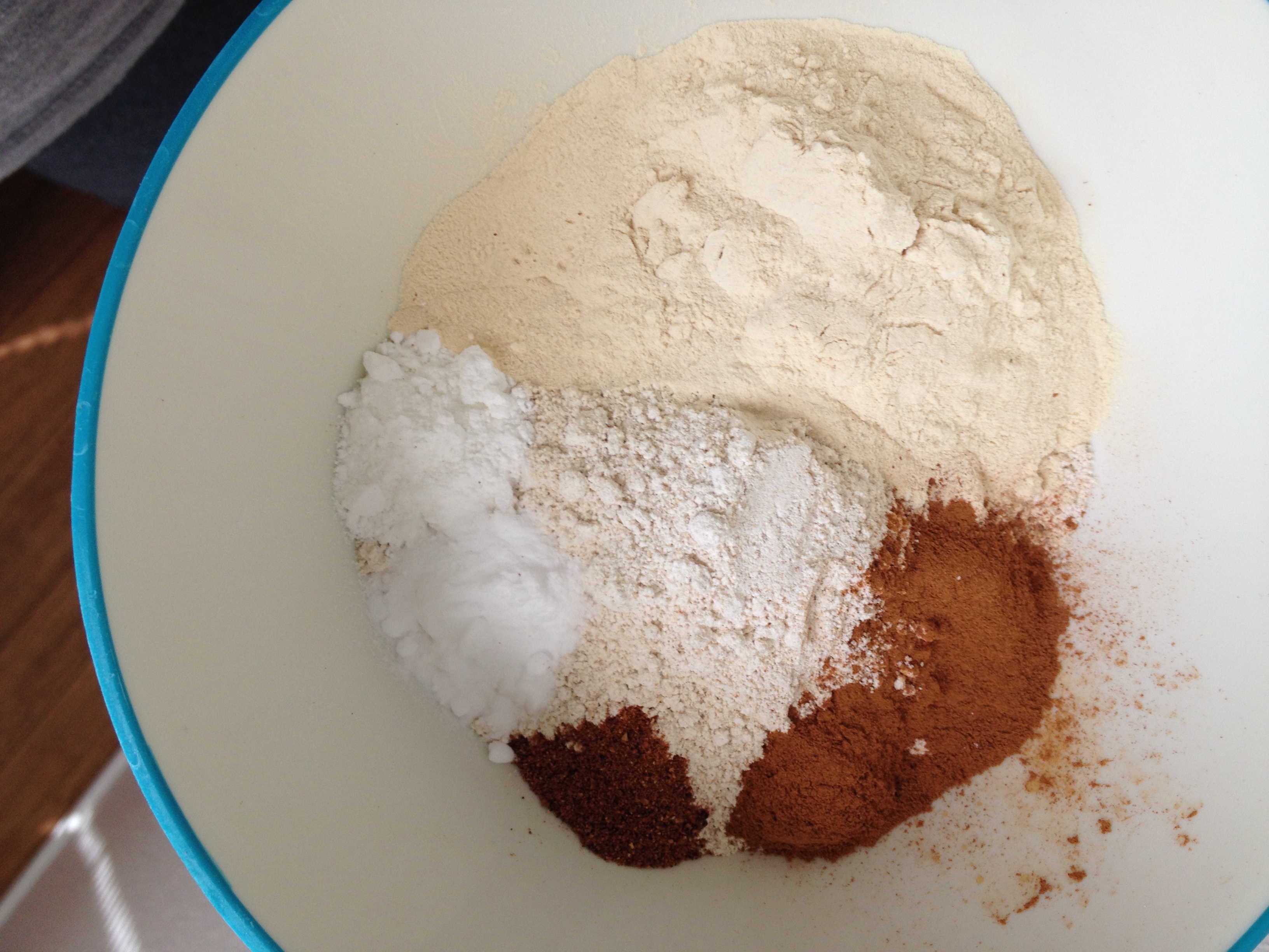 2. Mix flour through nutmeg in medium size bowl. Make a well in the center of dry ingredients.